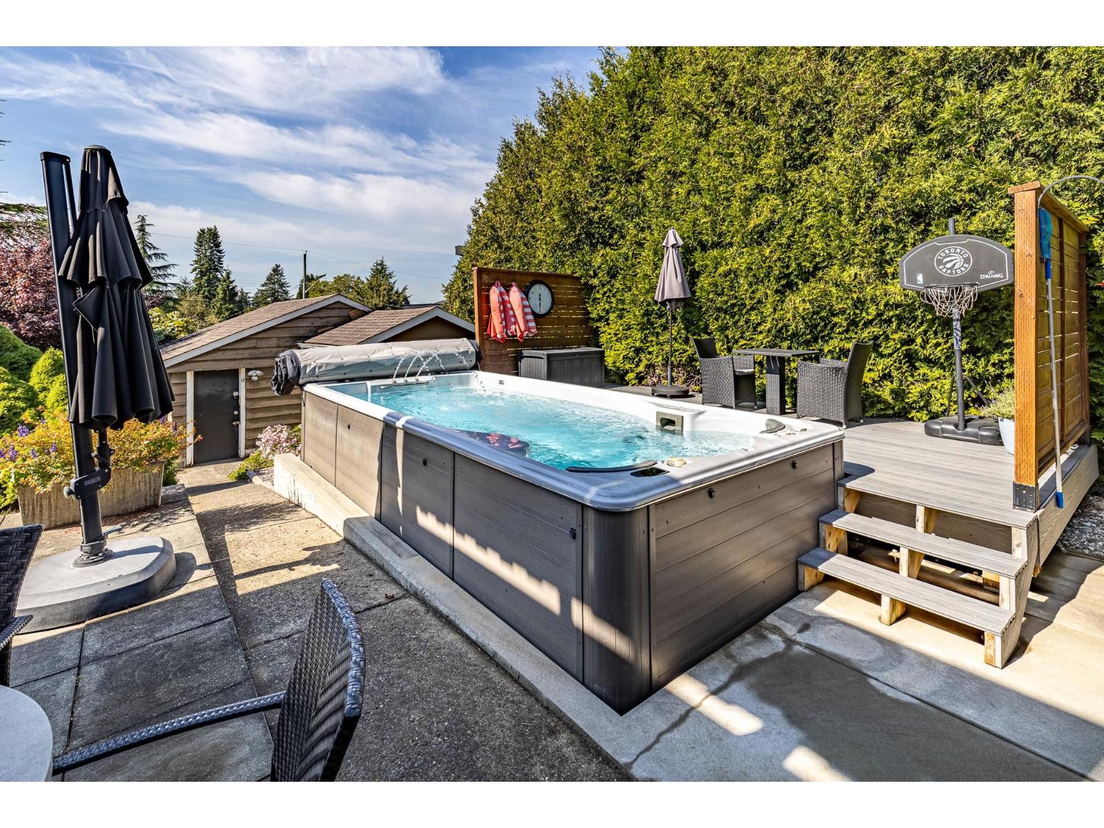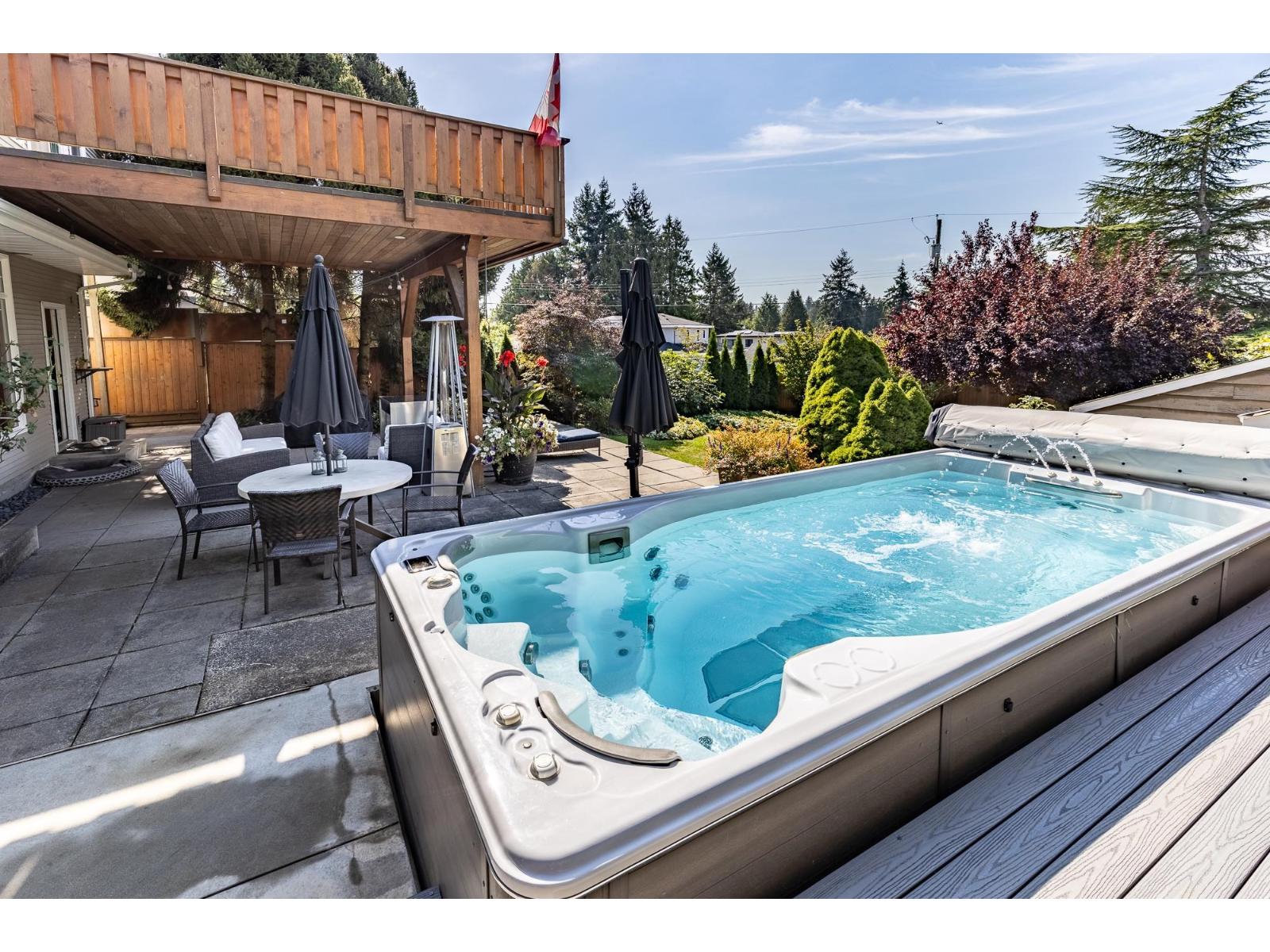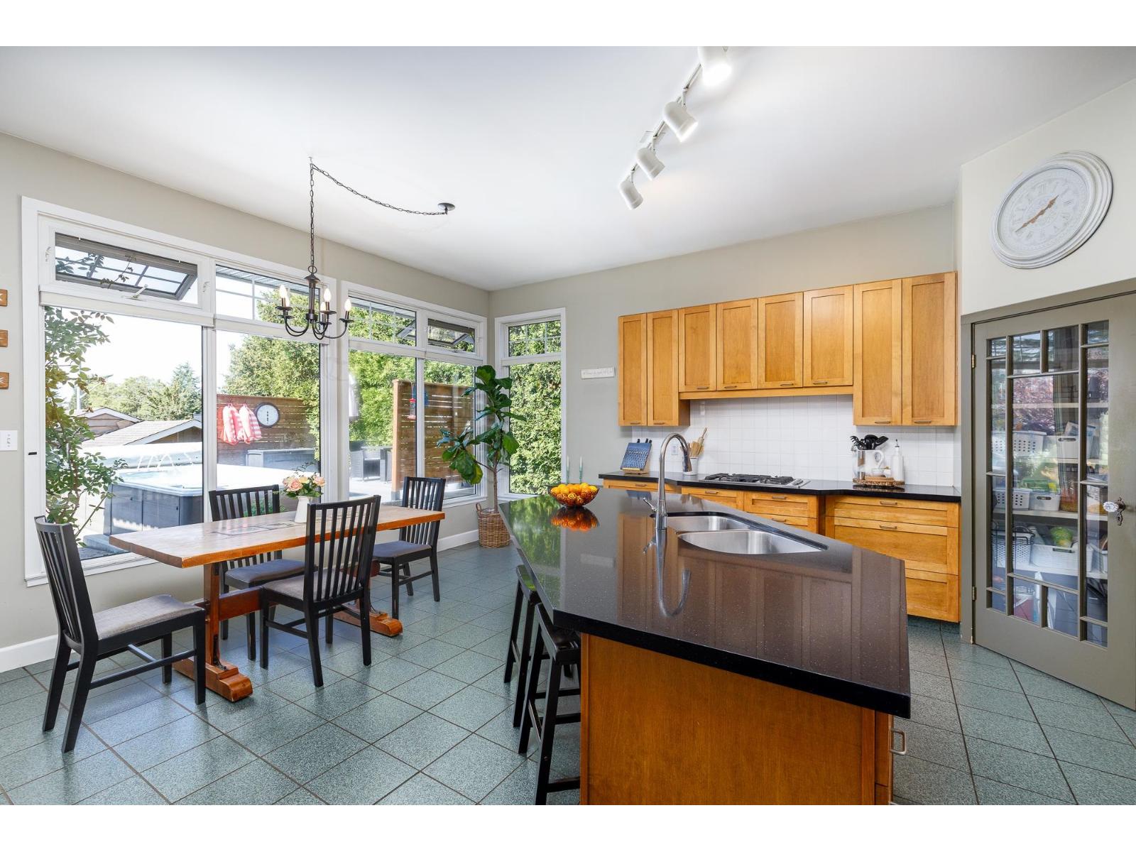 Unique and pristine, this Cedar Hills family home offers four spacious bedrooms plus a den and four baths on a generous 9,800 sq. ft. lot with front and rear road access. Enjoy a private backyard oasis with a pool, lush gardens, detached double garage, and RV parking. Inside, the maple kitchen features an island, walk-in pantry, gas oven, and cooktop. Gleaming hardwood floors, designer paint, and a decadent bath with an old-fashioned soaker tub add charm. Downstairs includes a bedroom, den, and open living area with tall windows overlooking the yard. Conveniently located close to SkyTrain, parks, and schools! (id:52823)