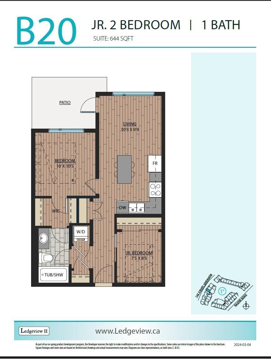Ledgeview Two - Assignment of Contract Jr. 2 bedroom, 1 bath Ground-Floor unit with a smart 640 sq.ft. layout. Stylish laminate & tile flooring throughout. Steps to shopping, transit & SkyTrain for unbeatable convenience. Perfect for first-time buyers, investors, or downsizers. Estimated completion: Dec 2026. Don't miss this chance to own at Ledgeview Two! (id:52823)