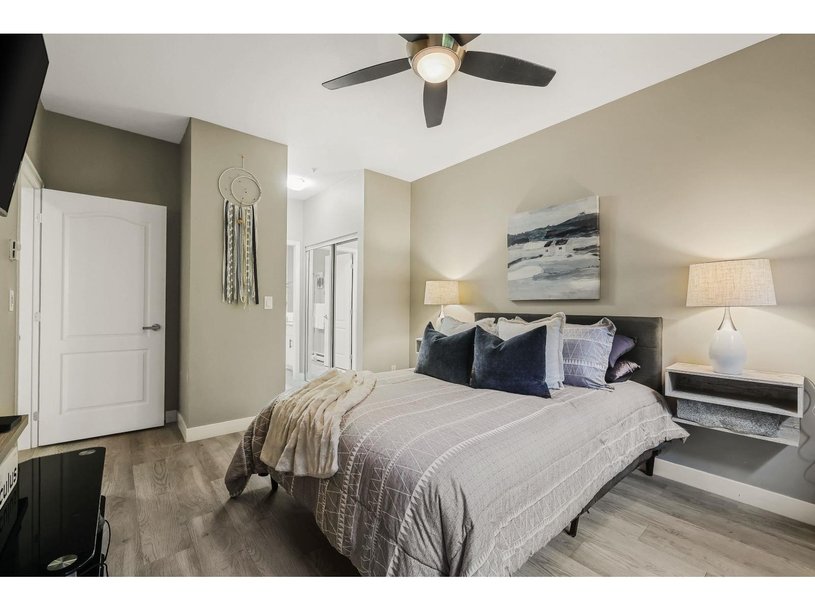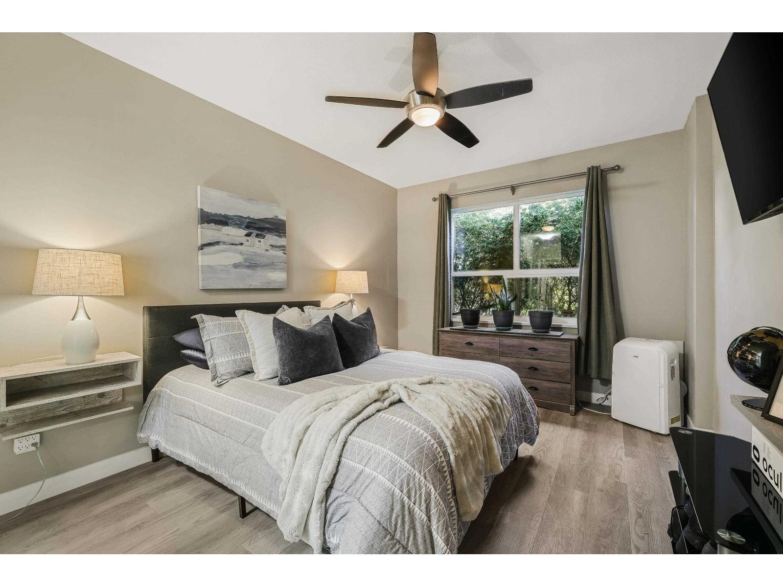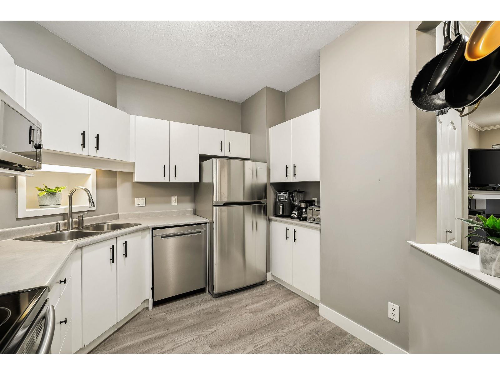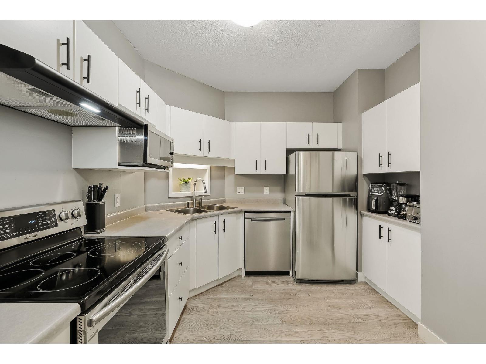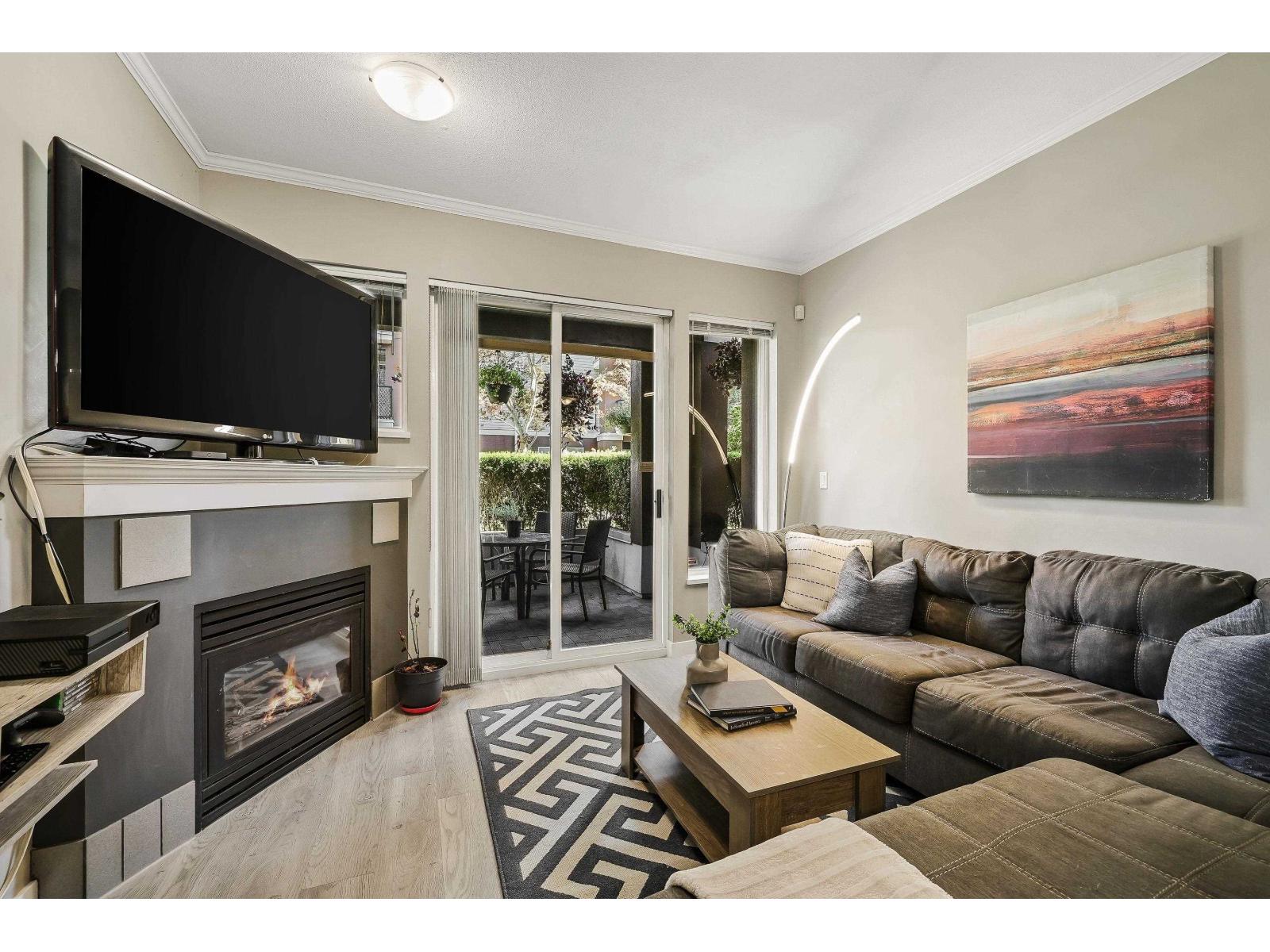 $599.32 MonthlyCORNER, GROUND Floor unit in sought-after City Grande! This 2Bdrm/2Bth is beautifully updated with wide-plank floors throughout PLUS new SS appliances in your bright kitchen w/double-sinks + ample storage. The generous Primary offers plenty of closet space + your private 3-pce Ensuite. Enjoy the abundant natural light, a cozy gas fireplace & private covered deck perfect for relaxing or entertaining. Convenient in-suite laundry space provides extra storage. Close to shops, cafes, near Lynnwood Park & upcoming SkyTrain. Well-maintained complex w/amenities that include Exercise, Billiards & Rec rooms. Secure underground parking + storage locker. This condo is move-in ready! (id:52823)