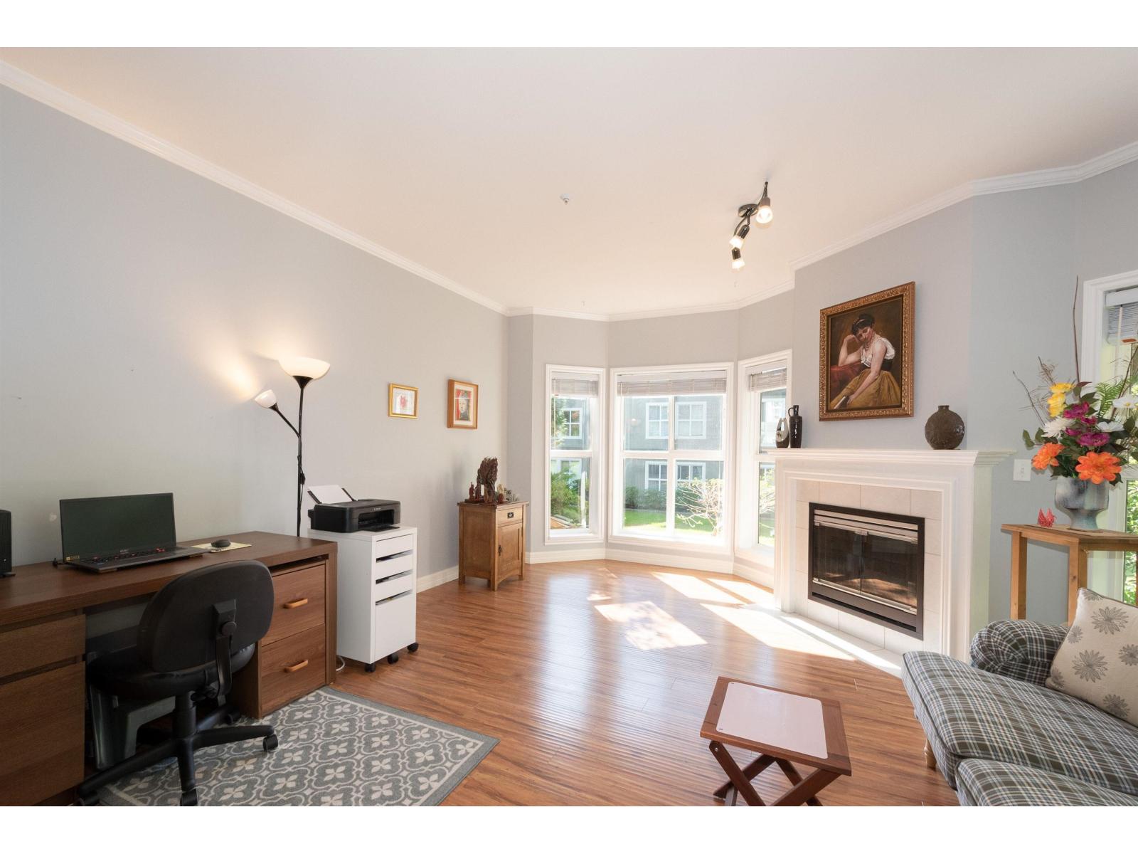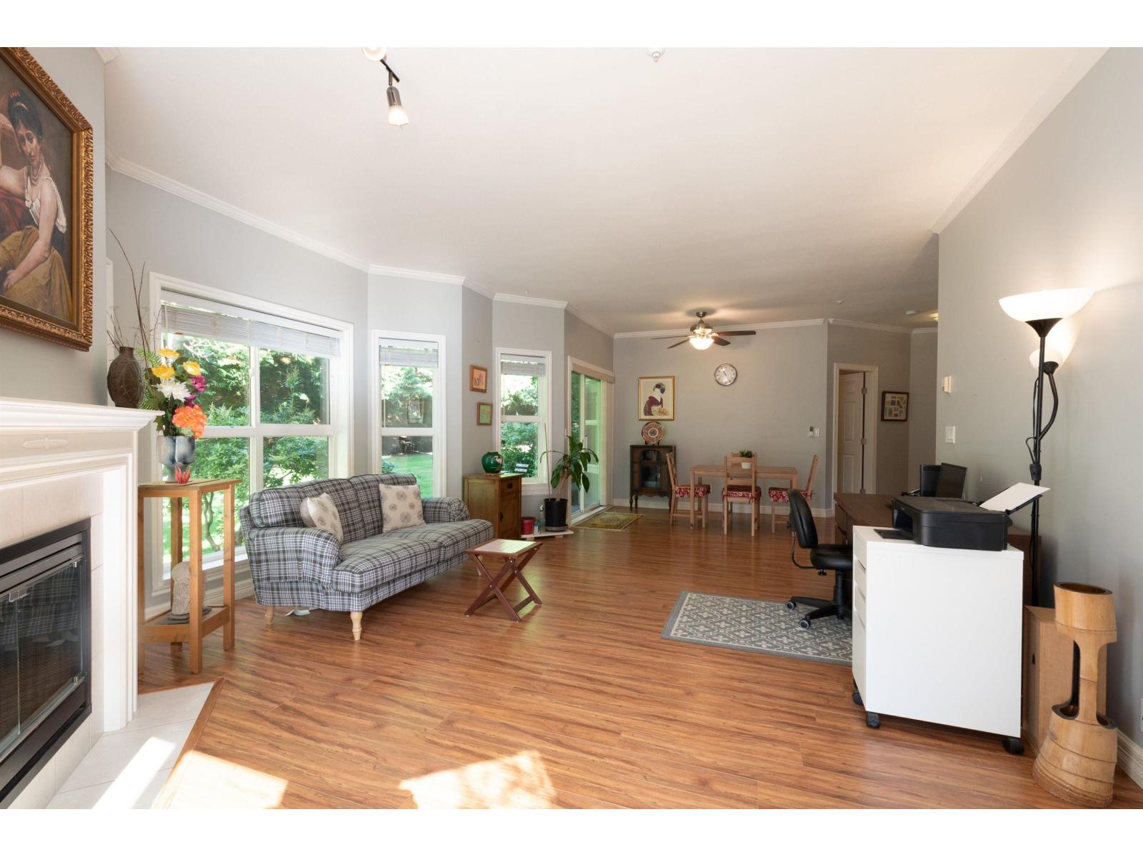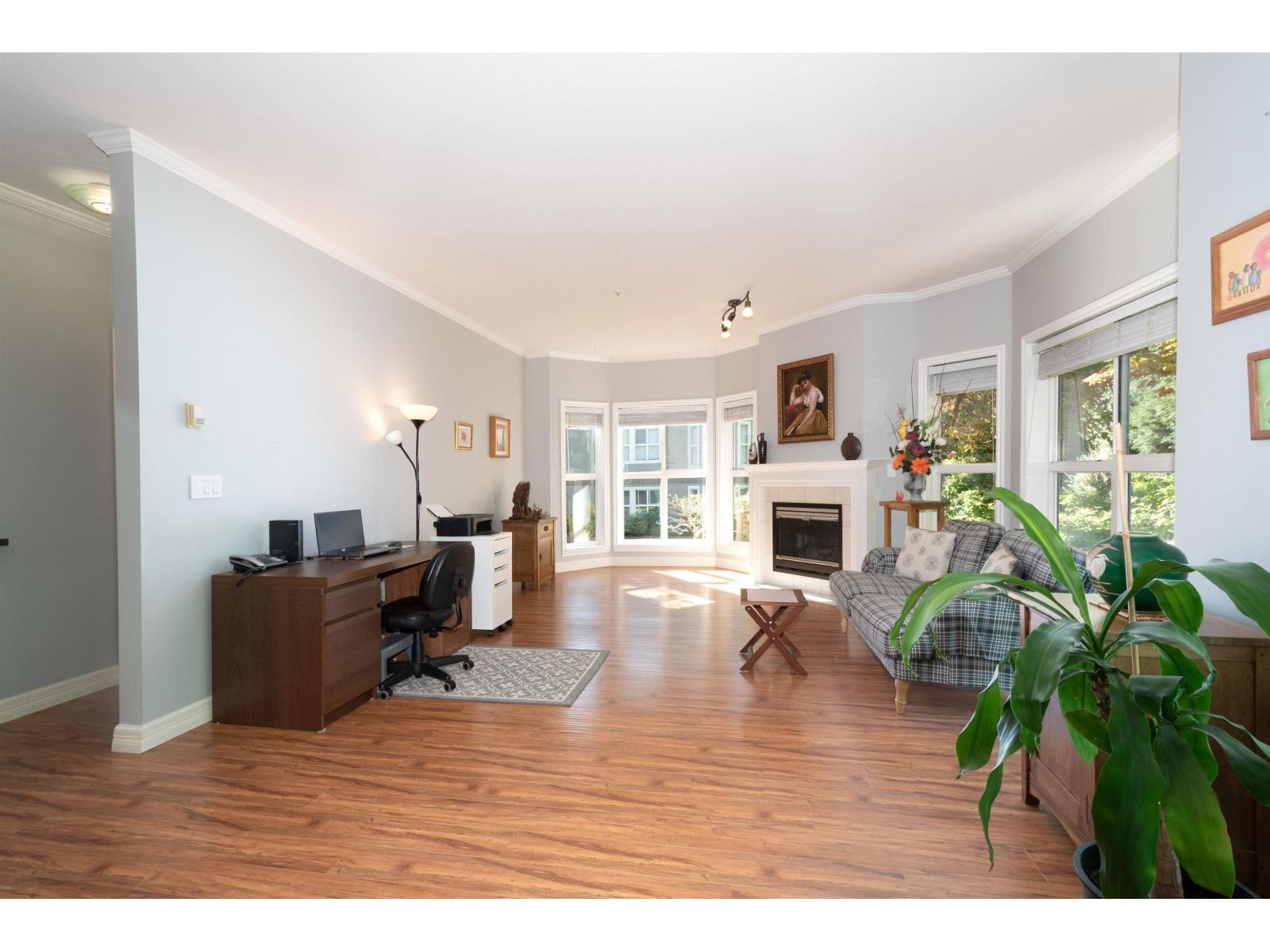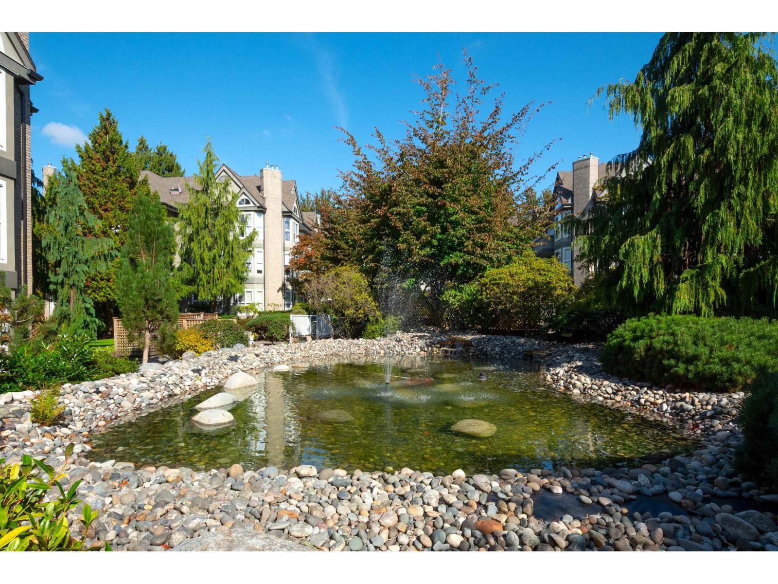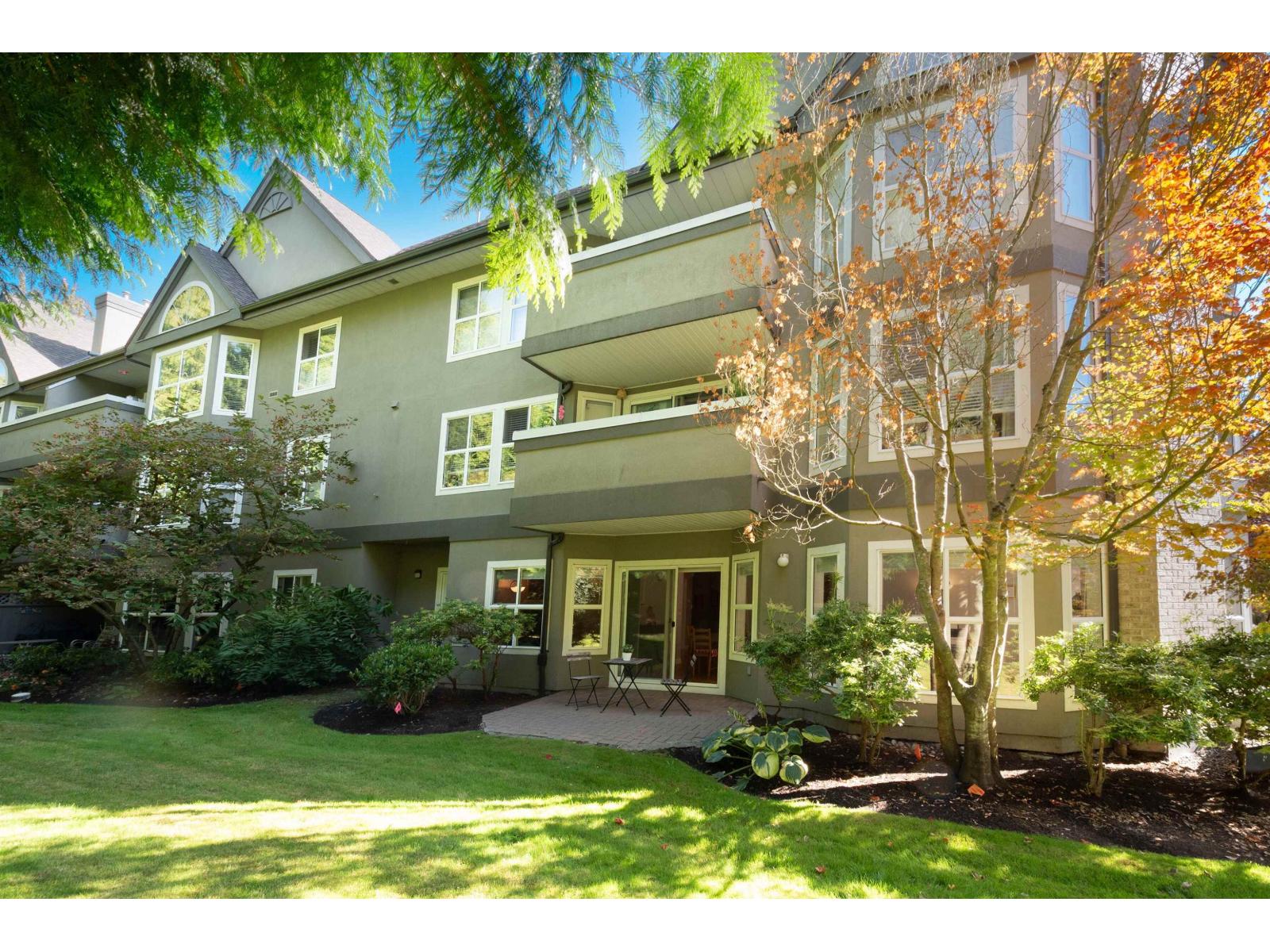 $607.01 MonthlyBest corner location in Lakewood Terrance. Quiet S.W facing ground-floor home offers extra large floor plan with 9-ft high-ceilings, two sides of bay windows in LV, filling space with natural light. Enjoy cozy patio that opens directly onto a lush greenbelt. Beautifully updated throughout with quality laminate flooring & crown moldings. Modern kitchen features shaker cabinets, S/S appliances, and stylish titled back splash. In-floor radiant heating and gas fireplace are both included in maintenance fees. Very well maintained complex with newer roof. Amenity room with lounge space, pool table, and kids play area. Beautifully landscaped gardens with a stream and fountain. 2 parking & 1 locker. 1 pet allowed. Perfect unit for downsizing and small family. Showing by appointment only. (id:52823)