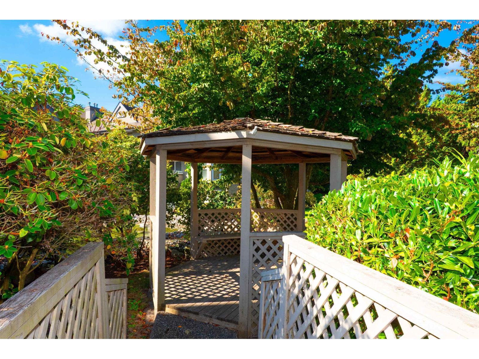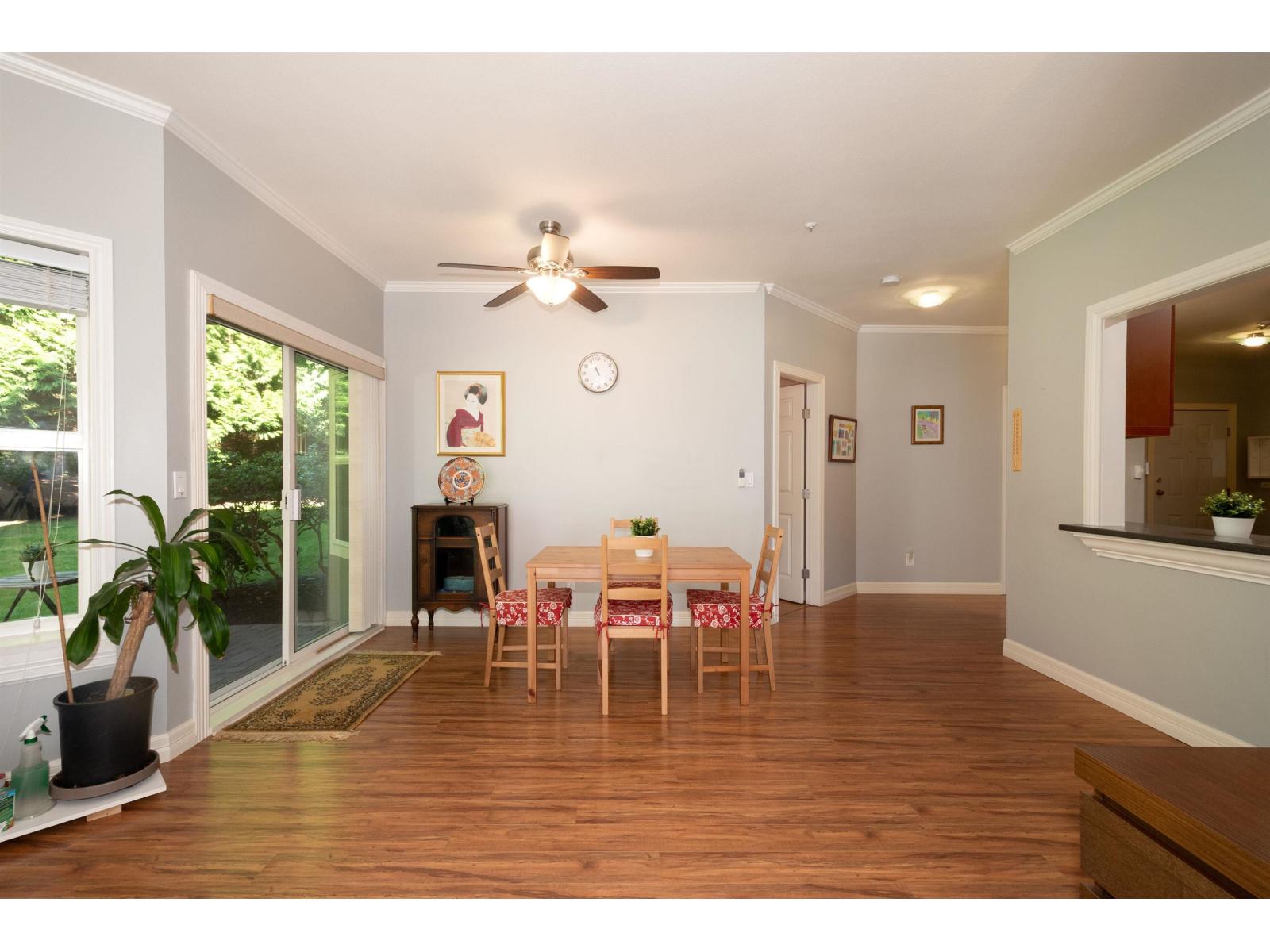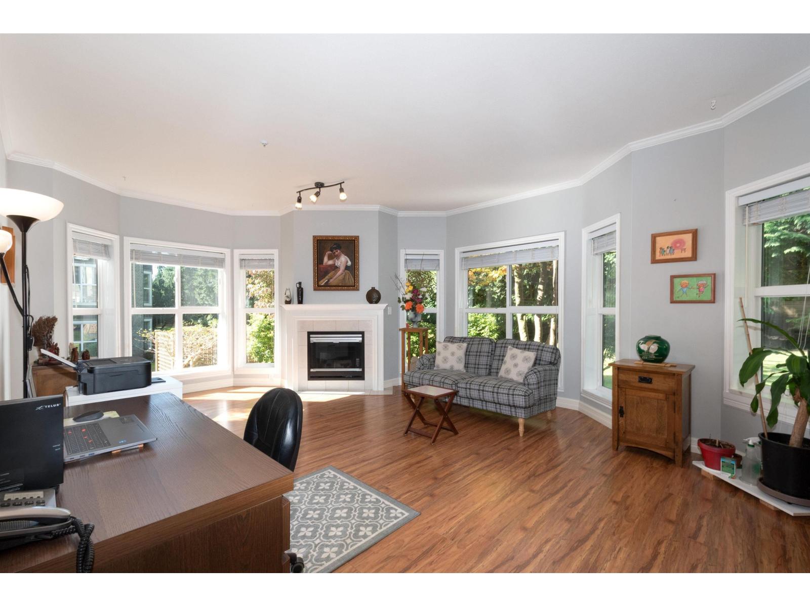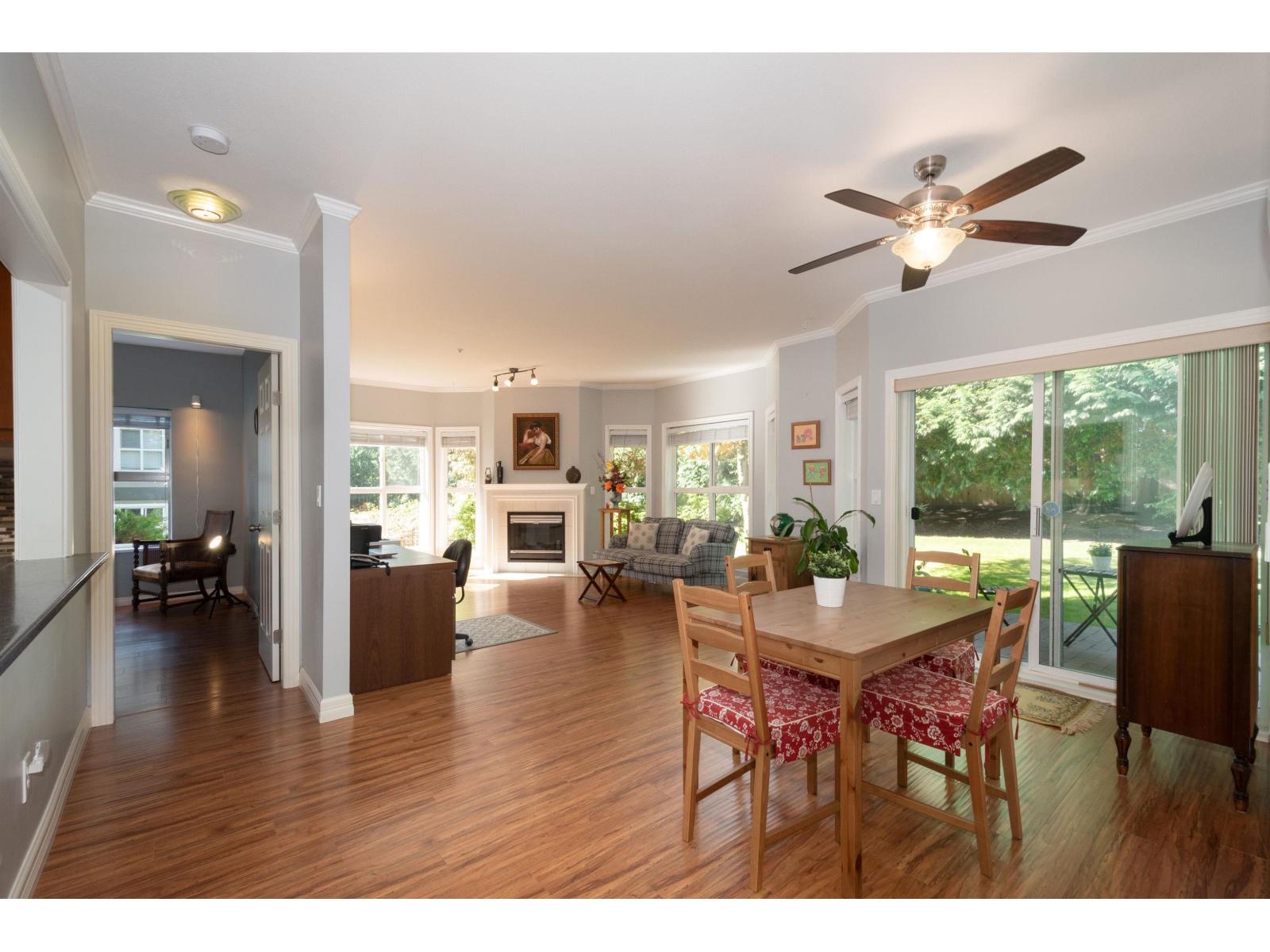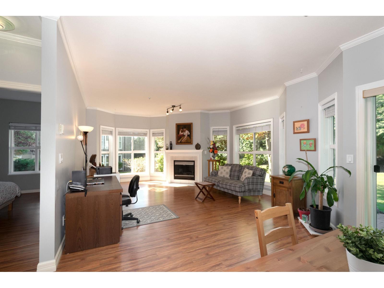 $607.01 MonthlyBest corner location in Lakewood Terrance. Quiet S.W facing ground-floor home offers extra large floor plan with 9-ft high-ceilings, two sides of bay windows in LV, filling space with natural light. Enjoy cozy patio that opens directly onto a lush greenbelt. Beautifully updated throughout with quality laminate flooring & crown moldings. Modern kitchen features shaker cabinets, S/S appliances, and stylish titled back splash. In-floor radiant heating and gas fireplace are both included in maintenance fees. Very well maintained complex with newer roof. Amenity room with lounge space, pool table, and kids play area. Beautifully landscaped gardens with a stream and fountain. 2 parking & 1 locker. 1 pet allowed. Perfect unit for downsizing and small family. Showing by appointment only. (id:52823)
