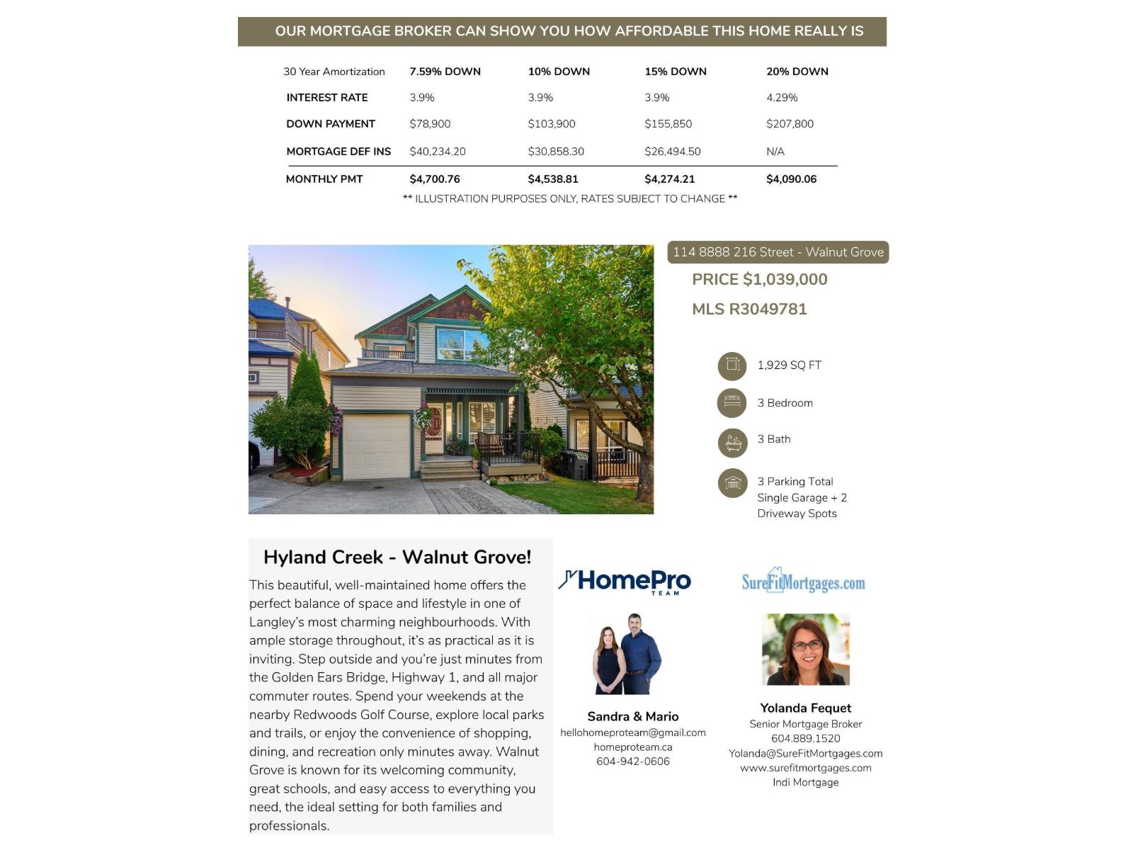 $41 MonthlyWelcome to Hyland Creek in Walnut Grove! This 1,929 sq.ft. home offers the perfect balance of space and lifestyle in one of Langley's most charming neighbourhoods. With ample storage throughout, it's as practical as it is inviting. Step outside and you're just minutes from the Golden Ears Bridge, Highway 1, and all major commuter routes. Spend your weekends at the nearby Redwoods Golf Course, explore local parks and trails, or enjoy the convenience of shopping, dining, and recreation only minutes away. Walnut Grove is known for its welcoming community, great schools, and easy access to everything you need, the ideal setting for both families and professionals. Ask us how our mortgage broker can show you how affordable this home can be. Open House Saturday October 4th 1-3PM. (id:52823)