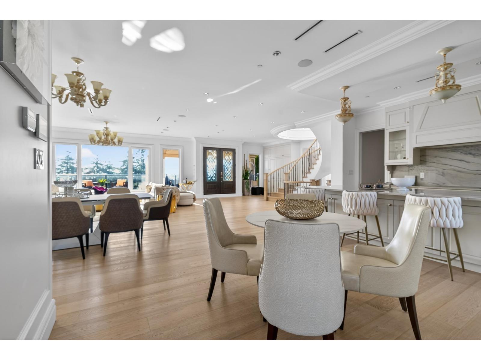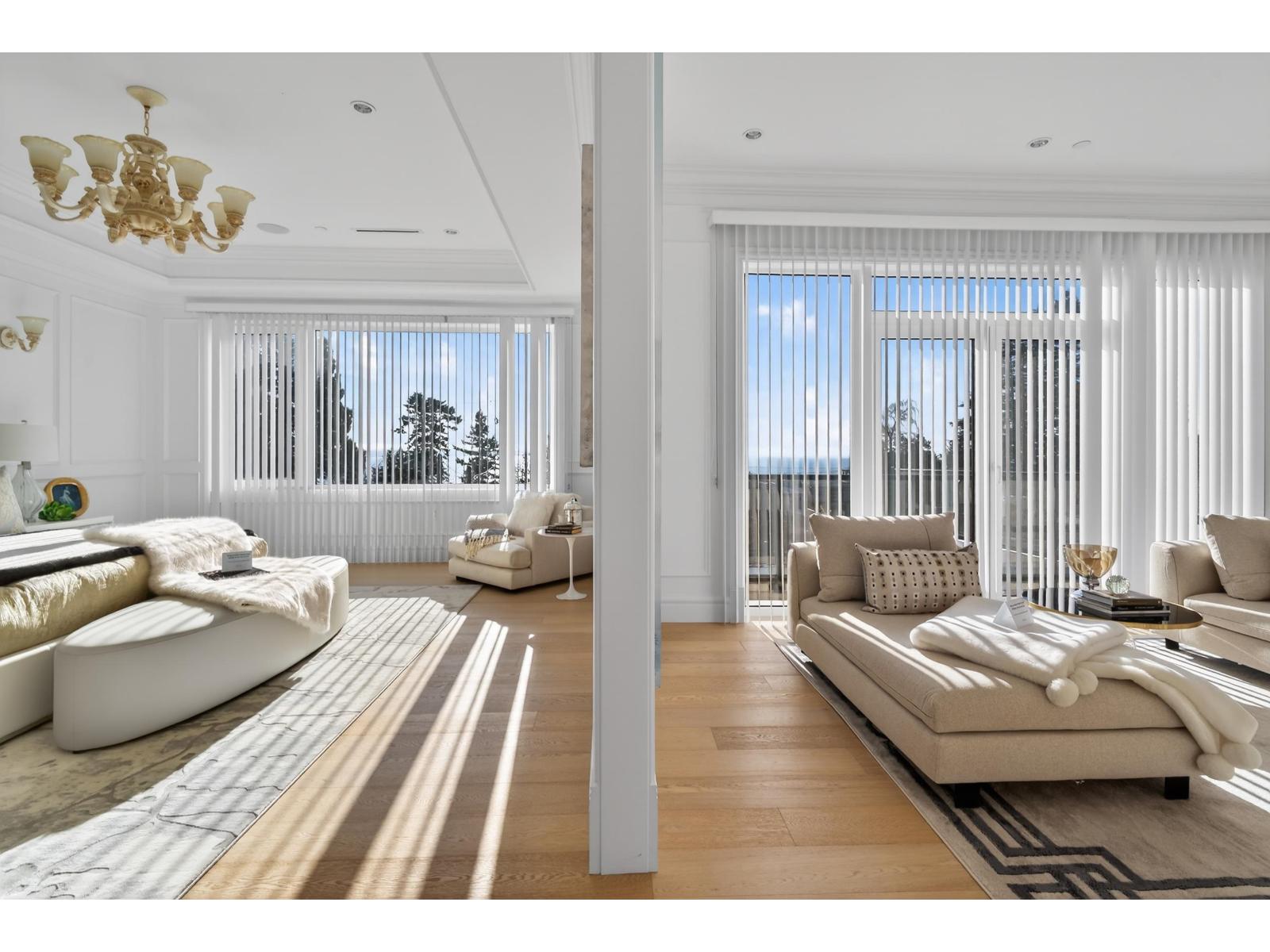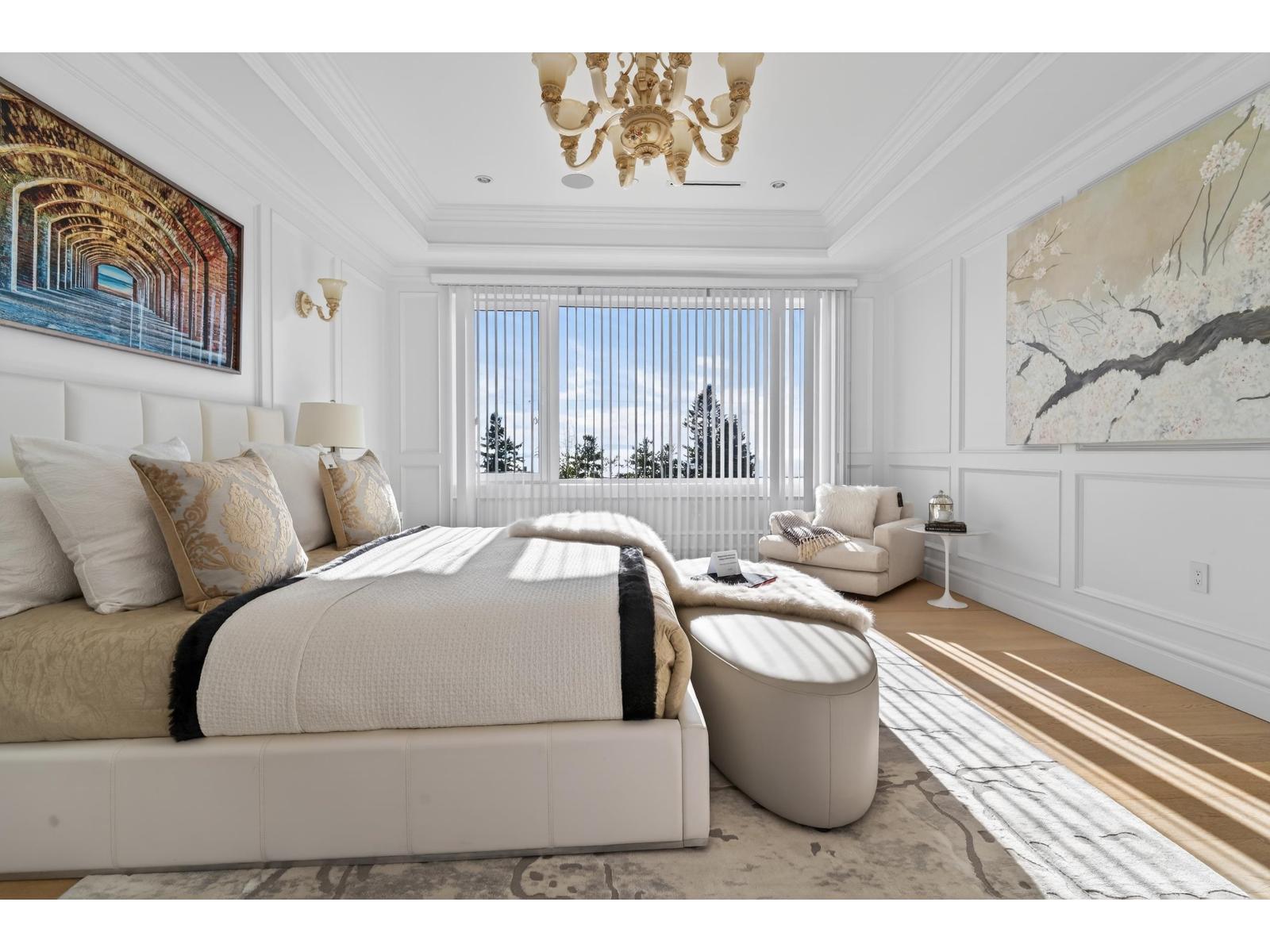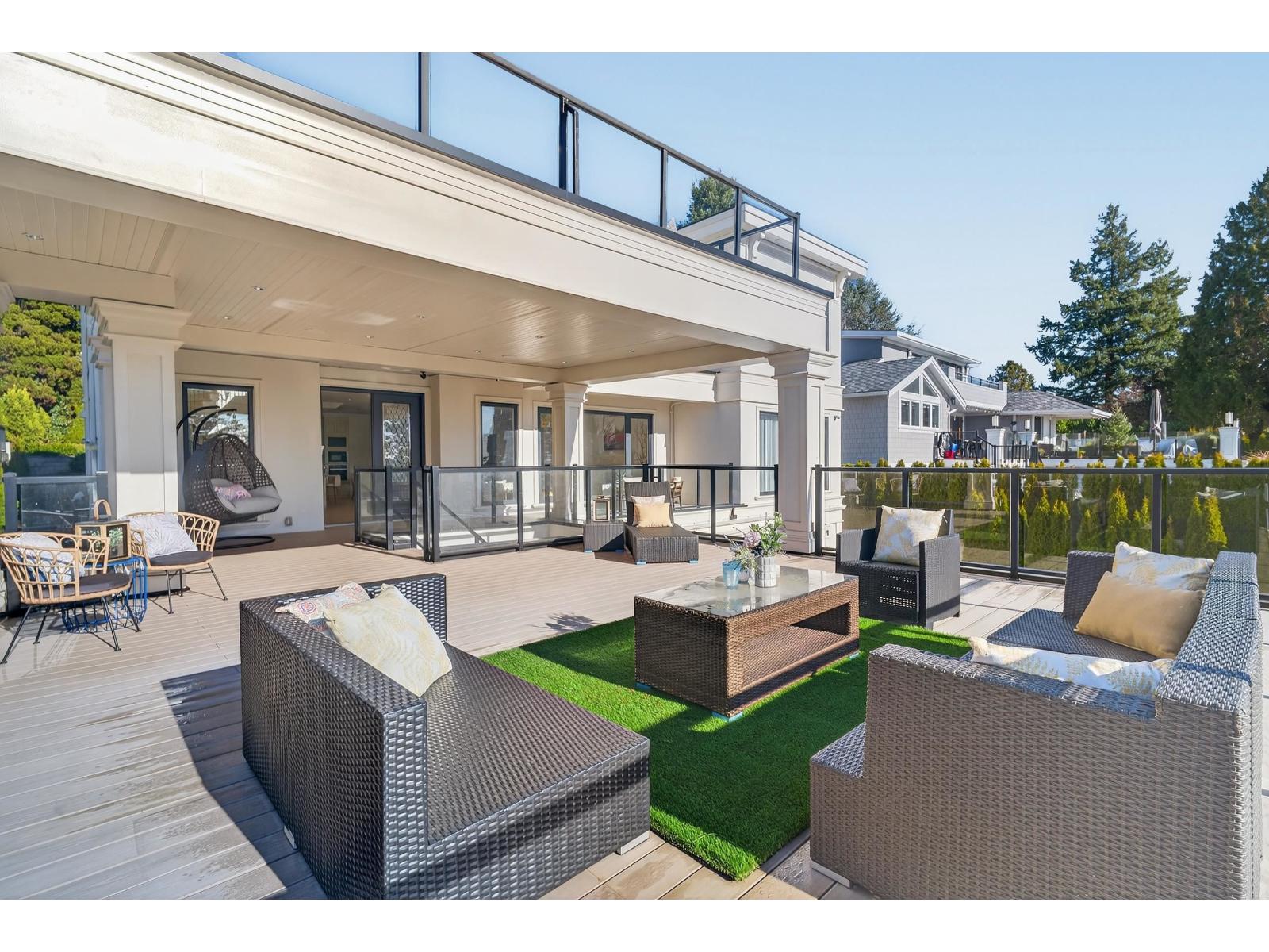 Exceptional custom-built 3-level ocean-view home in one of White Rock's most prestigious enclaves. Offering 7,000 sqft of refined living with ocean views from principal rooms on two levels. Main floor features open living and dining areas, gourmet chef's kitchen with premium appliances, separate wok kitchen, private office, and a main-floor primary/second master with patio access. Upper level offers three ensuited bdrm, including a primary suite with sitting area, two walk-in closets, and spa-inspired ensuite. Lower level includes a rec/media room, wet bar, gym, & guest bdrm. Expansive sun decks on main and upper levels total approx. 1,600 sqft (not included). Fully gated 13,939 sqft south-facing lot. Radiant heating, A/C, HRV, double garage, ample parking. Bayridge & Semiahmoo catchment. Open house Feb 14, 15 (Sat, Sun) 2 - 4 pm. (id:52823)