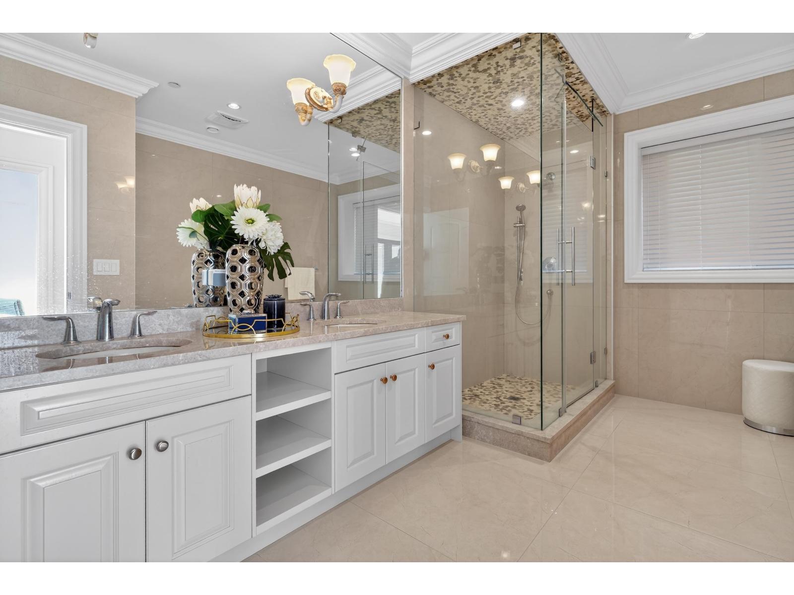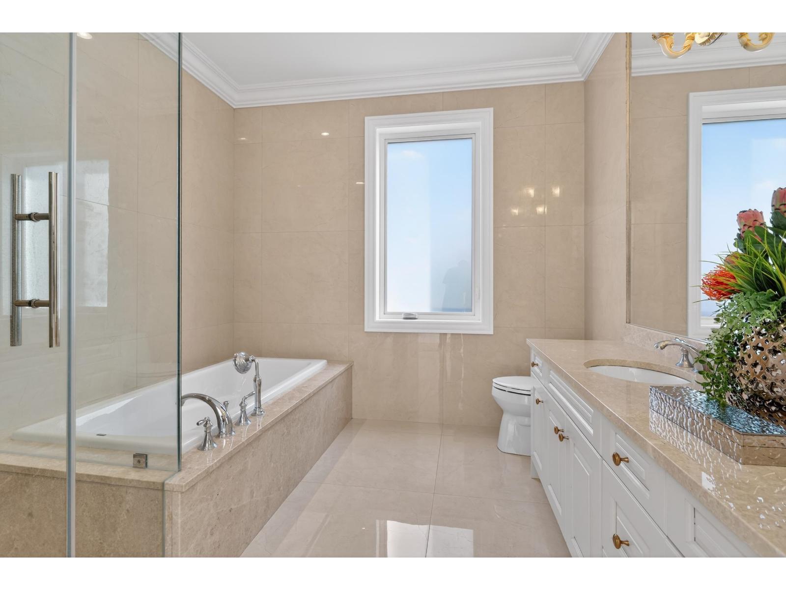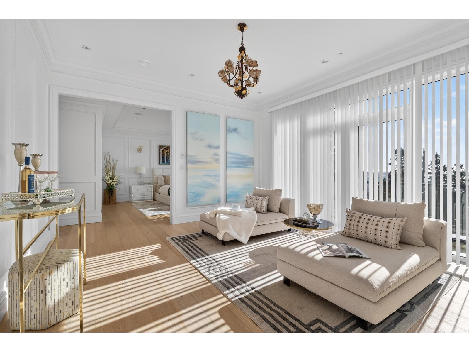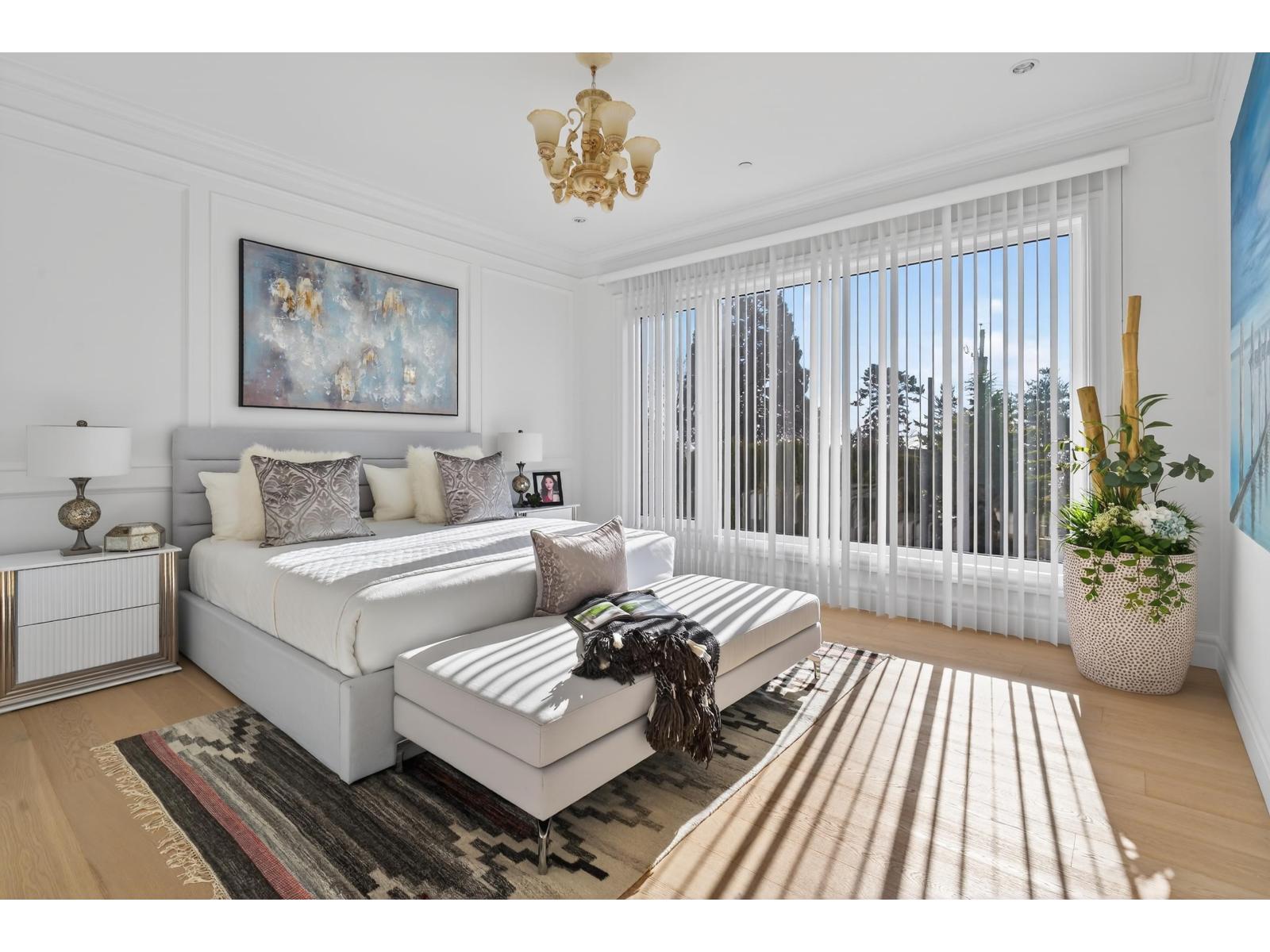 Exceptional custom-built 3-level ocean-view home in one of White Rock's most prestigious enclaves. Offering 7,000 sqft of refined living with ocean views from principal rooms on two levels. Main floor features open living and dining areas, gourmet chef's kitchen with premium appliances, separate wok kitchen, private office, and a main-floor primary/second master with patio access. Upper level offers three ensuited bdrm, including a primary suite with sitting area, two walk-in closets, and spa-inspired ensuite. Lower level includes a rec/media room, wet bar, gym, & guest bdrm. Expansive sun decks on main and upper levels total approx. 1,600 sqft (not included). Fully gated 13,939 sqft south-facing lot. Radiant heating, A/C, HRV, double garage, ample parking. Bayridge & Semiahmoo catchment. Open house Feb 14, 15 (Sat, Sun) 2 - 4 pm. (id:52823)