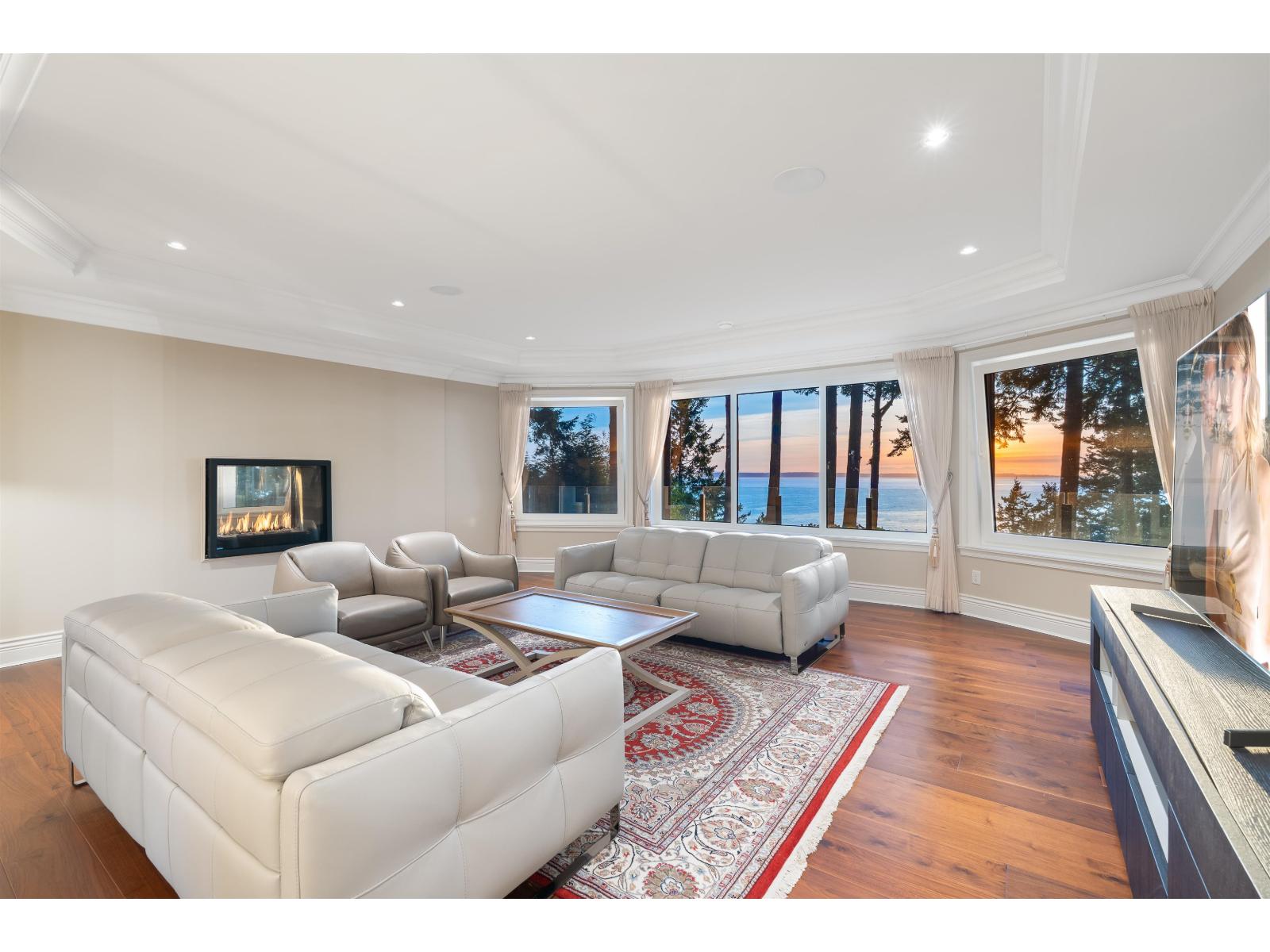 Perched on a private bluff in Ocean Park, this 9,500 sf estate defines West Coast luxury across three sunlit levels with panoramic ocean views and stunning sunsets. Soaring windows and elegant interiors blend modern comfort with timeless style. The chef's kitchen features a quartz island, top-tier appliances, custom cabinetry, and a secondary wok kitchen. A breakfast nook and formal dining area overlook breathtaking vistas. Upstairs offers serene lounges and bedrooms with floor-to-ceiling windows, including a spa-inspired primary retreat. The lower level includes a theatre, games room, and walk-out access to a manicured garden. Located in one of South Surrey's most prestigious enclaves, this residence offers exceptional privacy and oceanfront living. (Some photos are virtually staged) (id:52823)