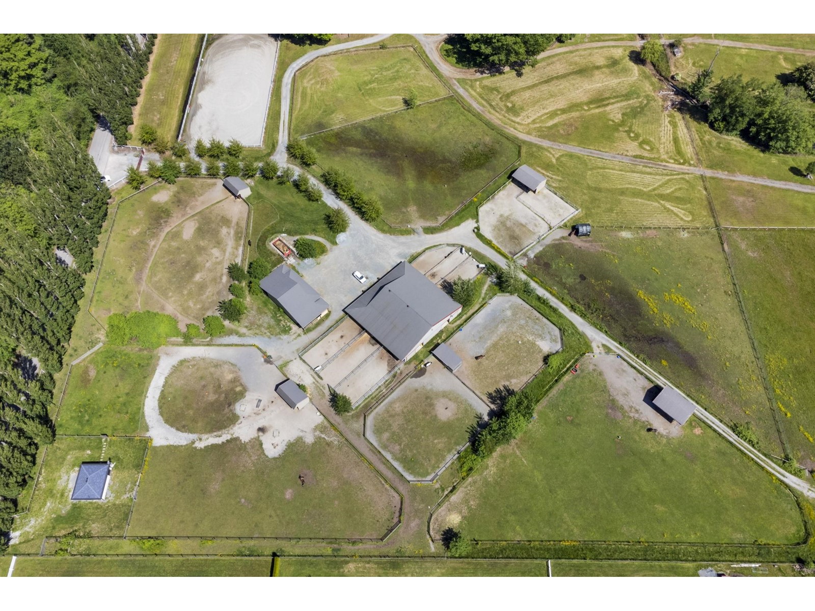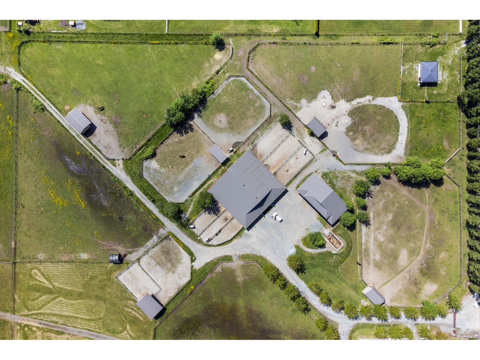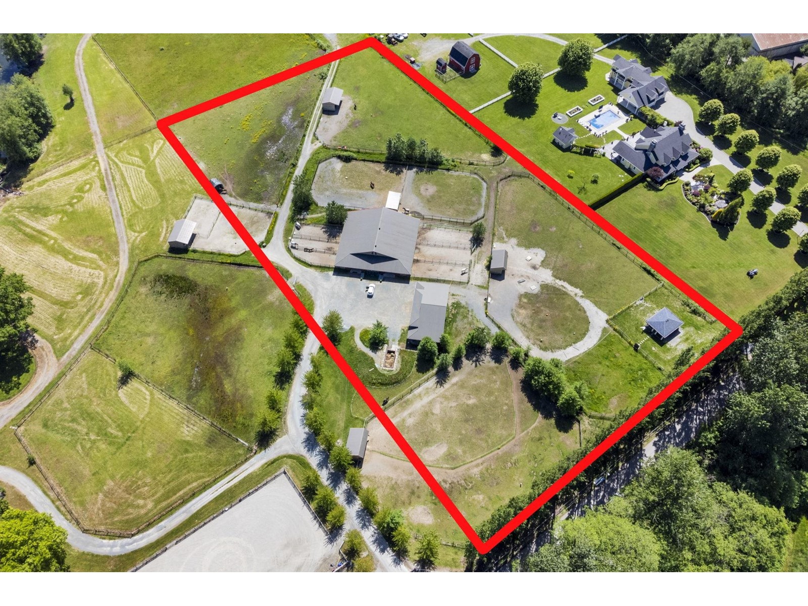 Situated on a peaceful neighbourhood in South Surrey - this exceptional 4.77 Acres offers a rare opportunity to own a spacious and flat parcel in a prime location of South Surrey White Rock. Enjoy the privacy of the serene setting while remaining just 6 to 10 minutes drive from key amenities like Grandview Aquatic Centre, Grandview Shopping, and Morgan Crossing. This property is perfect for building your dream Home or as a valuable investment with a possible future Industrial development Potential. A fantastic opportunity to build your dream home plans are available for an 8,118 sqft estate home, with a bldg permit already issued. This property is perfect for a hobby farm or equestrian facility, featuring 3 buildings: a 15-stall barn, a storage barn, and a charming 401 sqft cottage. (id:52823)