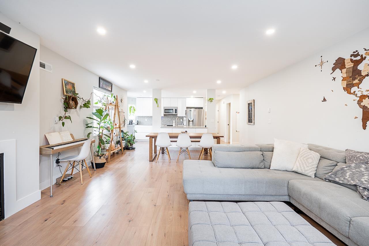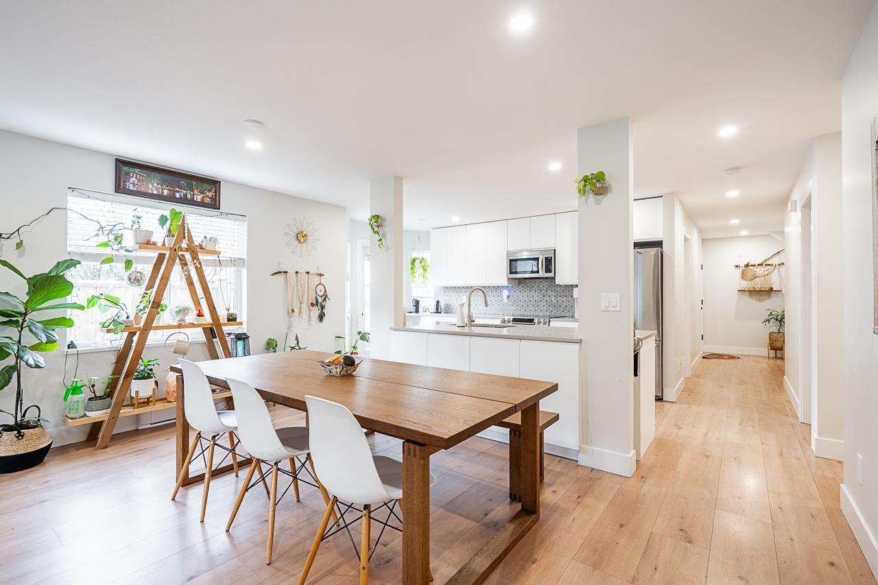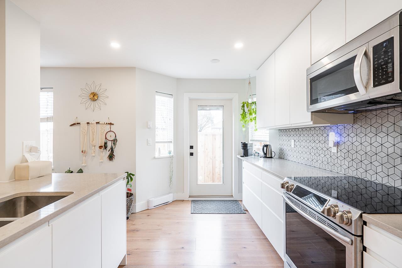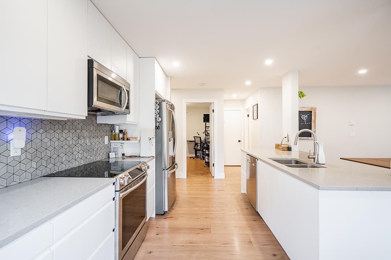 $338 MonthlyRenovated bright and spacious ground-level end unit townhouse in Fleetwood. Rancher style living at its best with this well-appointed 2 bedroom plus den (could be 3rd bedroom), 2 bathroom home. Features an open-concept great groom with recent updates throughout including new floors, kitchen cabinets with quartz counters and tile backsplash, paint, designer light fixtures, mouldings and stainless steel appliances. Lovely backyard with covered patio and BBQ area perfect for entertaining. Parking includes a single car garage, open parking and visitor parking. Do not miss the opportunity to live in a quiet area of Fleetwood, yet so close to all amenities and future Skytrain! (id:52823)