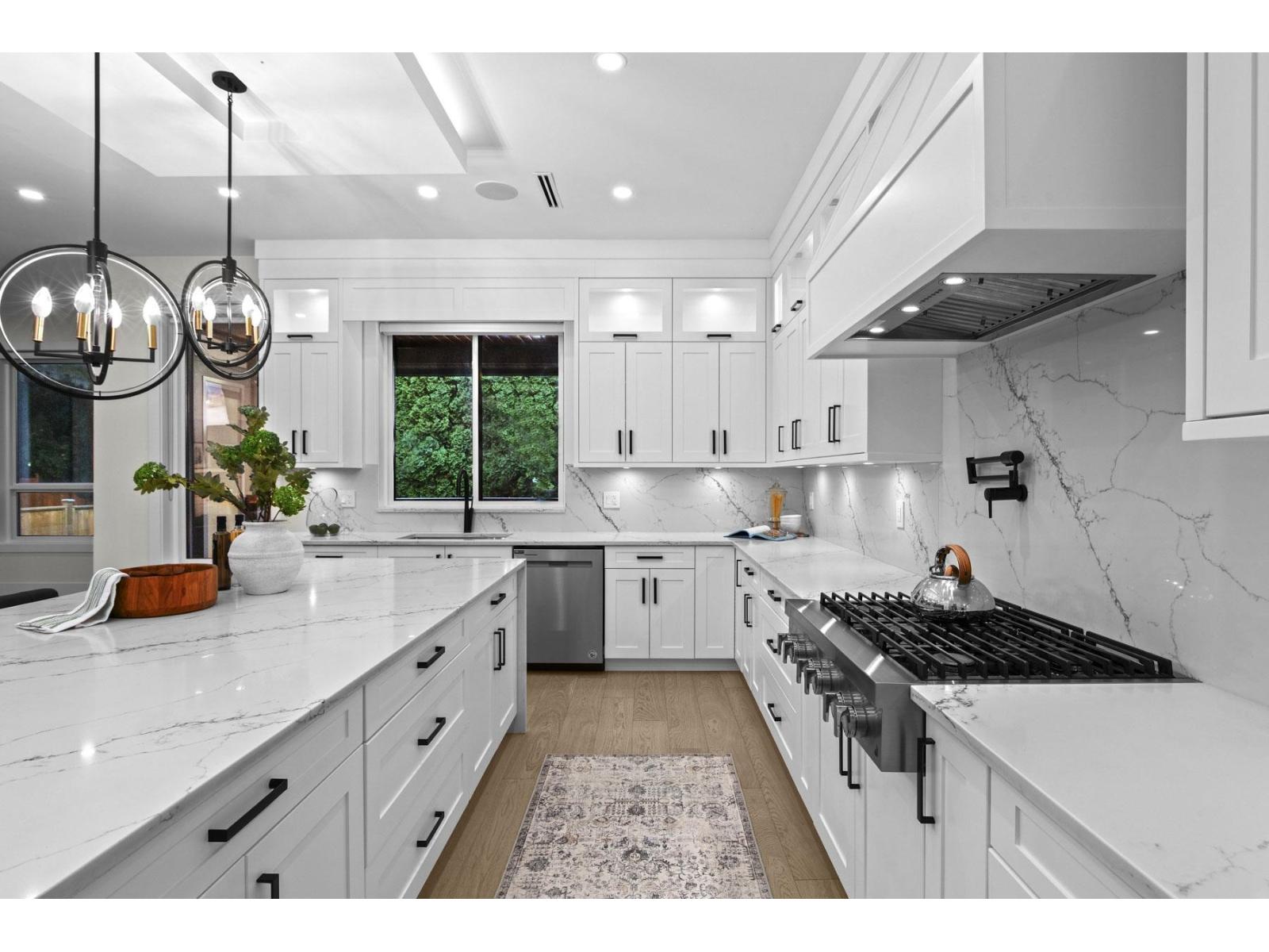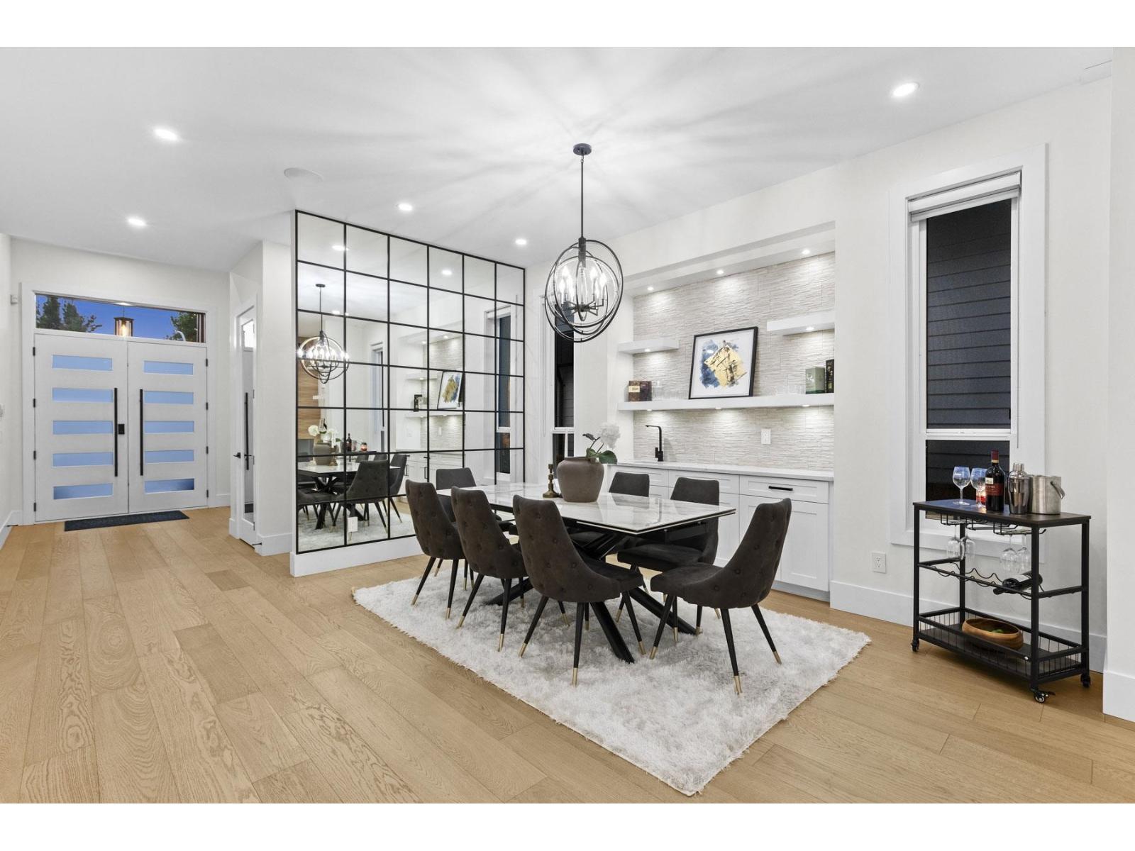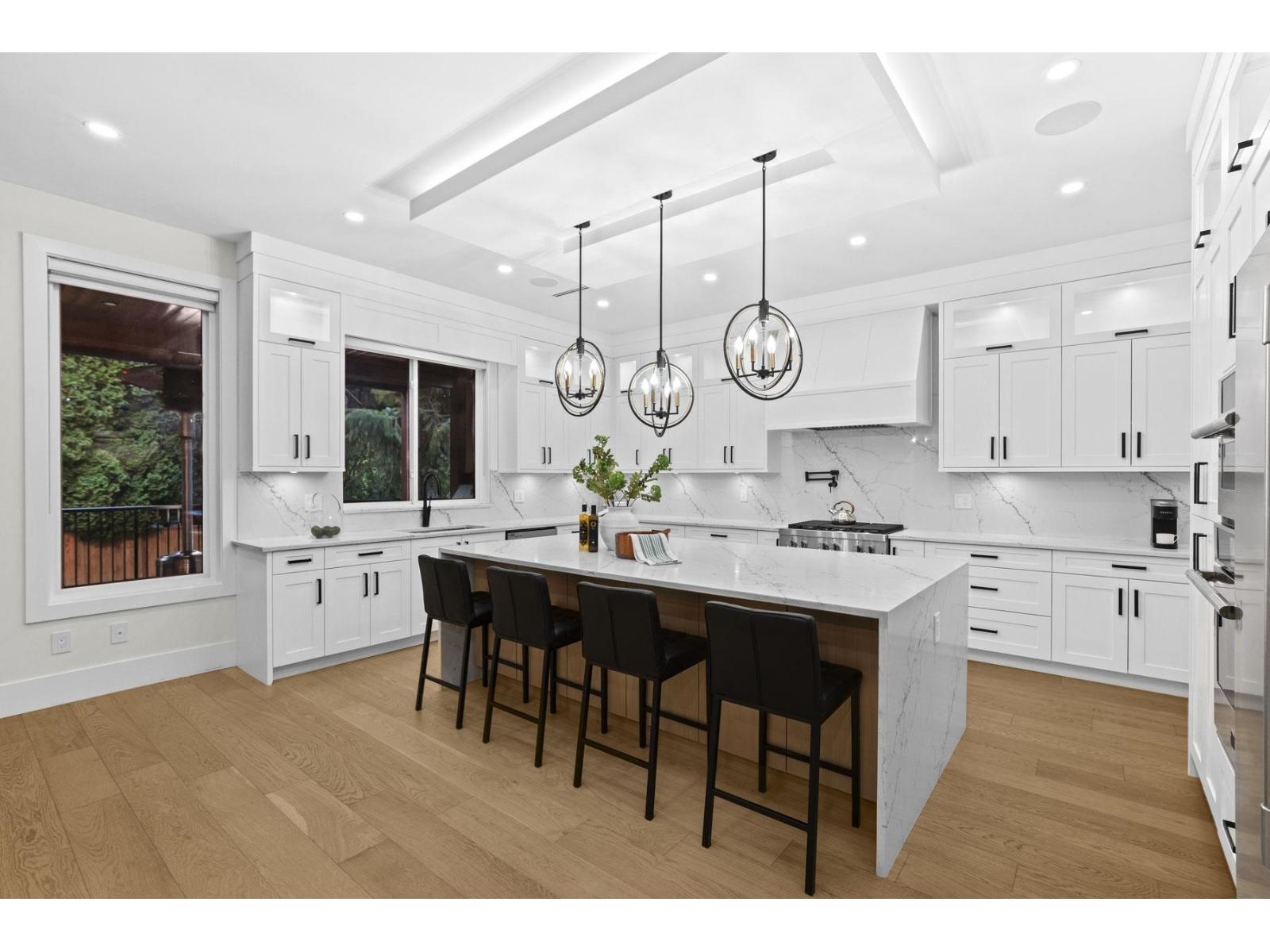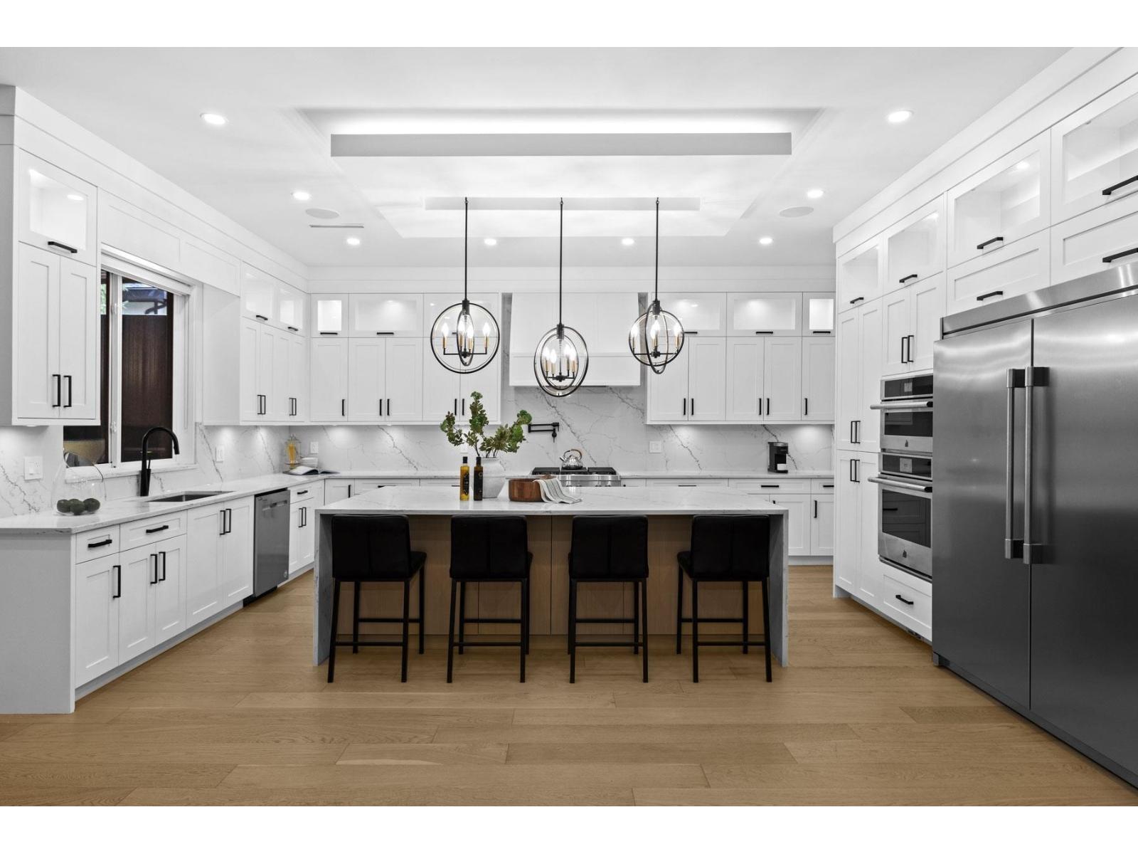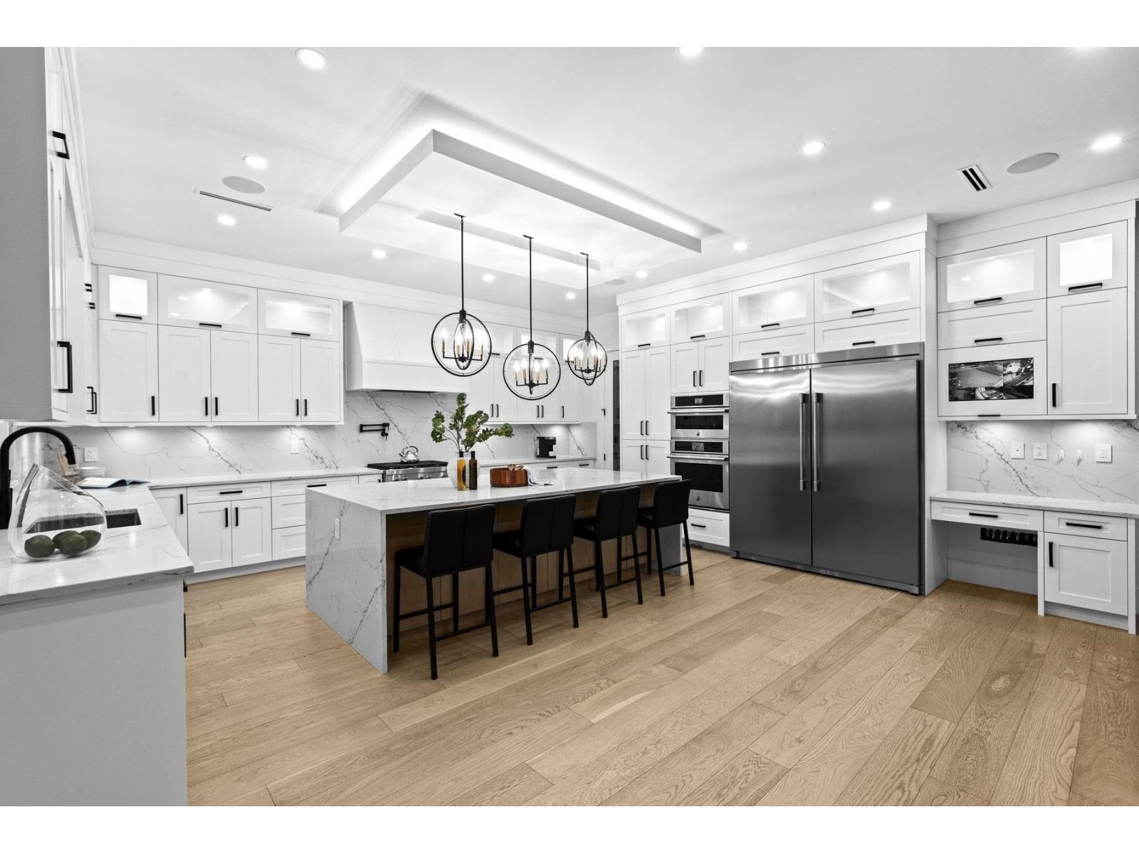 Welcome to The Haven, beautifully crafted custom-built home in Cloverdale! This contemporary beauty is finished with designer picked colours, high-end cabinetry, ultra-modern lighting system with modern design influences. The main floor features a seamless open concept layout with hardwood flooring, radiant heating & AC. The formal dining room adjacent to the family room features the gourmet kitchen along with a wok-kitchen and full-size commercial fridge. The nook leads to your south facing covered patio space featuring your custom-built outdoor BBQ kitchen. The upper level contains 4 large bedrooms with ensuites including the luxurious primary bedroom with double sink vanities. Below you will discover the theatre room with a full kitchen along with an additional 2 BDRM SUITE (2+1). (id:52823)