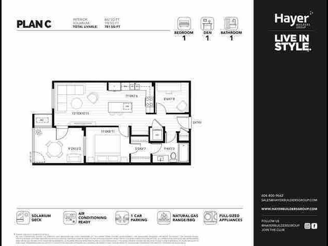 $292 MonthlyAssignment of contract. Welcome to Hayer Town Centre. The C plan is a thoughtfully designed 1 bedroom + den, 1 bathroom home with 662 sq ft of interior space plus a generous 119 sq ft solarium featuring retractable upper glass panels, a gas BBQ hookup, and A/C. Upgrades includes closet organizer, panel dishwasher, and laminate flooring in bedroom. Enjoy exclusive access to a stand alone amenity building with a party room, games lounge, two outdoor fire pits, and a fully fenced dog park perfect for entertaining and everyday enjoyment. Estimated completion late 2025 (id:52823)