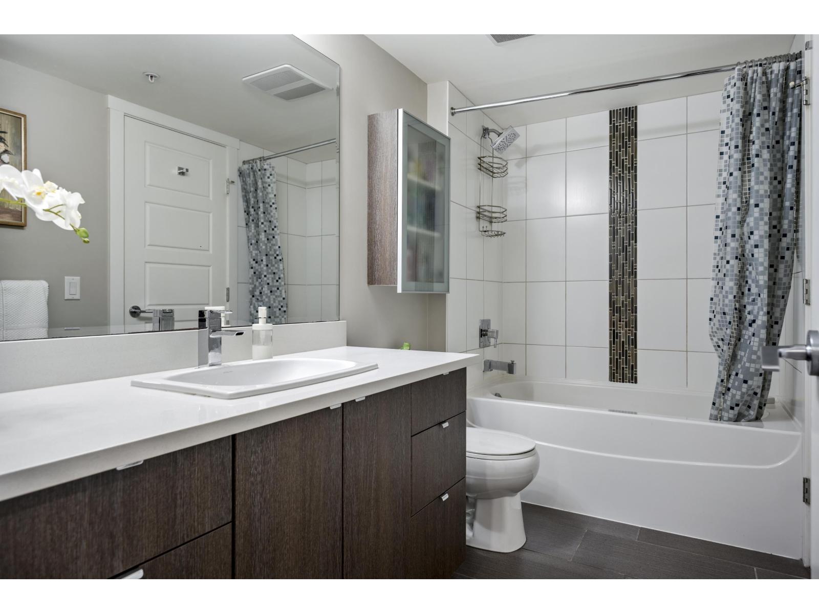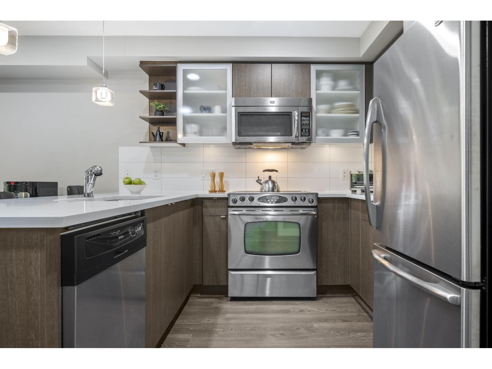 $433.99 MonthlySpacious 1 bed + Den & 2 Bath at Bearing Pointe! With over 900 sq.ft. this is one of the largest layouts in the building, this home feels like a 2-bedroom home thanks to the oversized den complete with a huge closet. Bright kitchen with stainless appliances, quartz counters, modern cabinetry, under-cabinet lighting, built-in pantry/computer nook and breakfast bar for casual dining. Living room features a cozy fireplace and opens to your generous covered deck surrounded by greenery, perfect for year-round use. Primary bedroom includes double closets and a 5-piece ensuite. Thoughtful updates include upgraded lighting throughout. Bonus powder room for guests & full in-suite laundry. Ideally located steps to shopping, transit, and parks this is the total package. 2 pets allowed Dogs & Cats! (id:52823)