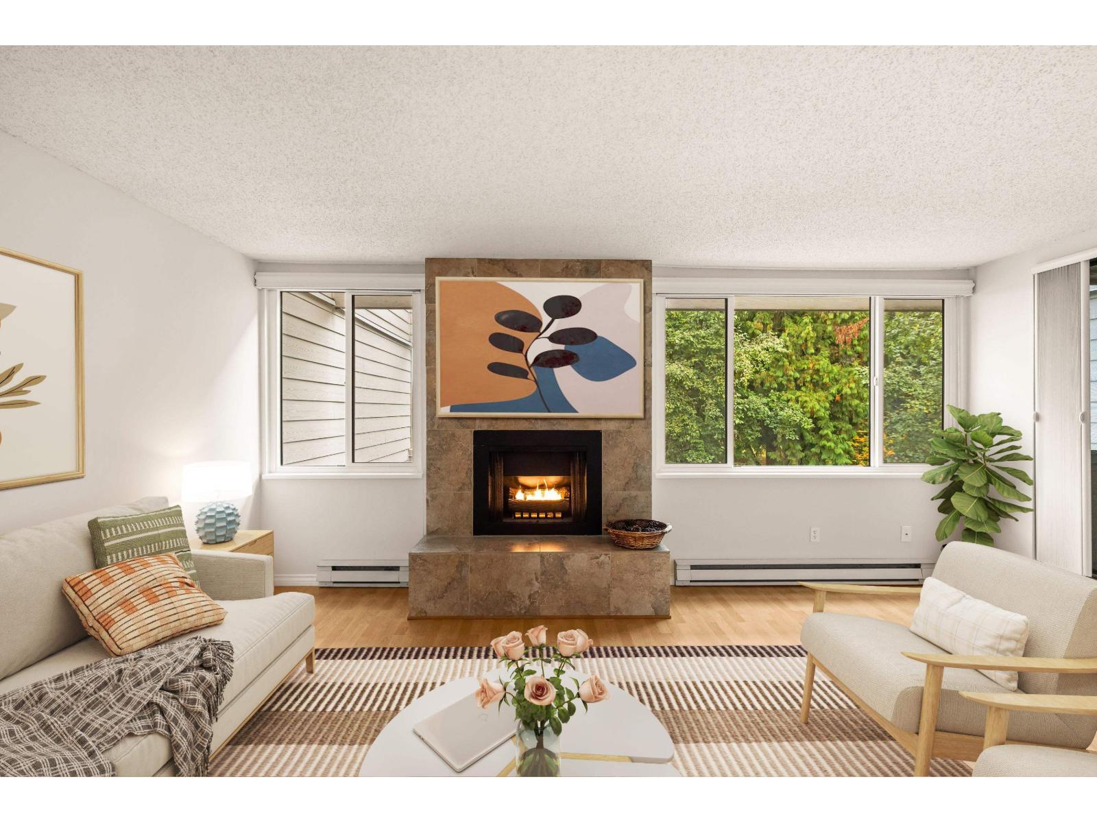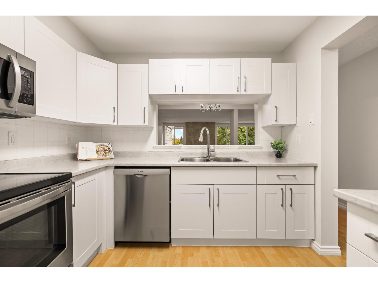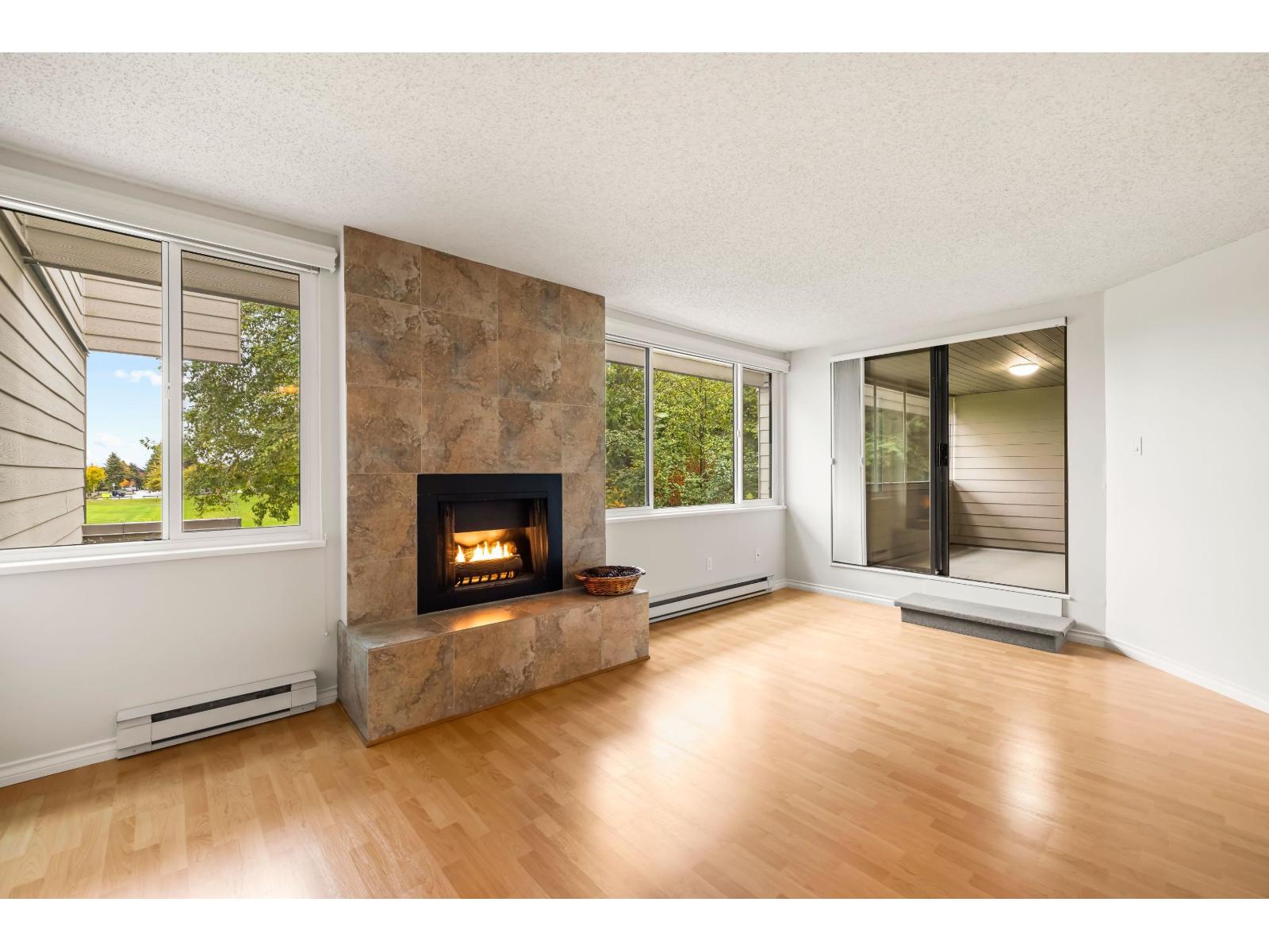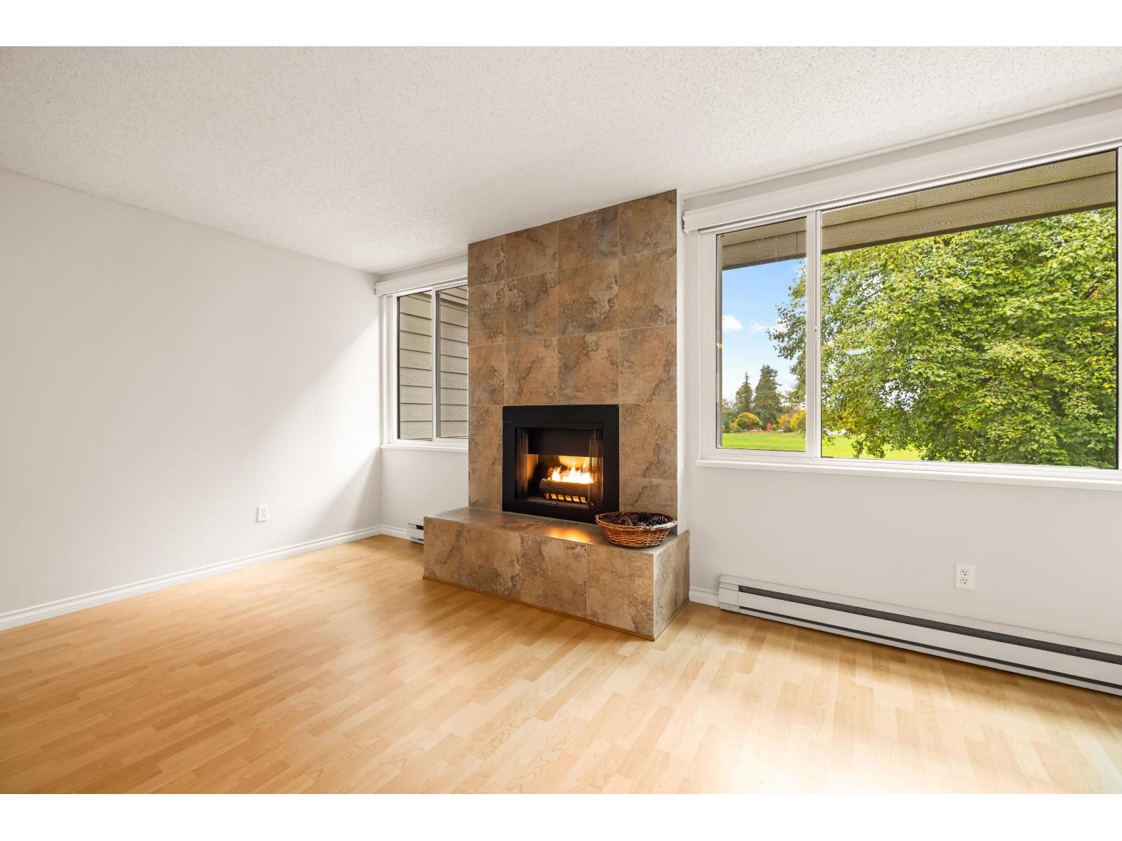 $587 MonthlyWelcome to Parkview Place! Beautifully updated and freshly painted 2 bed, 2 bath home offering 1,153 sq ft of bright, spacious living with peaceful views of Bakerview Park from every room. The open layout includes a generous dining & living area with a cozy gas fireplace. The renovated kitchen features white shaker cabinets, stainless-steel appliances & plenty of storage space. The large primary bedroom includes a private ensuite. Additional features include new vinyl windows, in-suite laundry, and tasteful modern finishes throughout this move-in-ready home. Residents enjoy access to a fitness room, sauna, lounge, and secure underground parking, all within a proactive & well-cared-for community. Centrally located beside Bakerview Park and just minutes to shopping, restaurants, and transit. (id:52823)
