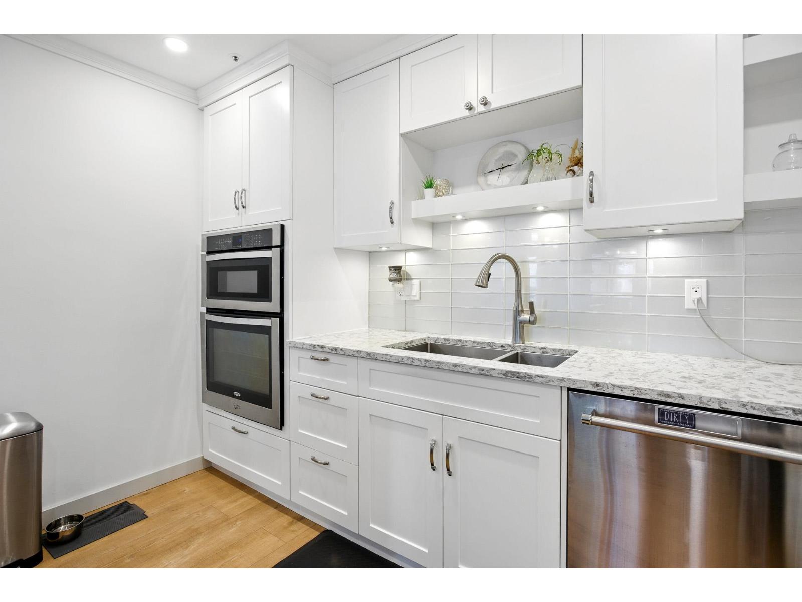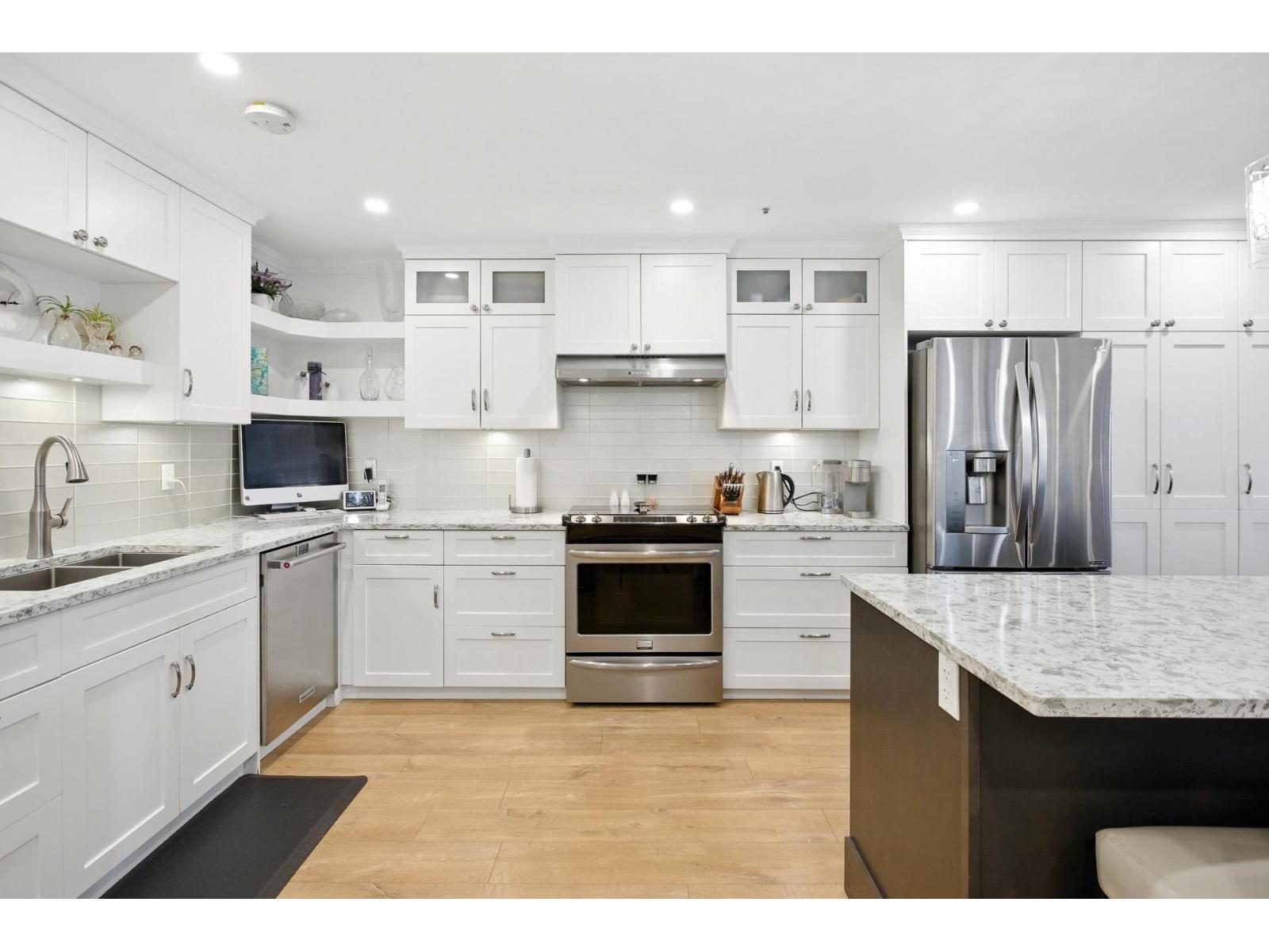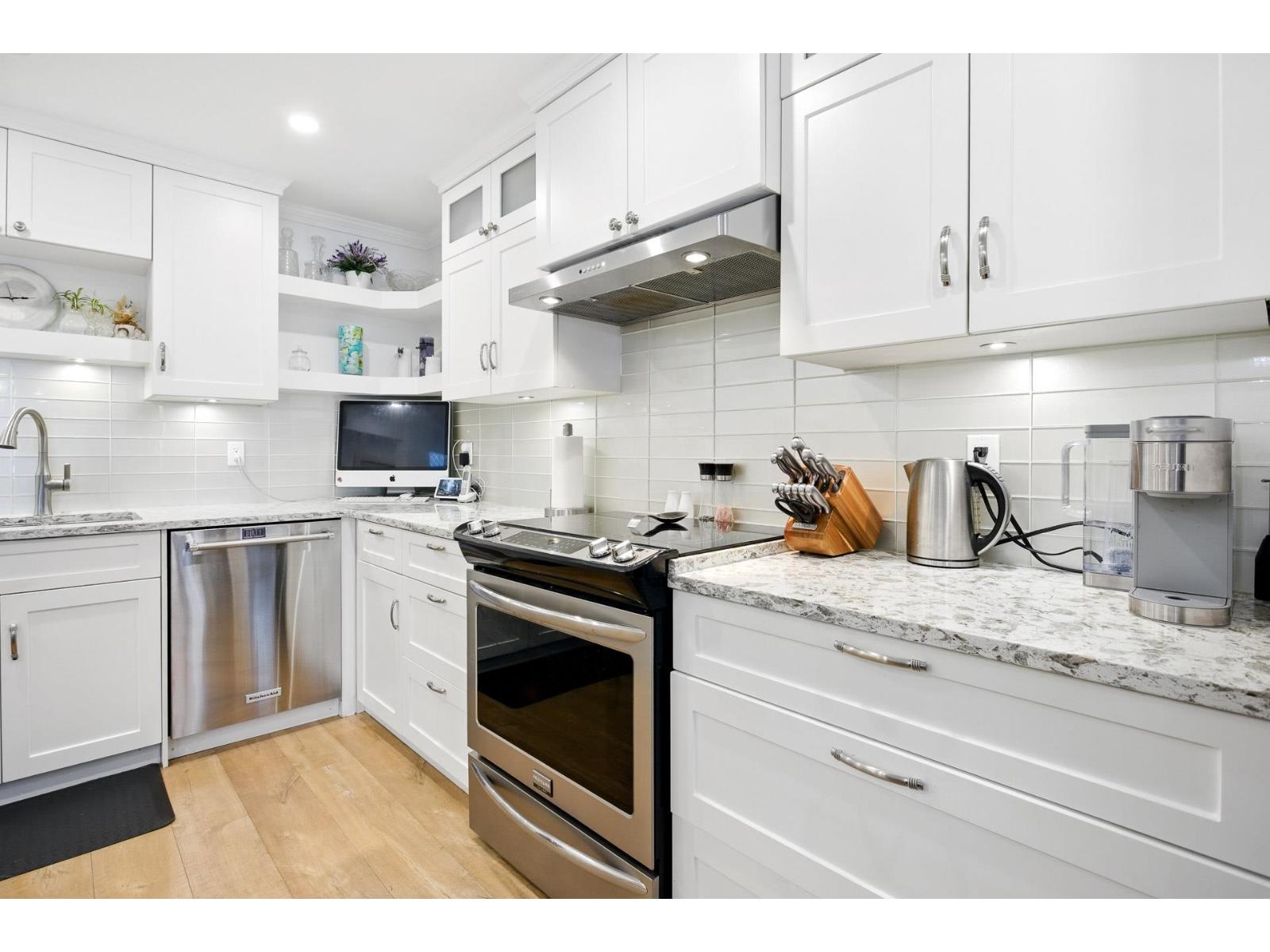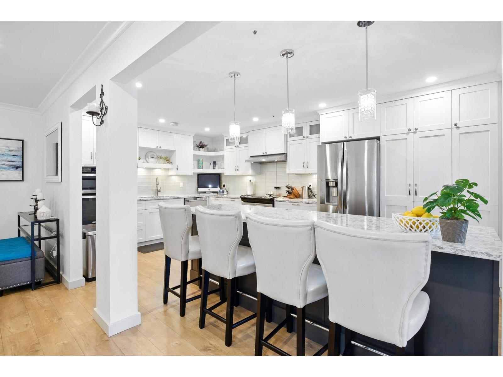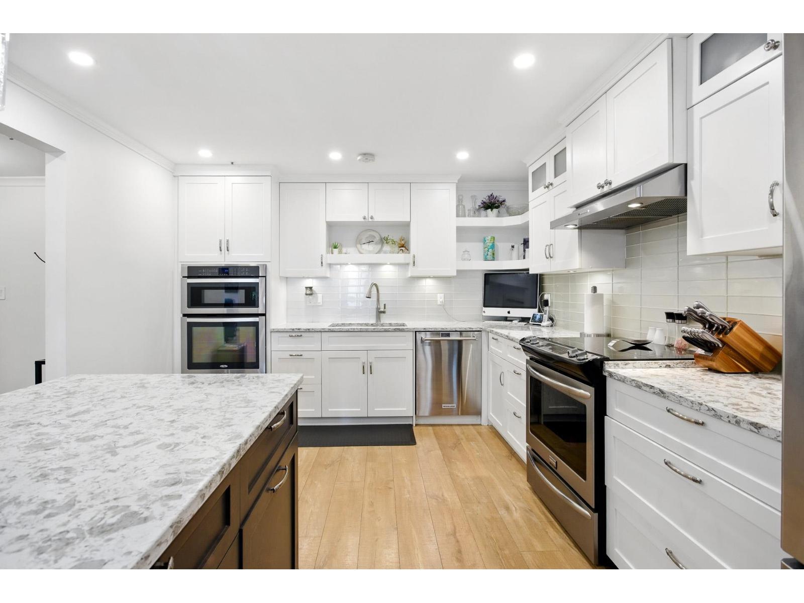 $886.20 MonthlyAre you downsizing from a home & looking for a spacious condo that can fit your furniture? This two-level condo will certainly impress! It offers over 1900 sq.ft. renovated living space with over $100K in upgrades including a showstopping kitchen with an 8-ft island, top of the line fixtures, double ovens & soft-close drawers, bright open layout with skylight, large laundry room & tasteful modern finishes throughout. Features 2 spacious beds & den (ideal for a home office or guest space), in-suite workshop/storage room, 2 decks, 2 parking stalls + large locker. Set in a quiet, well-maintained building in a highly desirable neighborhood near the future SkyTrain, with parks, shops & transit just steps away. This modern home is move-in ready! You need to see it to appreciate what it offers. (id:52823)