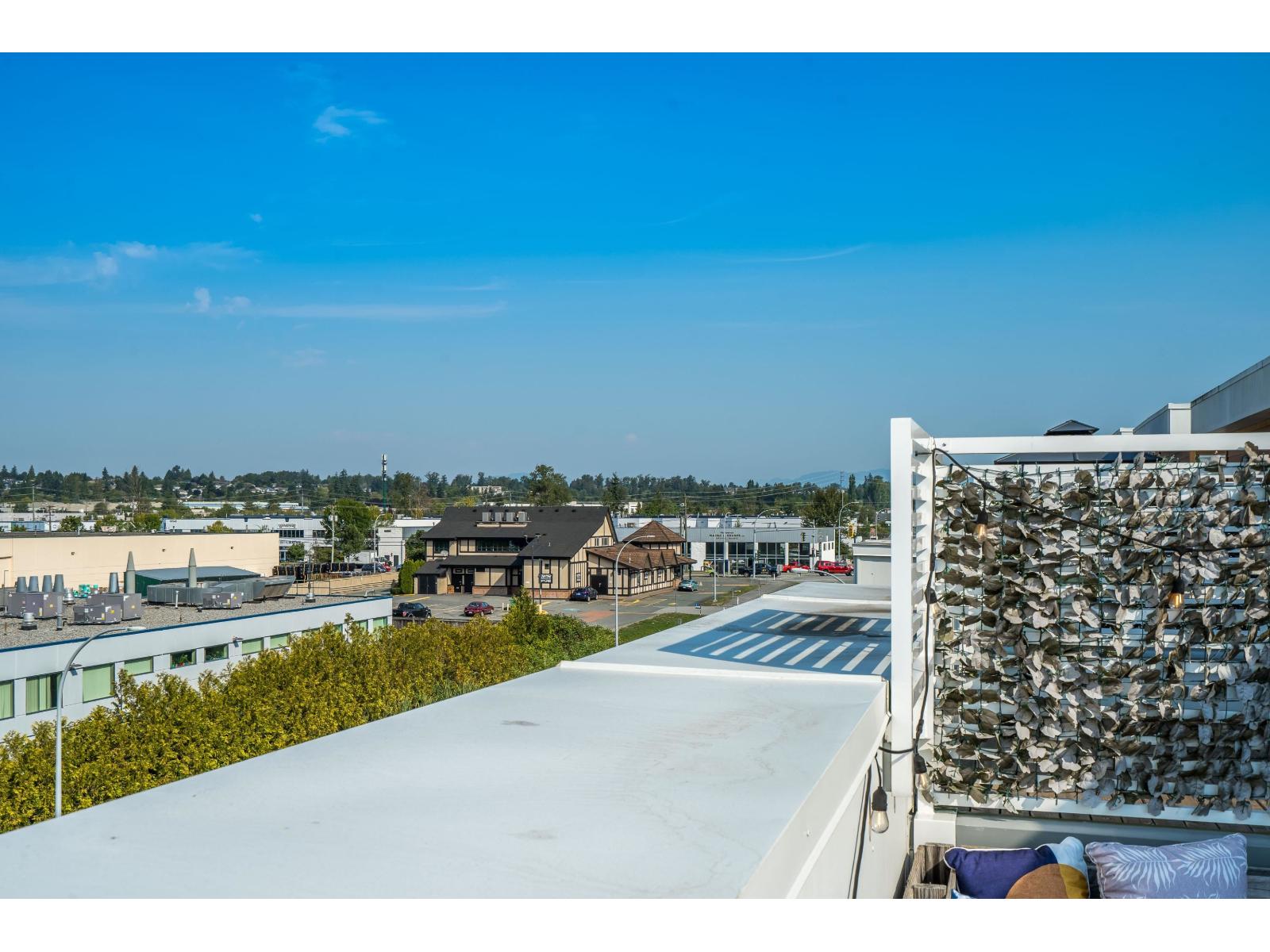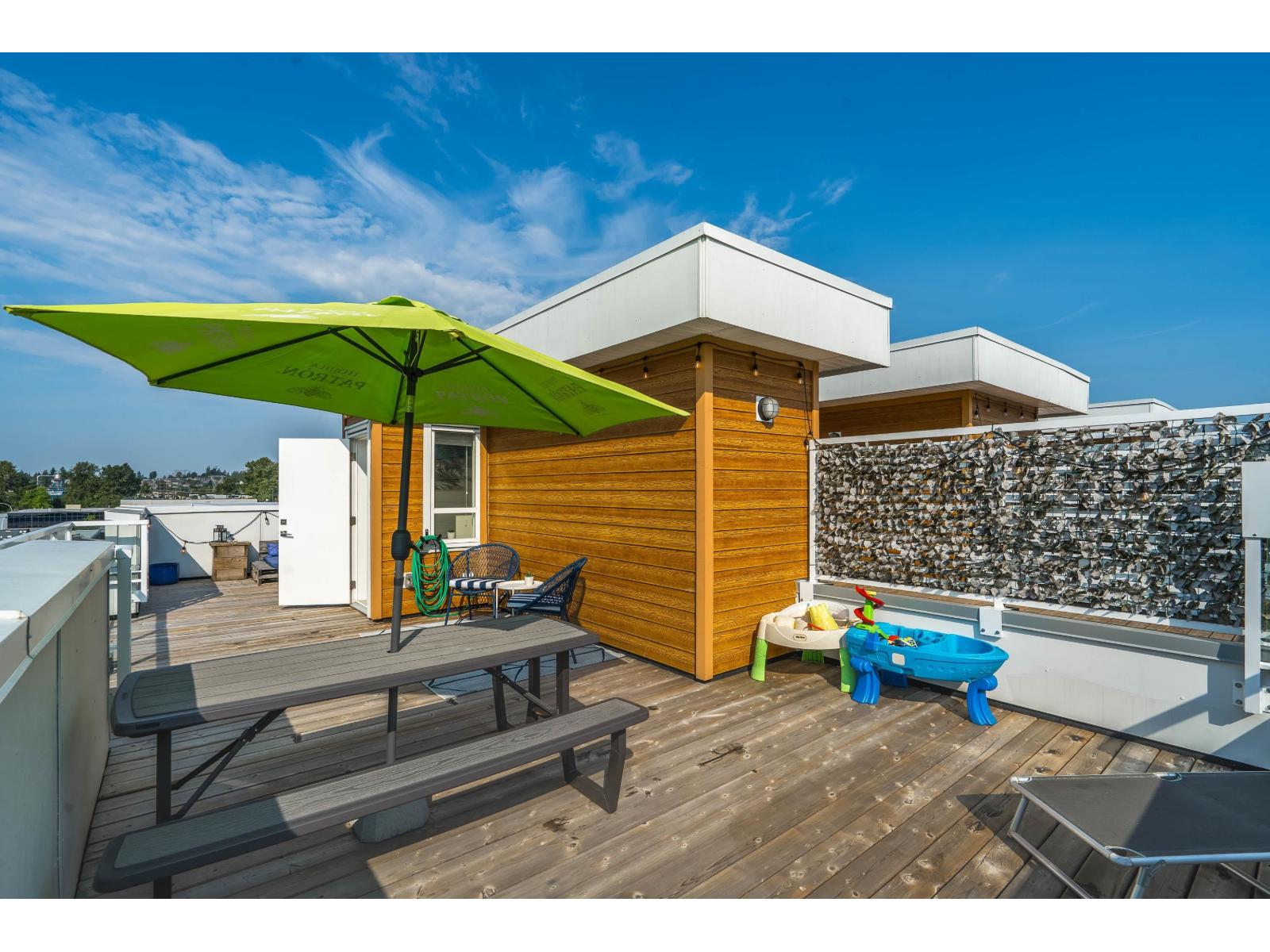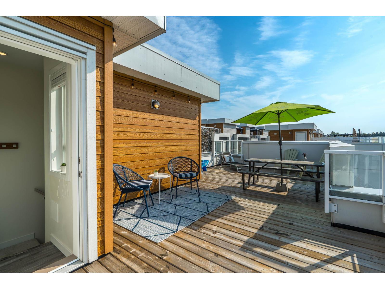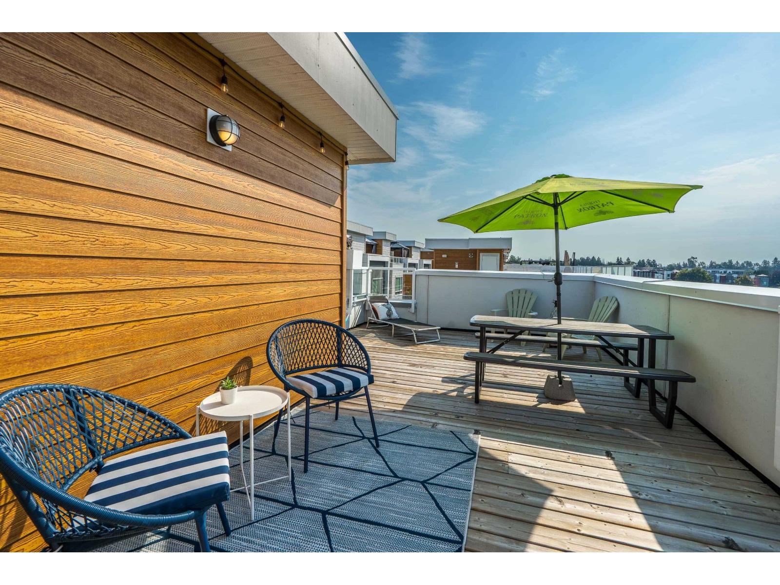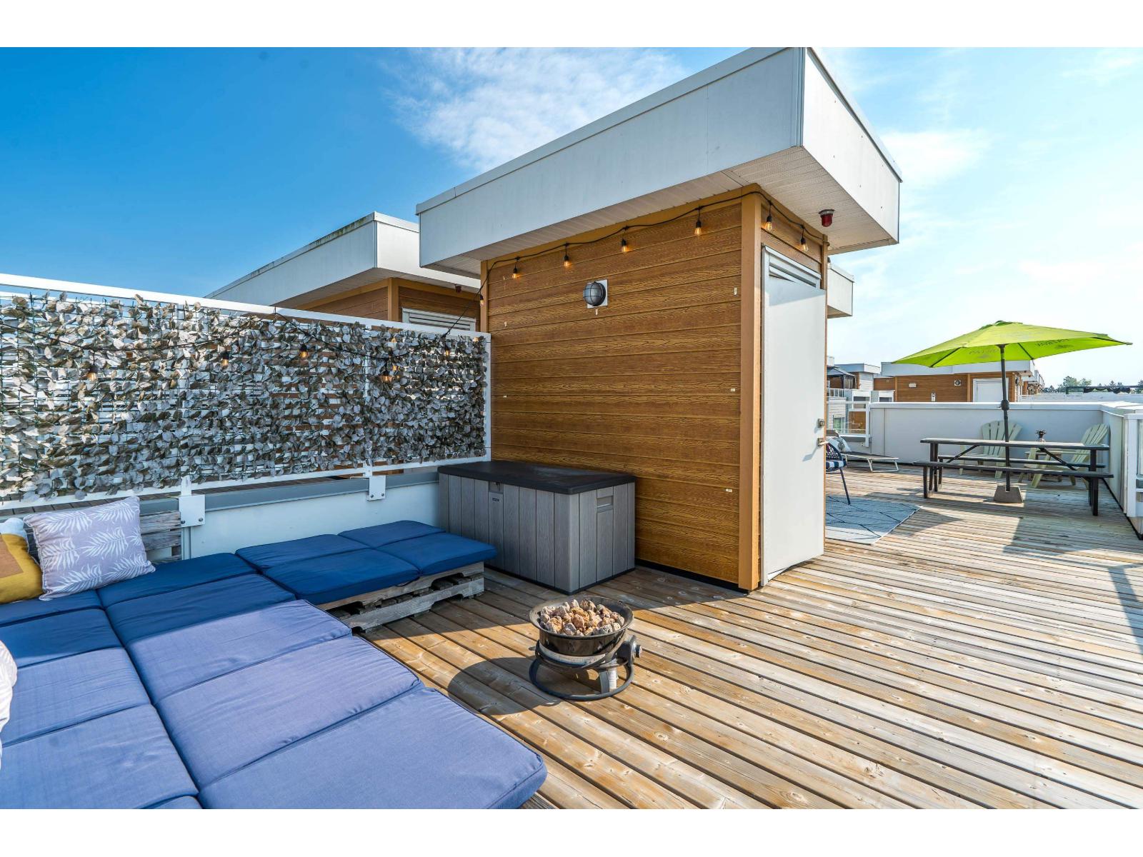 $406.21 MonthlyLIFT Rooftop Townhome - End Unit. This stunning 1,525 sq. ft. home features a full rooftop deck with 360° views of the North Shore Mountains, Mt. Baker, Golden Ears, and Brydon Nature Reserve. The main floor offers an ultra-modern layout with premium laminate flooring, gas range, stainless steel Samsung appliances, island sink with waterfall quartz counters, a powder room, built-in vac, Nest smart thermostat, Telus Smart security system, stylish pendant lighting, and end-unit bump-out with windows for extra natural light. Enjoy a walk-out west-facing deck plus a full heat pump A/C system. Both decks are BBQ-ready with quick-connect natural gas. Long tandem garage, visitor parking next door. 10-min walk to the future SkyTrain station. A luxury home that won't disappoint. 1cat & 1dog ok (id:52823)