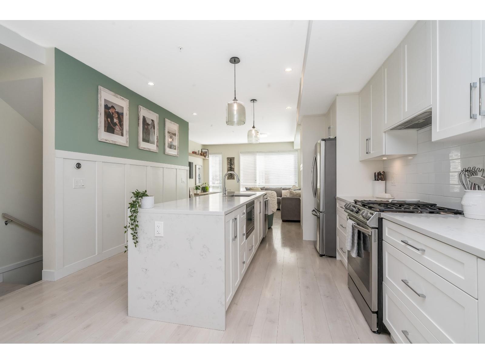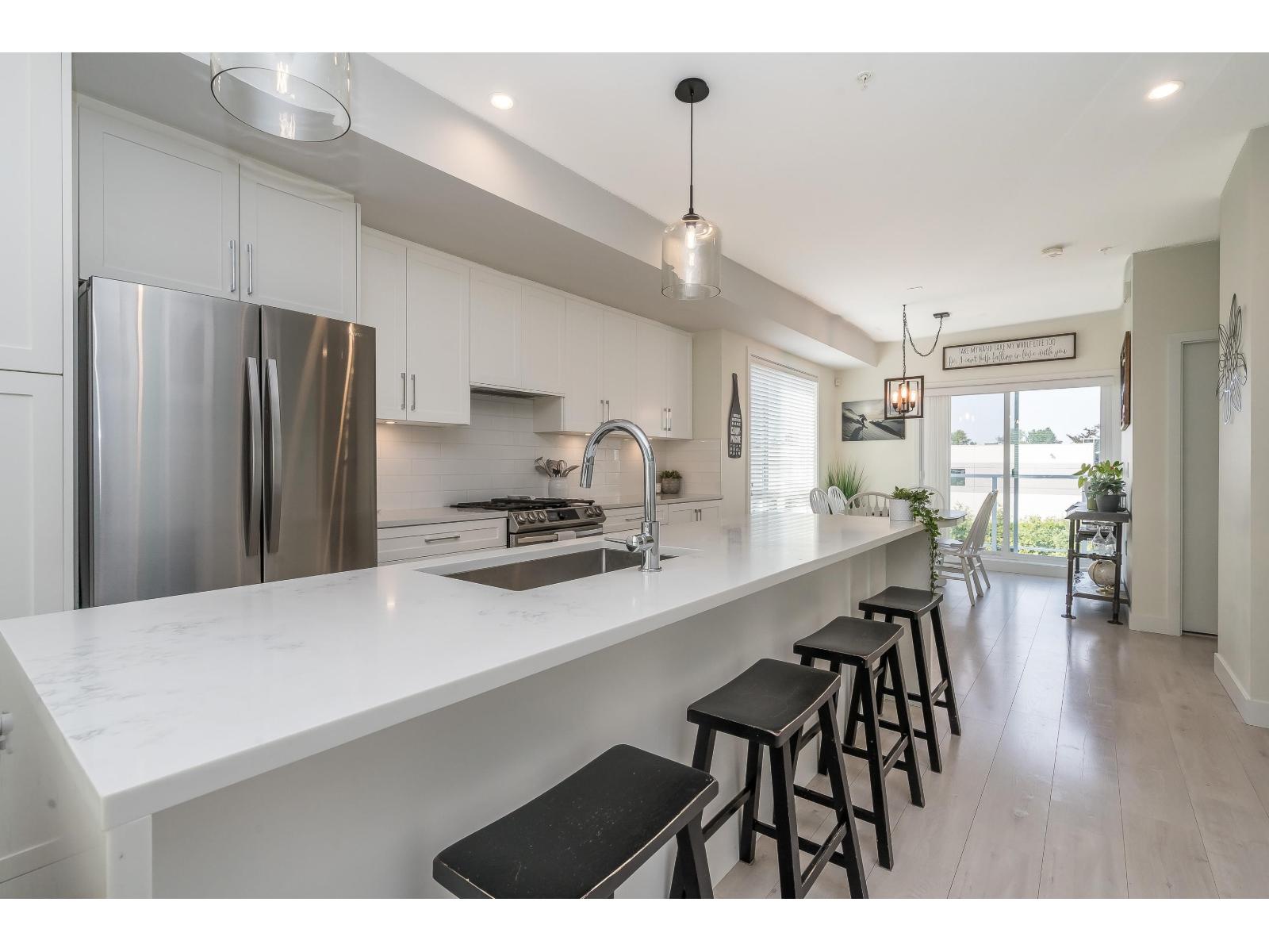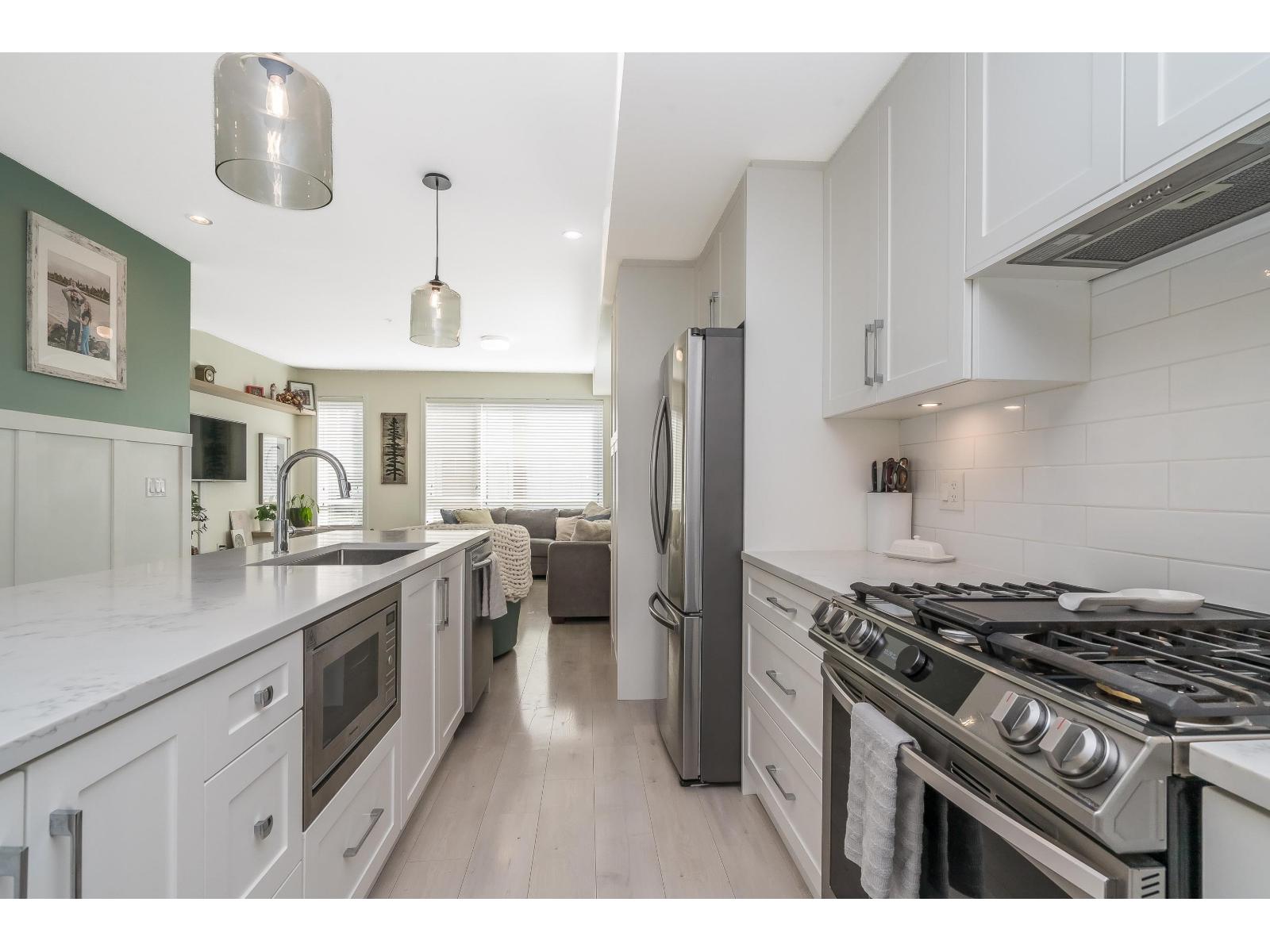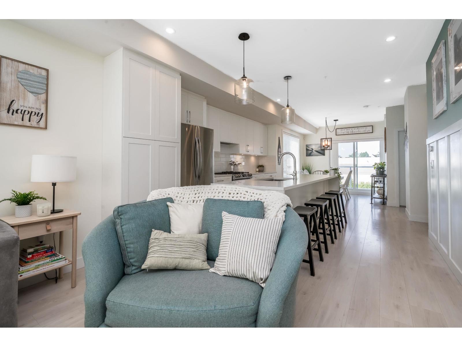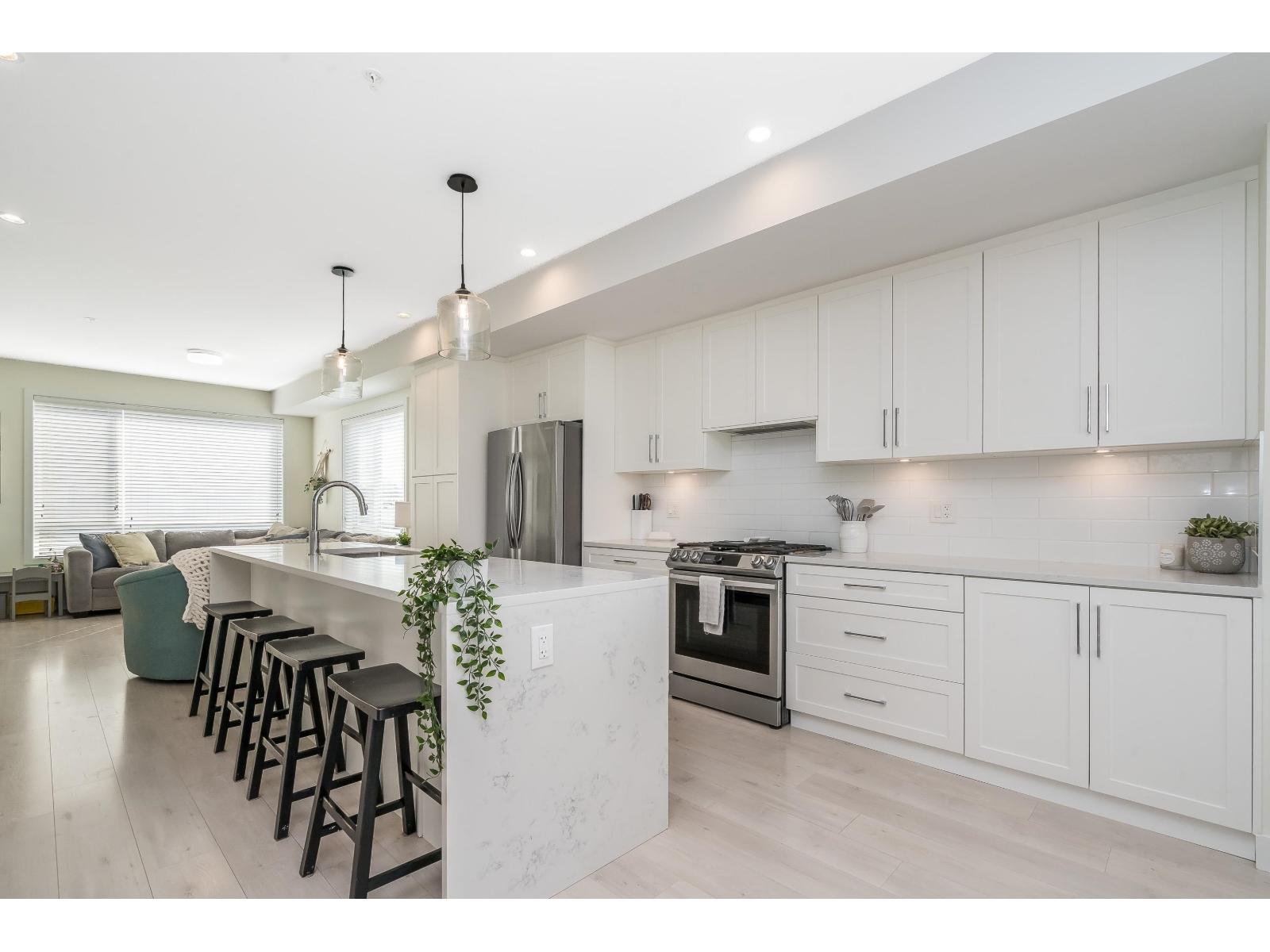 $406.21 MonthlyLIFT Rooftop Townhome - End Unit. This stunning 1,525 sq. ft. home features a full rooftop deck with 360° views of the North Shore Mountains, Mt. Baker, Golden Ears, and Brydon Nature Reserve. The main floor offers an ultra-modern layout with premium laminate flooring, gas range, stainless steel Samsung appliances, island sink with waterfall quartz counters, a powder room, built-in vac, Nest smart thermostat, Telus Smart security system, stylish pendant lighting, and end-unit bump-out with windows for extra natural light. Enjoy a walk-out west-facing deck plus a full heat pump A/C system. Both decks are BBQ-ready with quick-connect natural gas. Long tandem garage, visitor parking next door. 10-min walk to the future SkyTrain station. A luxury home that won't disappoint. 1cat & 1dog ok (id:52823)
