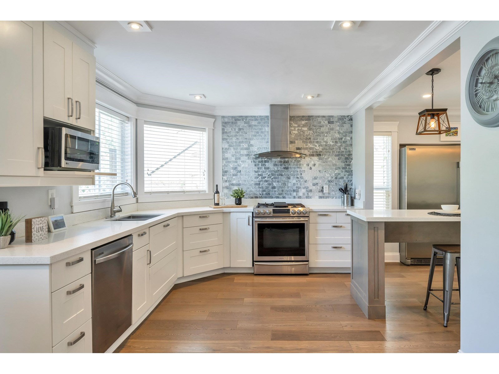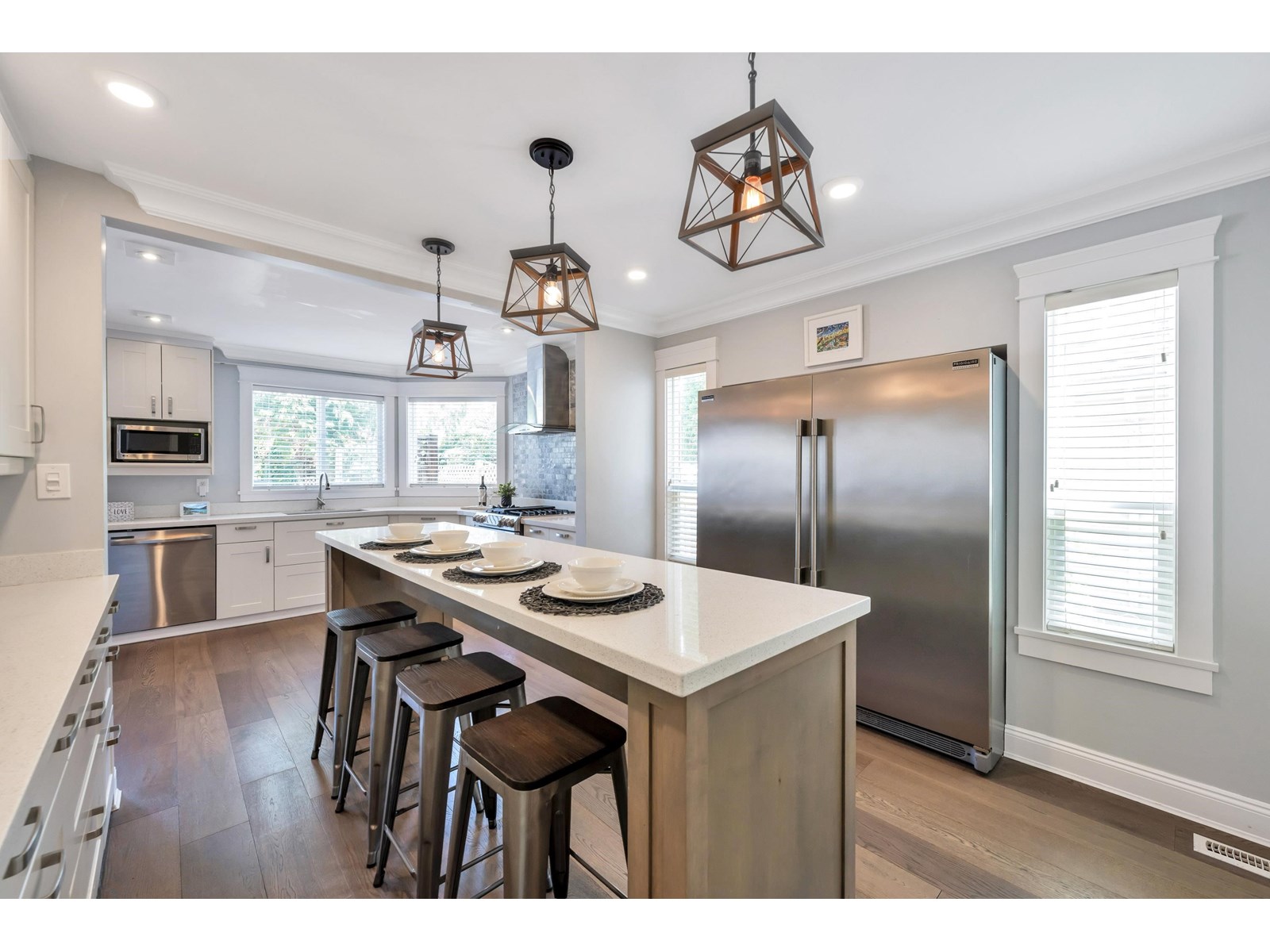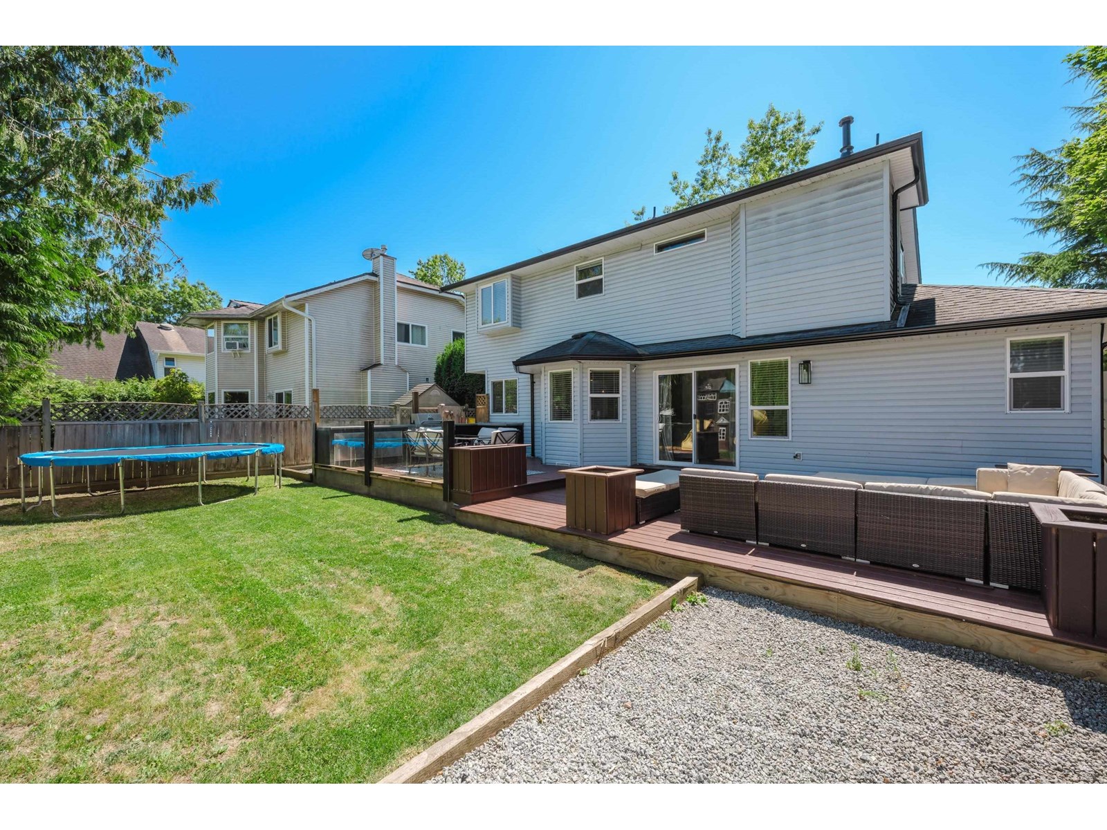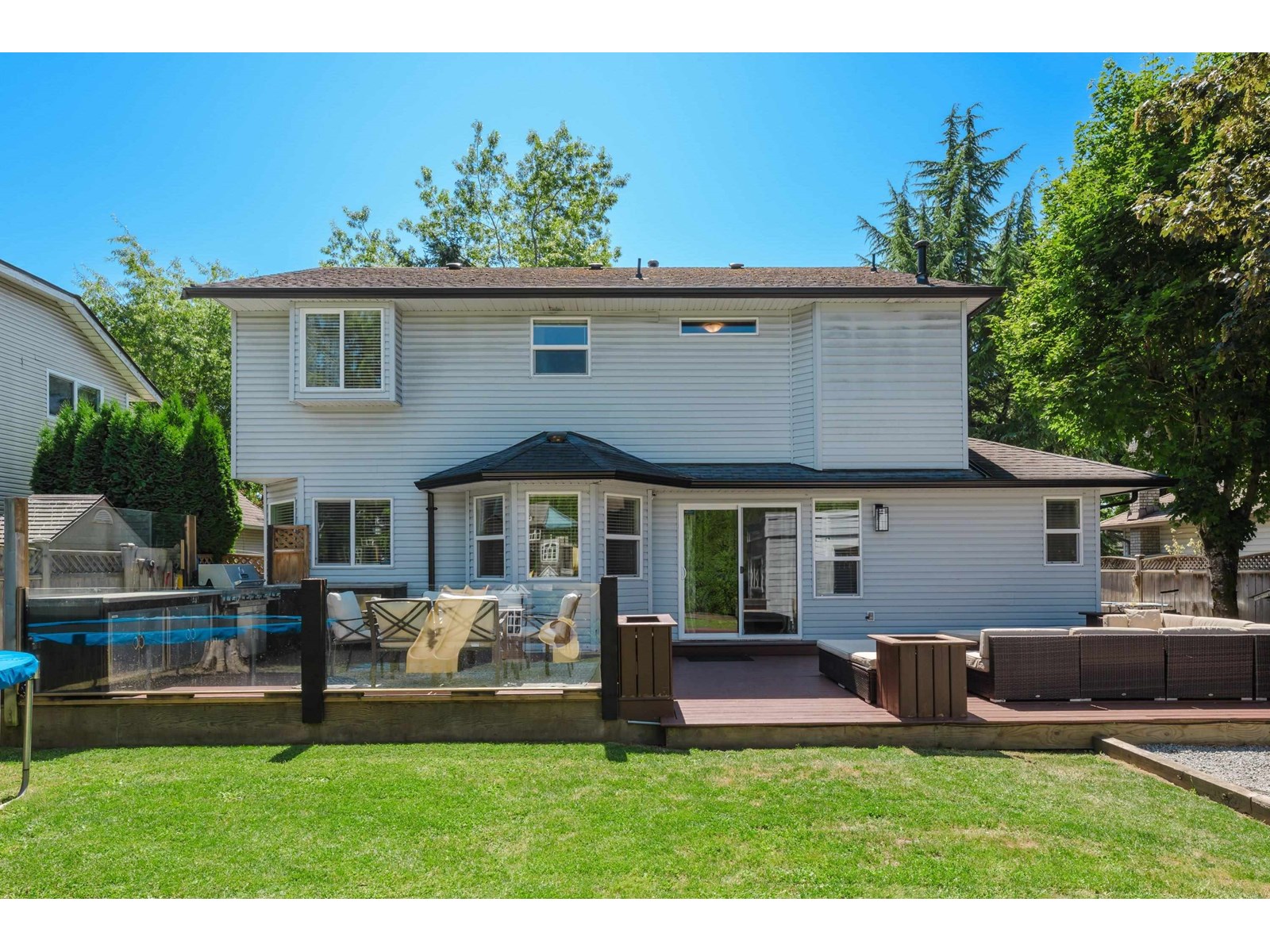 Beautiful 2-storey home on a quiet, tree-lined street in upper Murrayville. Main floor boasts wide plank hardwood flooring, crown moldings, a gorgeous renovated & expanded kitchen featuring extensive white shaker cabinetry, quartz counters, breakfast bar with pendant lighting, & stainless appliances incl double-wide fridge/freezer. Eating area w/ bay windows, and adjacent family room w/ glass doors leading to huge rear decks, private yard, and detached 230 sq ft rec room/flex space (ideal for teens or private office). Bdrm/flex rm, powder rm, and laundry. 3 spacious bedrooms up incl primary bdrm w/ sitting area and gorgeous ensuite. Bathrooms tastefully updated. Double garage, & RV parking! Great family neighbourhood close to parks, cafes, shops, schools, hospital, & WC Blair Rec Centre. (id:52823)