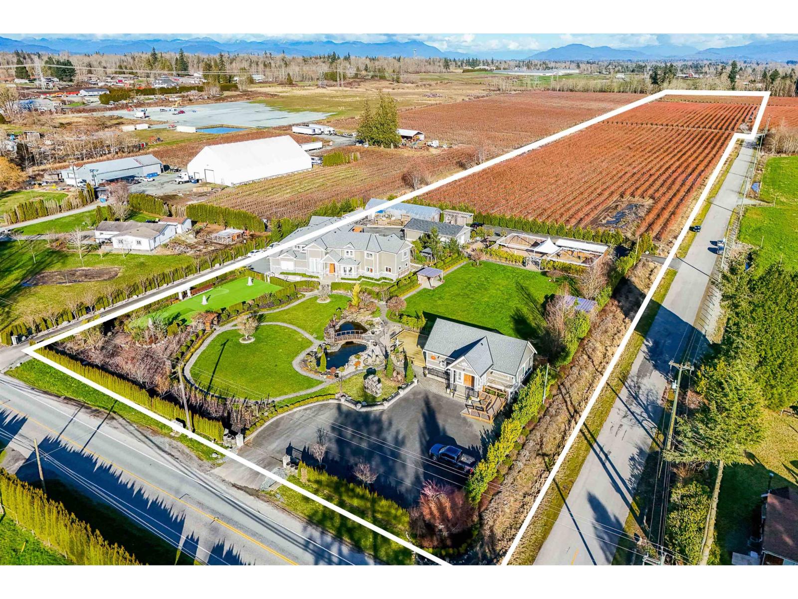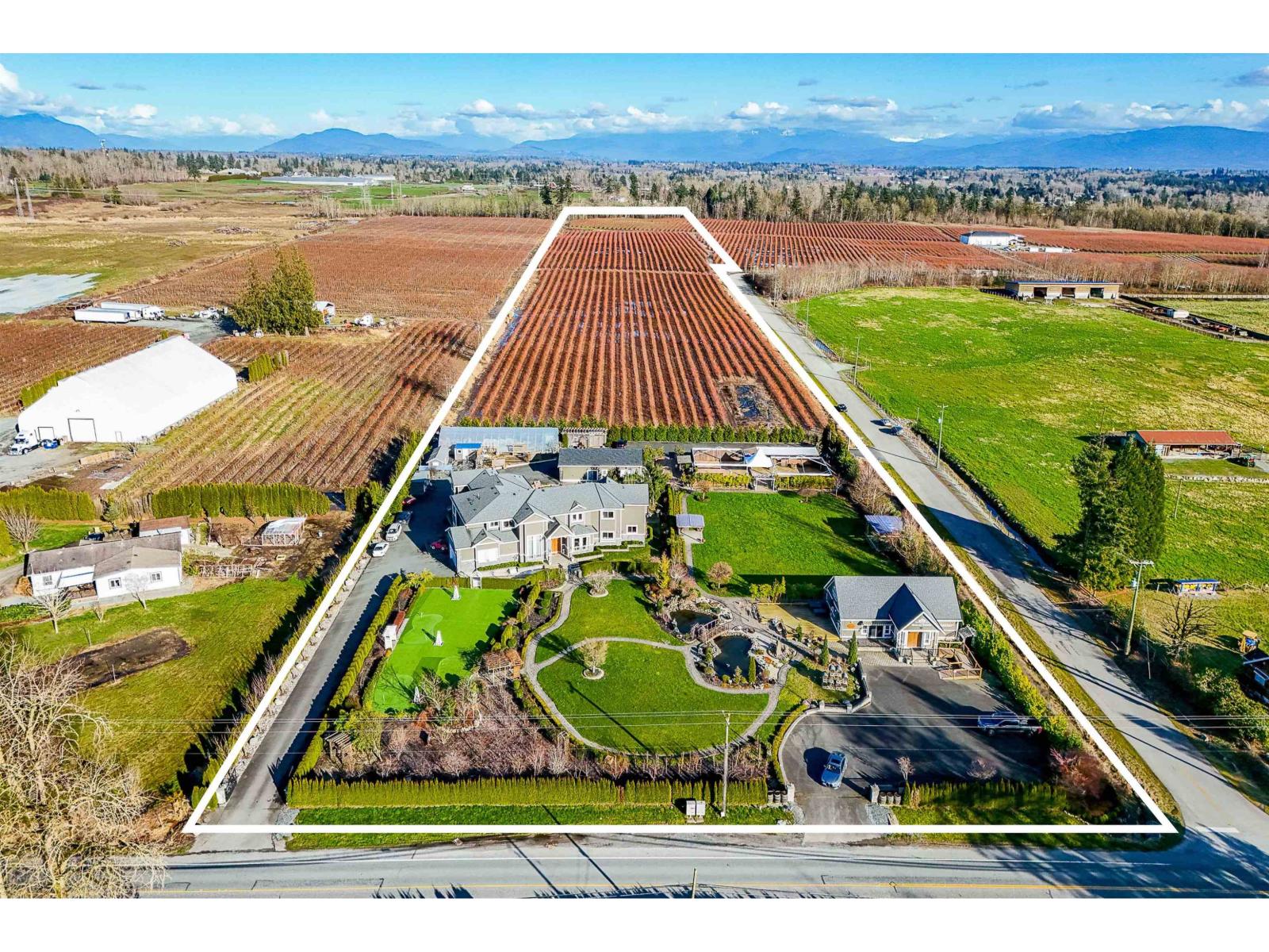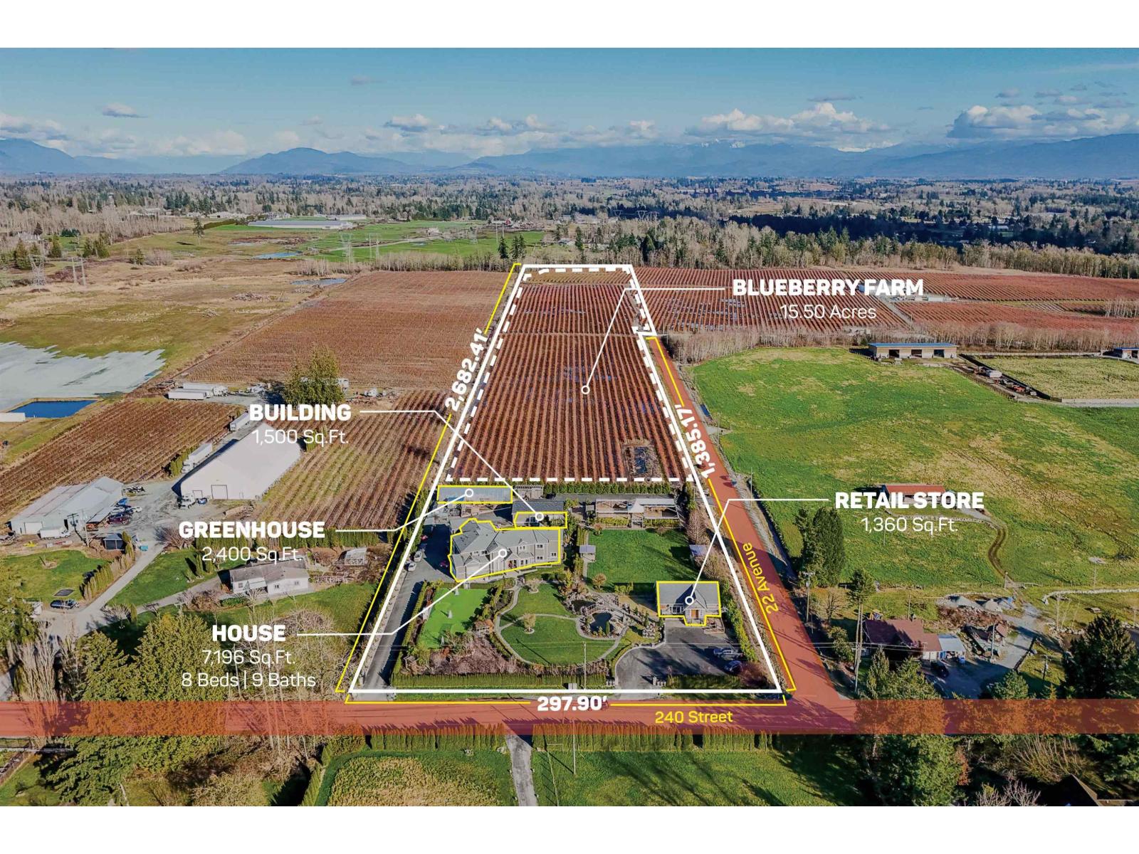 19.89 ACRES, Estate Home, Blueberry Farm, and Wedding/Event Venue! 7,196 SQ/FT Estate Home with 8 Bedrooms w/ ensuites and 9 Bedrooms with multi-generational living. Breathtaking views of Mount Baker, with manicured grounds, rose gardens, water features, wine tasting room, and a putting green. Several outbuildings, which include a 2,400 SQ/FT Greenhouse, a 1,500 SQ/FT Building, and a 1,360 SQ/FT Retail Store. Approx. 15.52 Acres planted in full production Blueberries. Close to all amenities and has easy access to Fraser Highway, Highway #1, and the USA Border. (id:52823)