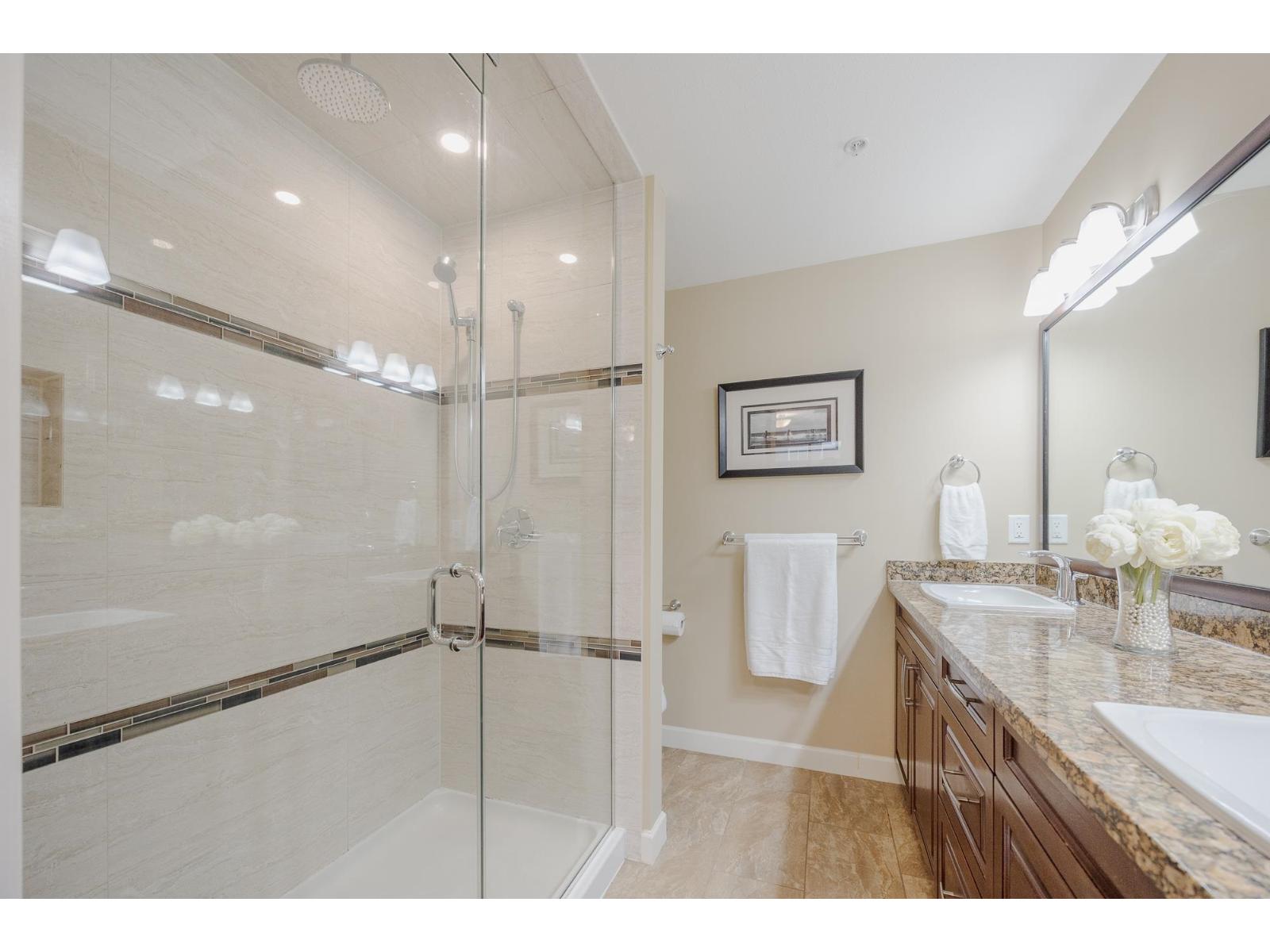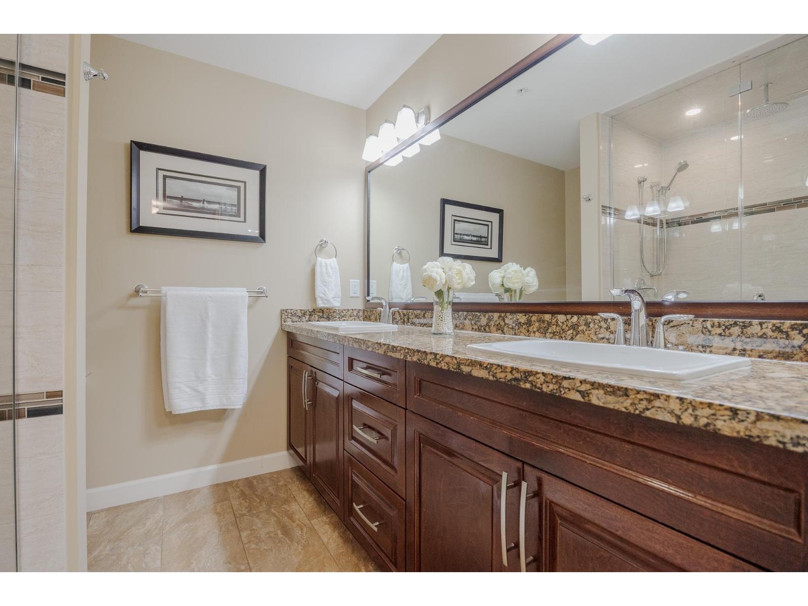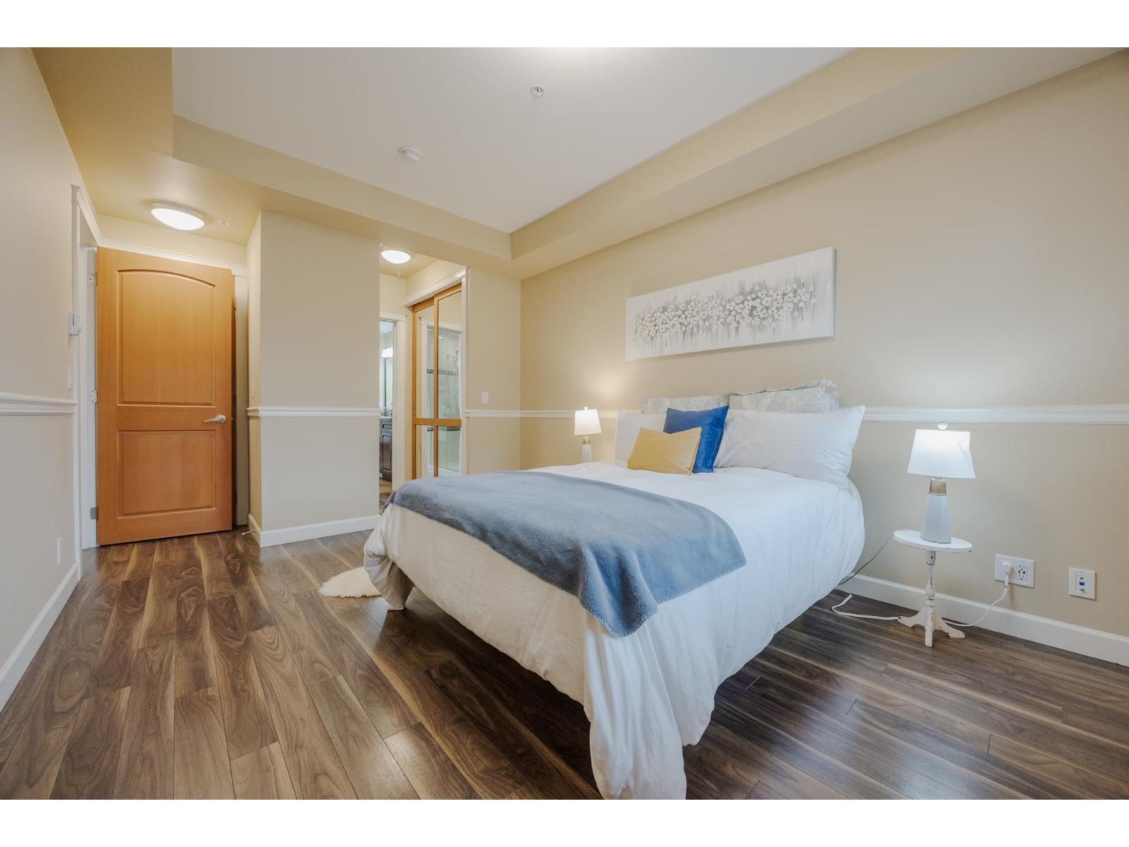 $465.04 MonthlyWelcome to Yorkson Creek Phase Two by Quadra Homes! This bright 1,100 sq ft condo offers 2 bedrooms, 2 bathrooms, 2 parking stalls, plus an oversized storage locker with roll-up door, lighting, and power. The open-concept layout features a chef-inspired kitchen w/ stainless steel appliances, granite countertops, & a sit-up breakfast bar. Spacious dining & living areas open to a 250 sq ft solarium-style deck. The primary bedroom fits a king-size bed w/ walk-through closets & a spa-inspired ensuite w/ double sinks, heated tile floors, & an oversized shower. The second bedroom offers great closet space & a full cheater ensuite. A large den w/ closet works as 3rd bedroom. Extras incl. pantry, in-suite laundry, 9' ceilings, & a quiet location near parks & HWY 1. Open house January 17 & 18 1-3pm (id:52823)