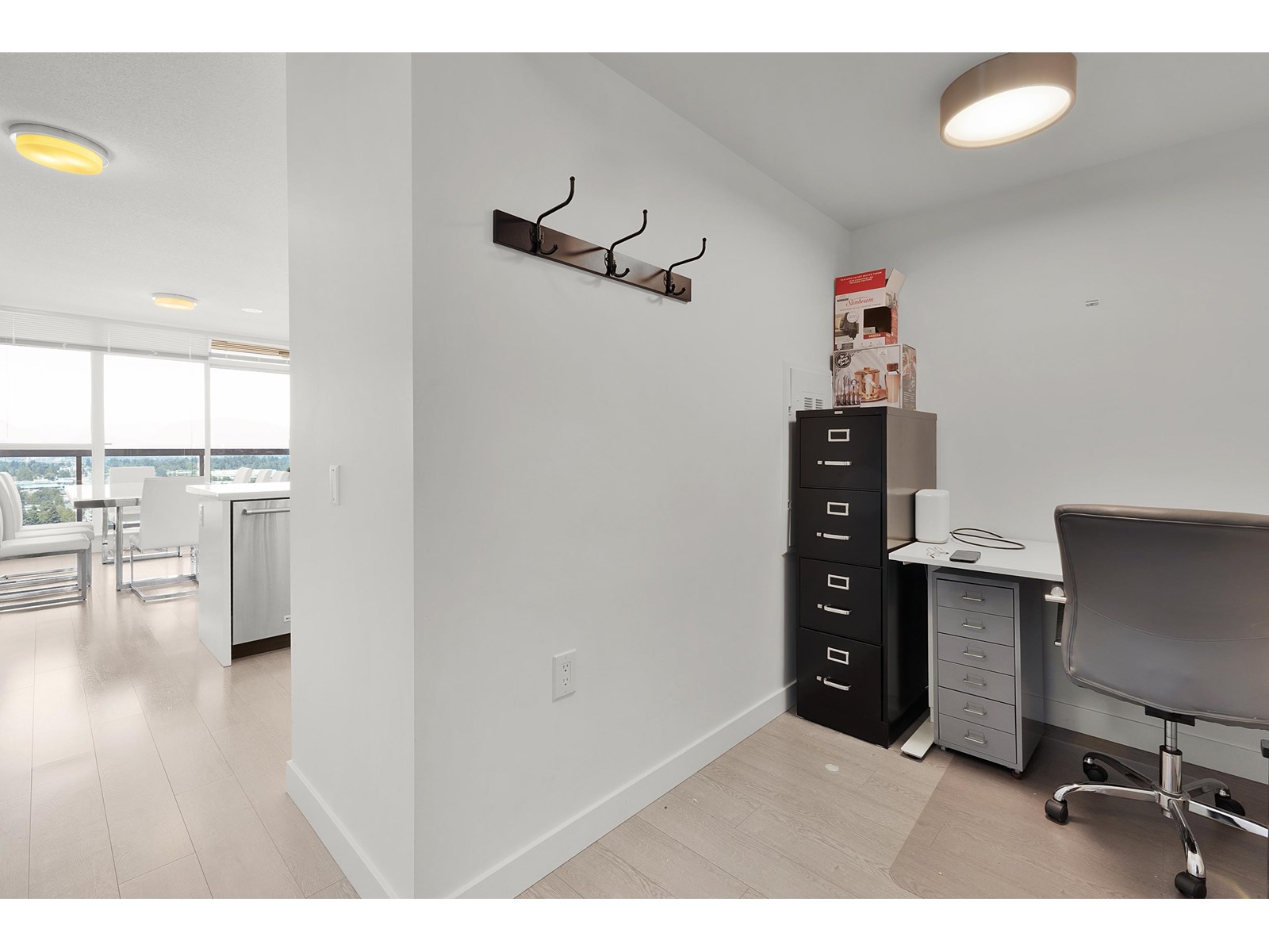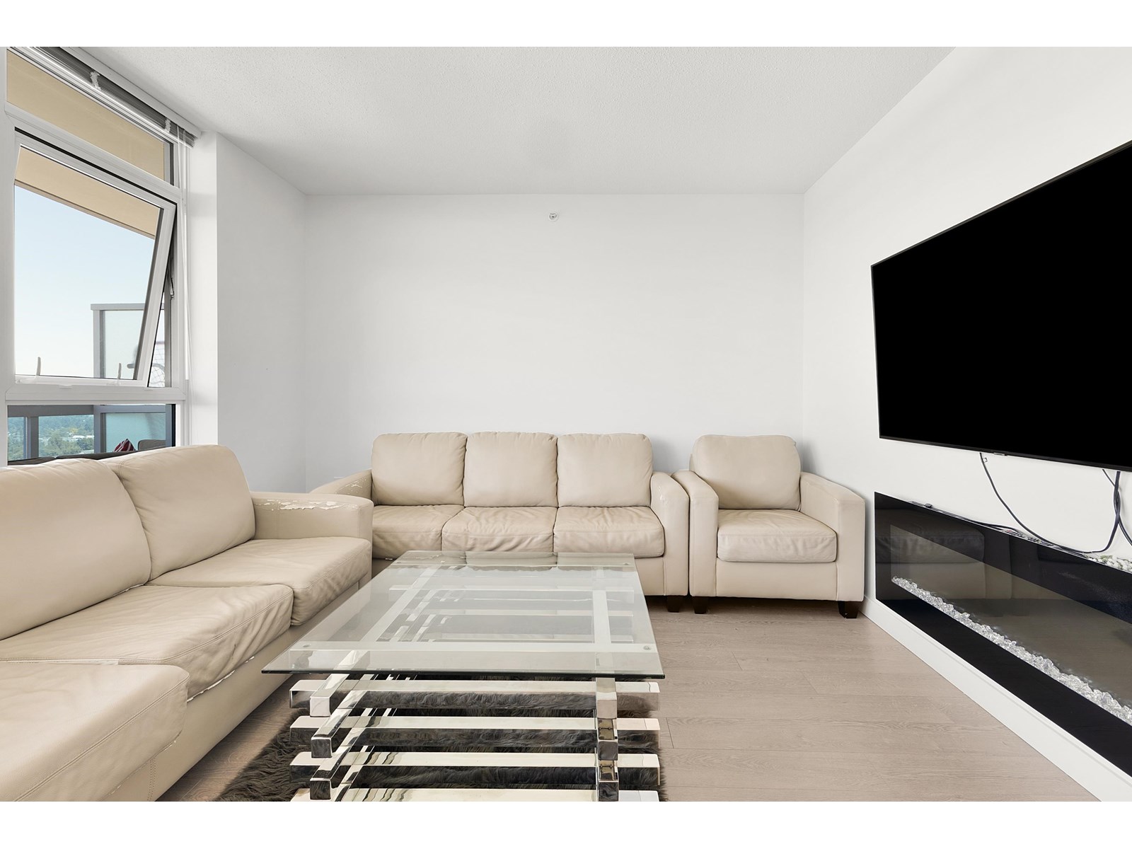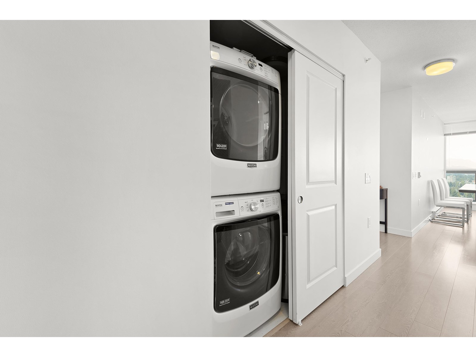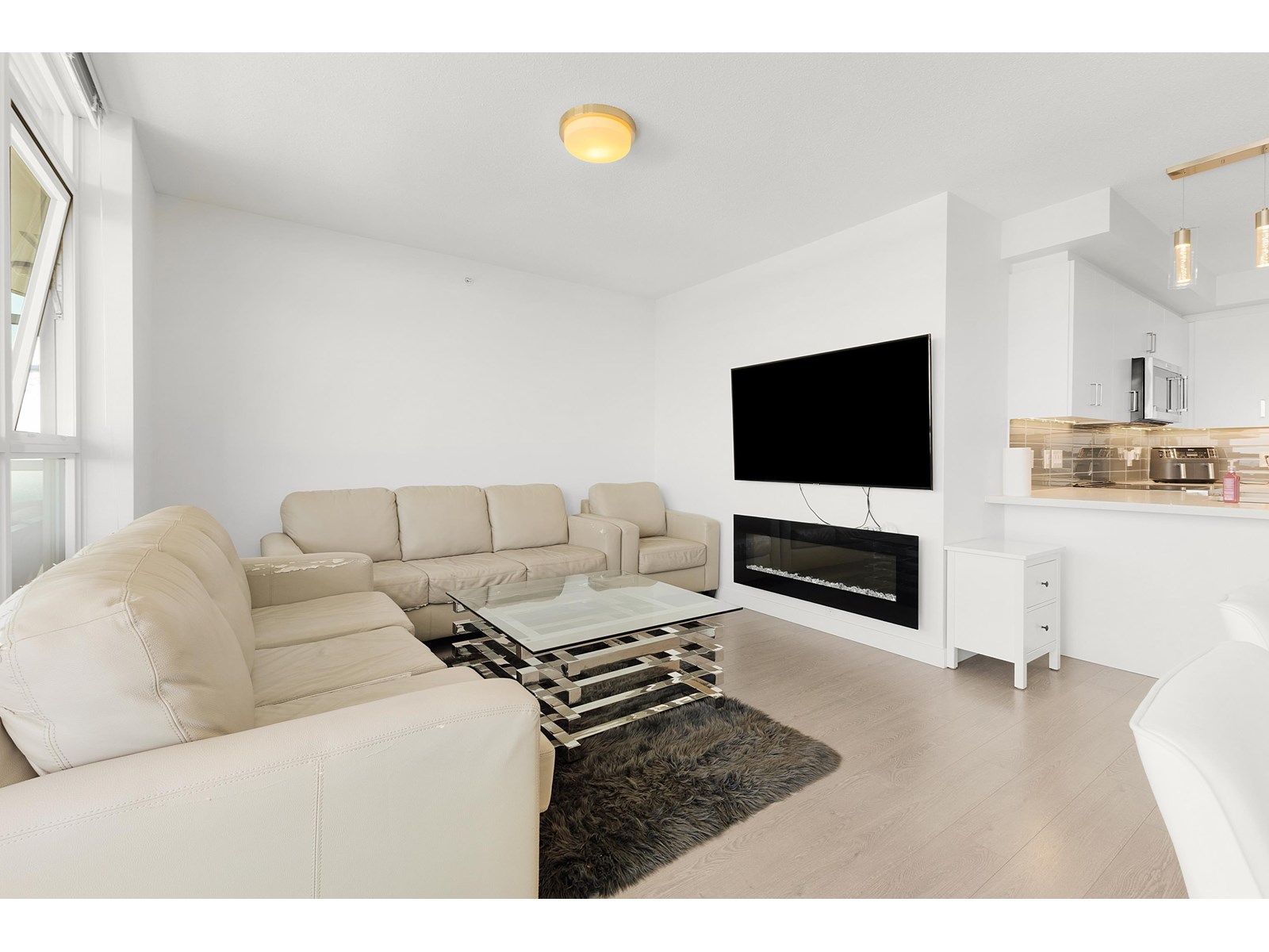 $572 Monthly2 BEDS, 2 BATHS + DEN!! Stunning Views of North Shore Mountains and SUNSETS from your private covered balcony perfect for BBQing all year round. Solid concrete construction w/sound and heat insulation, natural sunlight in all rooms w/floor to ceiling windows. Open Concept living w/8'6" ceilings incl. a wall mounted Electric Fireplace, top-of-the-line SS Kitchen-Aid Appliances, Quartz countertops & laminate floors throughout plus unit recently painted. Den at entrance & LARGE dining area to fit a table of 8. King Size Bedroom w/DELUXE 4 pce. ensuite & Walk in Closet. 2nd bedroom is queen size w/built-in closet & bathroom opposite. Amenities: gym, work spaces, entertainment room for parties w/games & media room. BONUS 2 Side by Side PARKING STALLS, Sunday-27 July-2-4 PM open House. (id:52823)