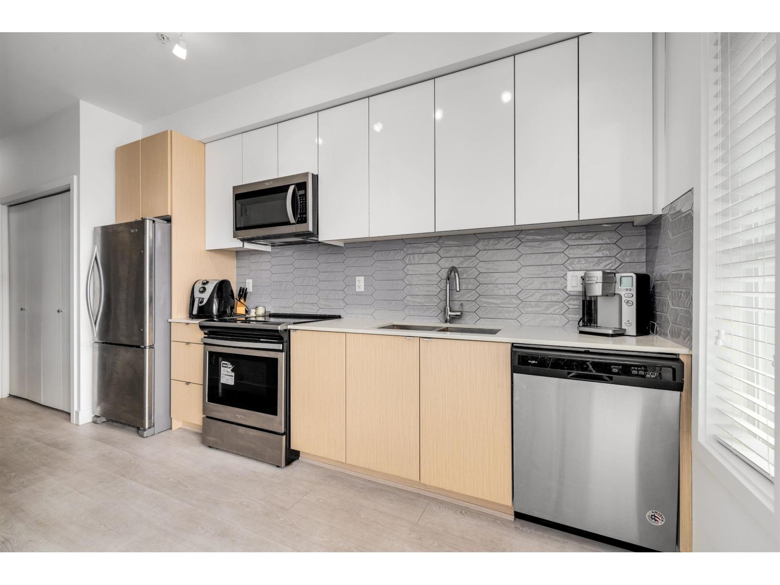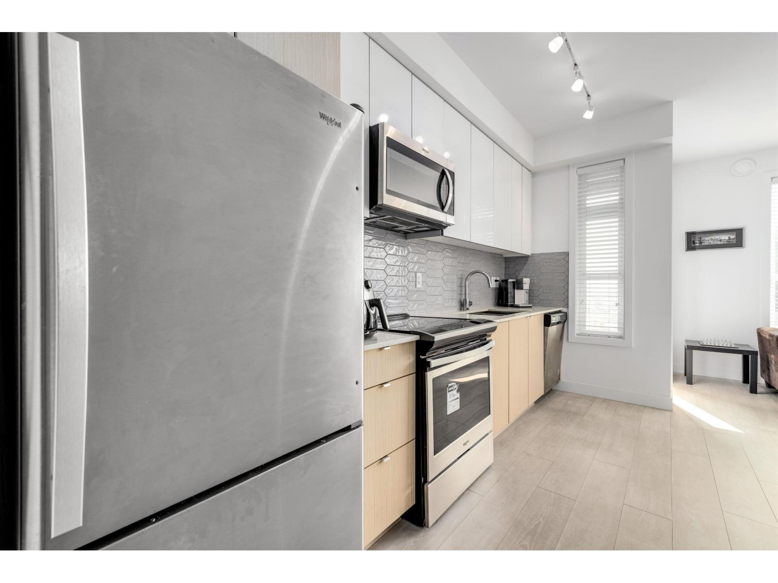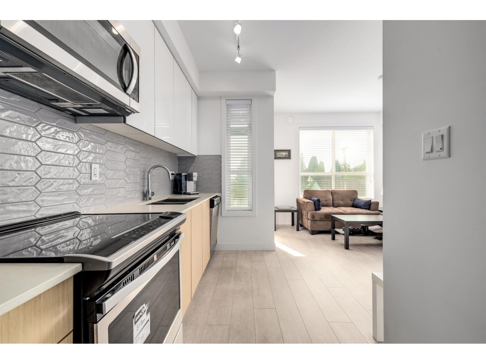 $203.88 MonthlyYALE BLOC 3 - Bright and modern 1 bed, 1 bath home with an efficient open layout and unobstructed mountain views from the living room and balcony. The sleek kitchen features Caesar stone quartz counters, bold marble tile backsplash, and S/S Whirlpool appliances. Enjoy plenty of natural light, in-suite laundry, plus 1 parking and 1 storage. Fantastic building amenities include a fitness centre, guest suite, and party room. Pets and rentals allowed with no restrictions-a great option for both first-time buyers and investors. Walking distance to Willowbrook Shopping Centre, Kwantlen University, Cactus Club, and close to the upcoming SkyTrain extension. (id:52823)