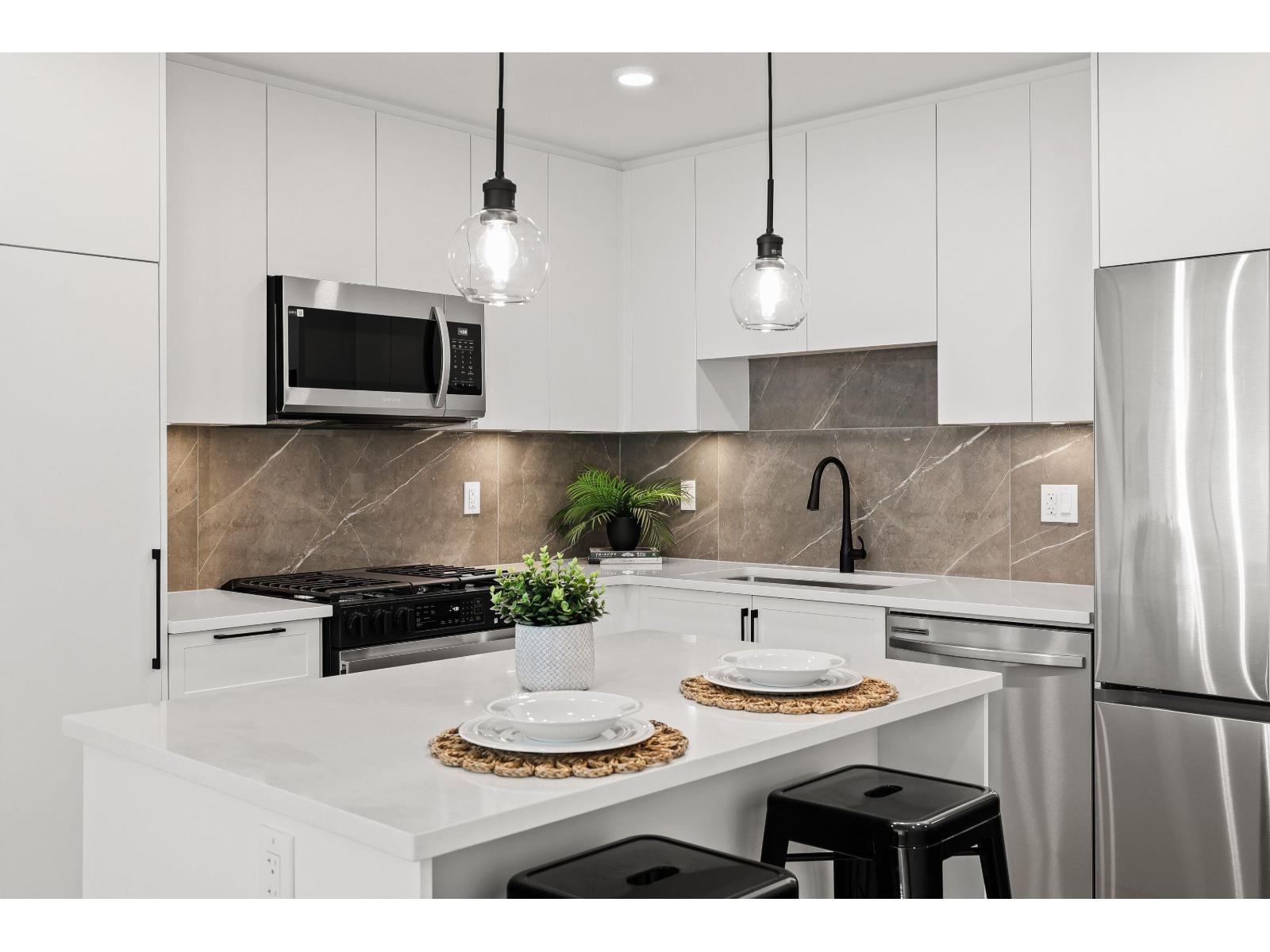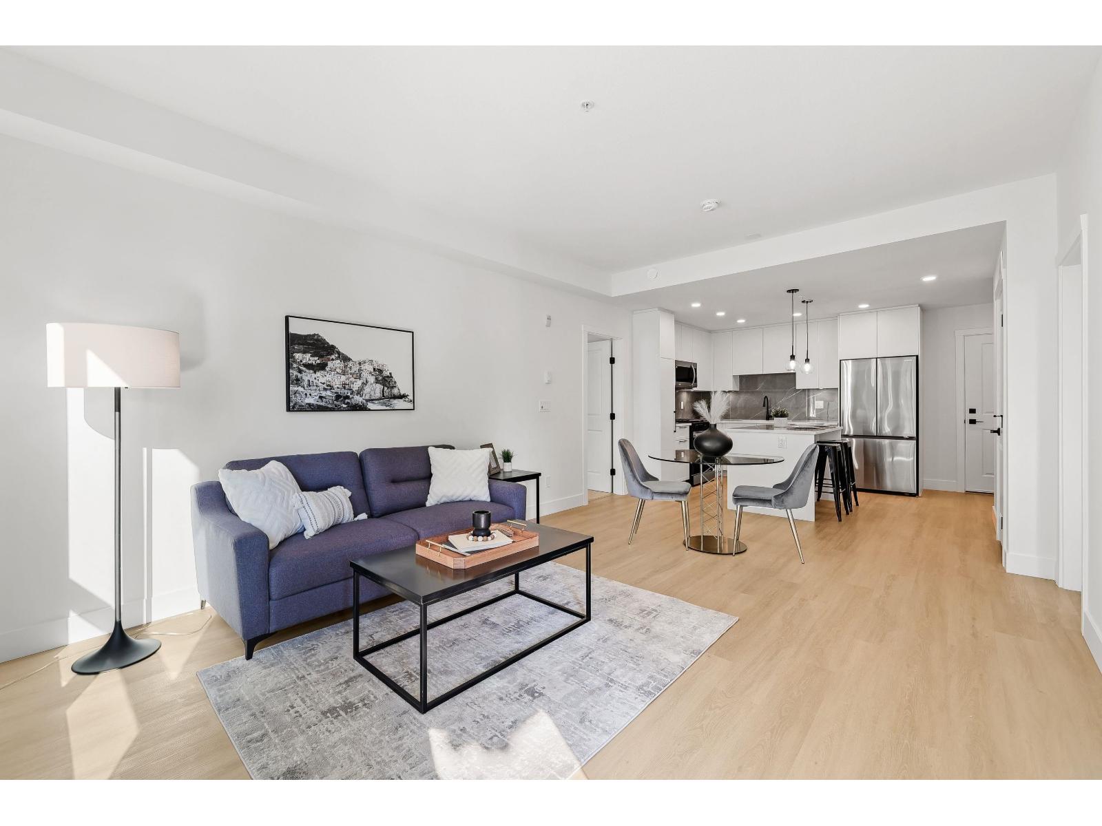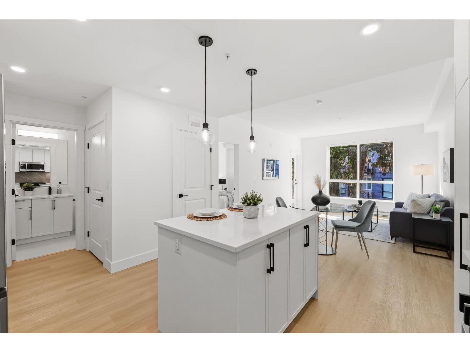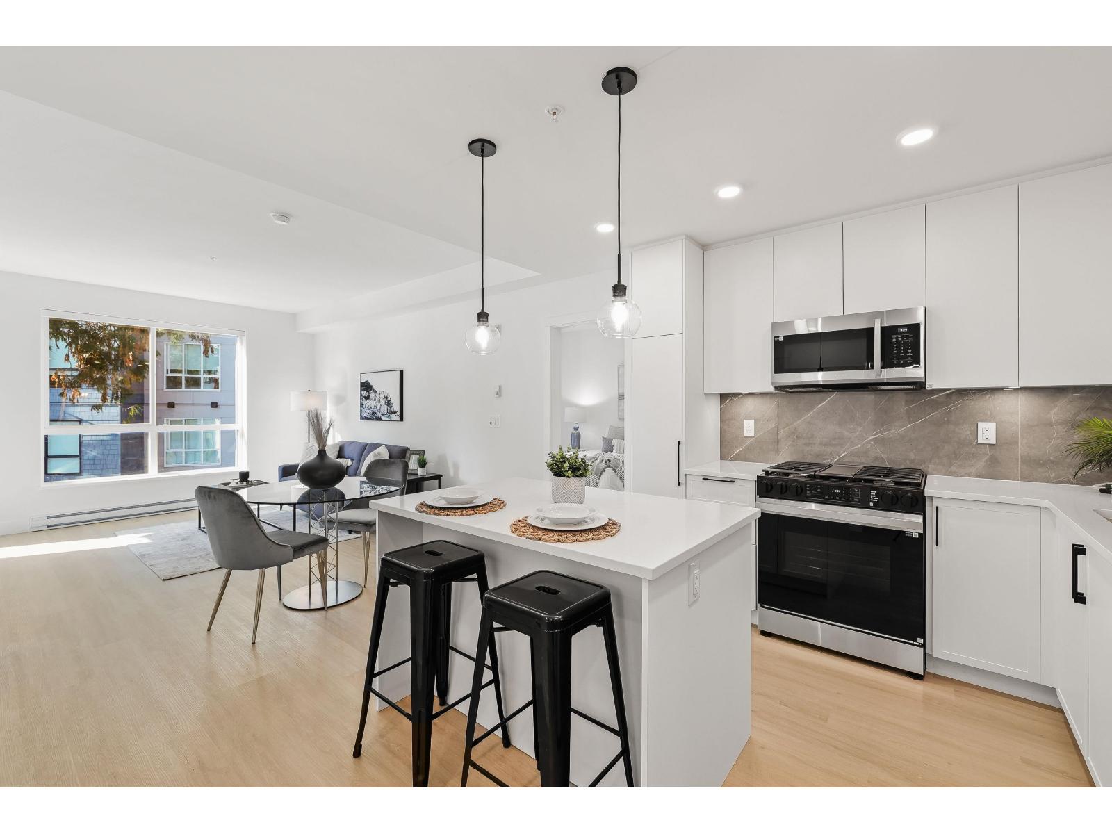 $397.08 MonthlyNEW MODERN 2Bdrm/2Bth Condo in South Surrey's MOST desired neighborhood! Island kitchen boasts SS appliances, Gas Stove PLUS ample floor-to-ceiling cupboards & gorgeous backsplash . Bright & Airy Suite offers beautiful wide plank laminate throughout, lots of NATURAL light PLUS in-suite laundry. GENEROUS Primary w/3pc ensuite & large walk-in closet + COMFORTABLY fits a King-Sized bed. Second Bdrm conveniently located on other side of unit--allows for Privacy. Complex offers beautiful, private grounds w/patio area, a gym PLUS a Guest suite for rent for family/friends. Parks, shopping & transit just steps away. Located on opposite side of building from King George Hwy. EASY TO SHOW! (id:52823)