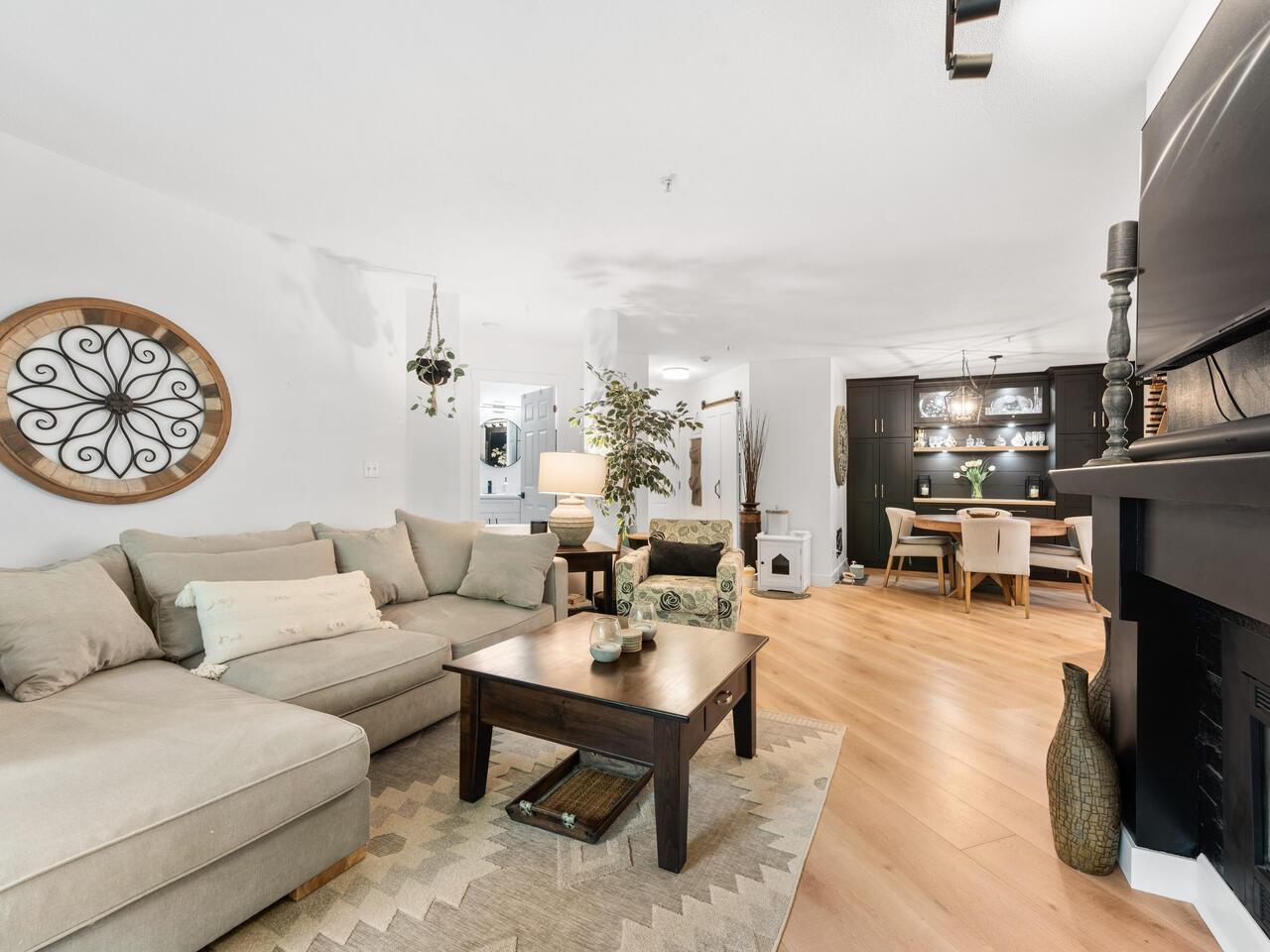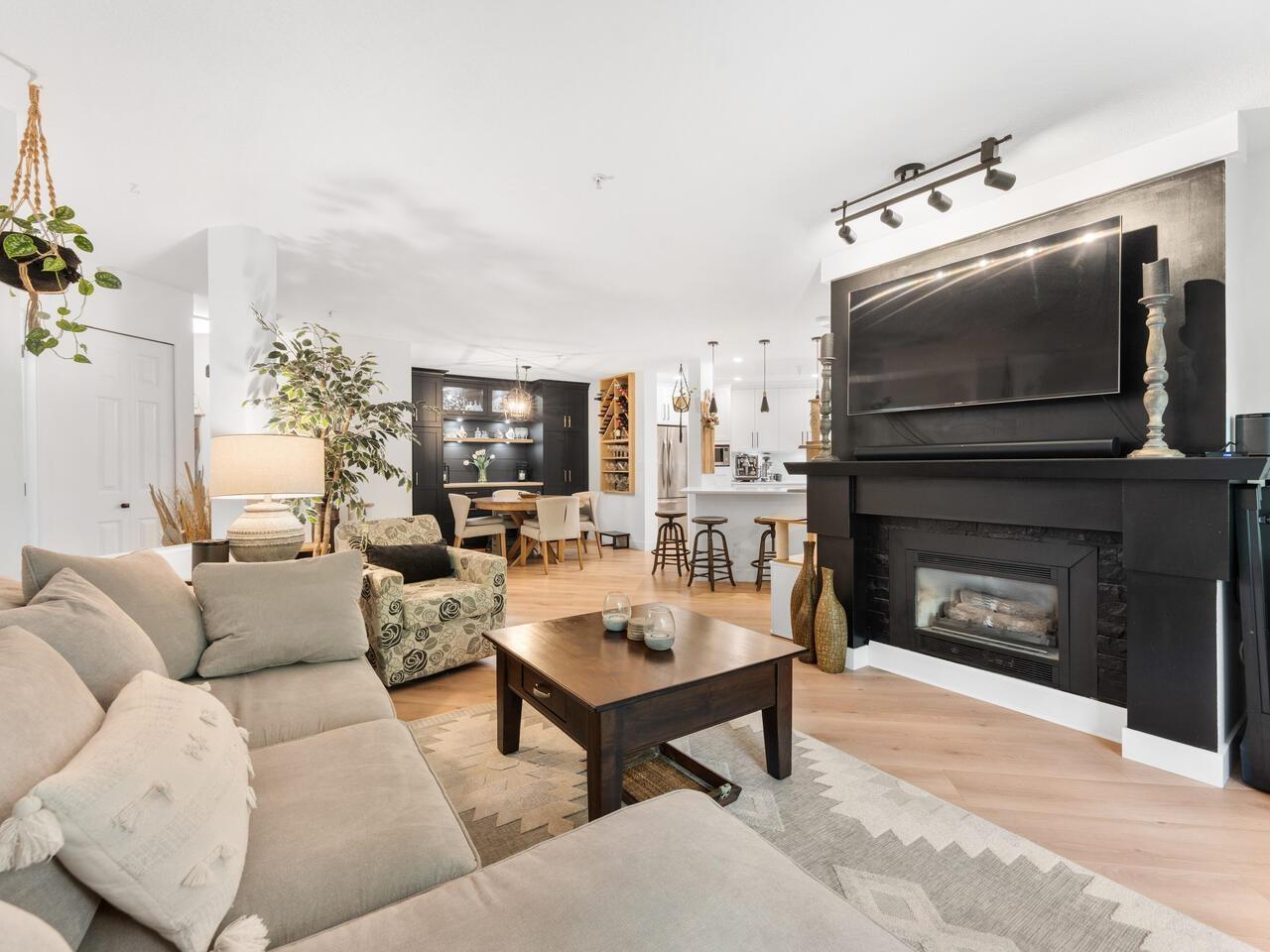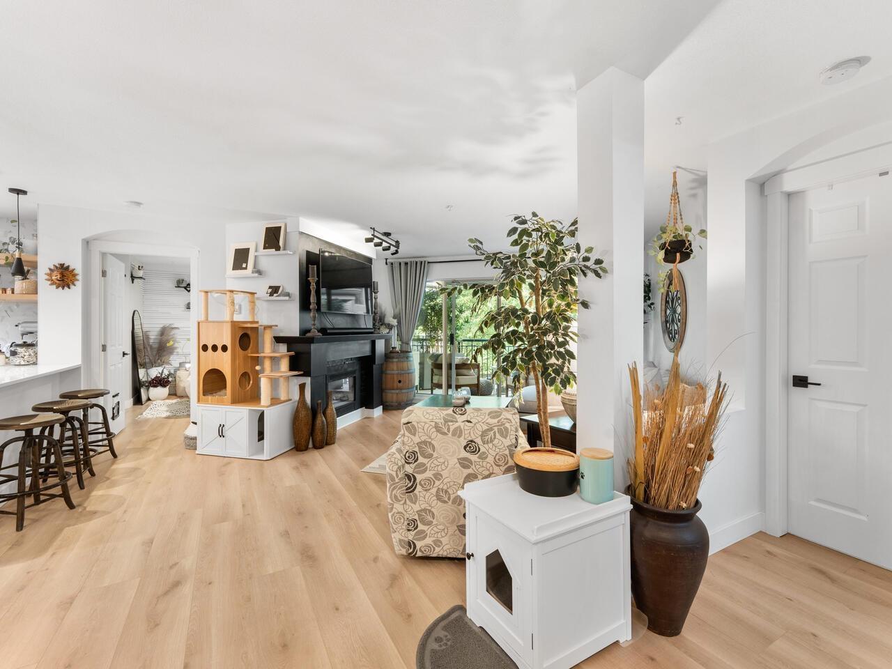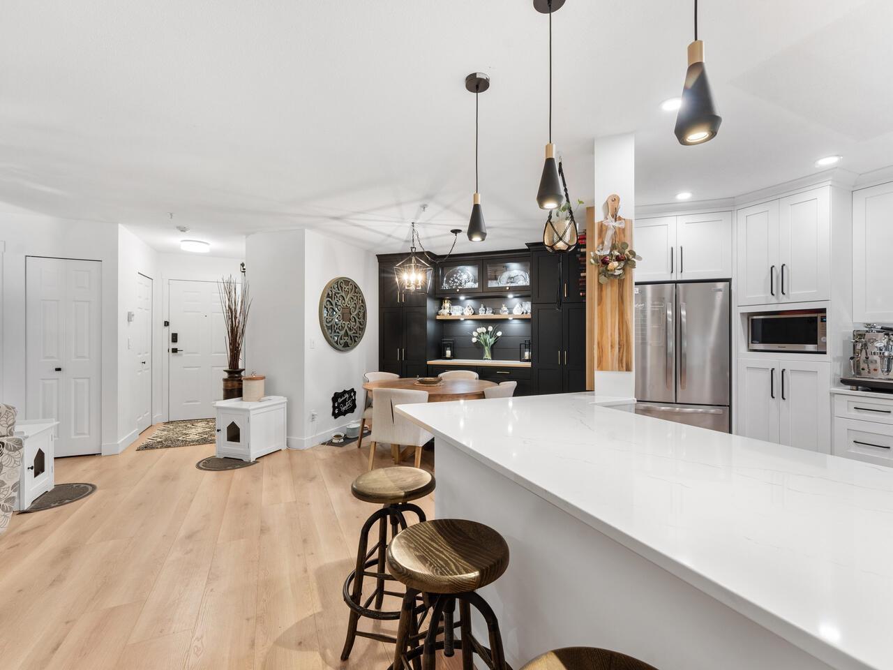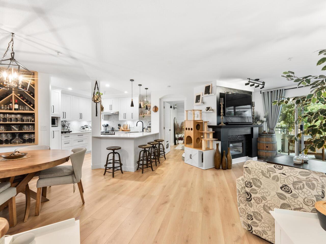 $534.20 MonthlyAbsolutely gorgeous 1,151 sf, 2 bdrm, 2 bath extensively updated condo with high end renovations including gorgeous wide plank floors, tasteful décor, updated light fixtures, entertainment sized living rm with gas fireplace & door to patio, spacious dining rm with attractive built-ins, gorgeous updated kitchen w/white shaker style cabinets, SS appliances and quartz counters w/breakfast bar, 2 spacious bdrms & 2 extensively updated baths including primary bdrm w/wi closet & spectacular 4 pce ensuite. Fantastic floor plan with the 2 bdrms separated from each other by the living area provides the utmost in privacy. 2 parking stalls and storage locker are added value. Very spacious absolutely gorgeous updated condo with fantastic layout in prime Murrayville location absolutely must be seen. (id:52823)
