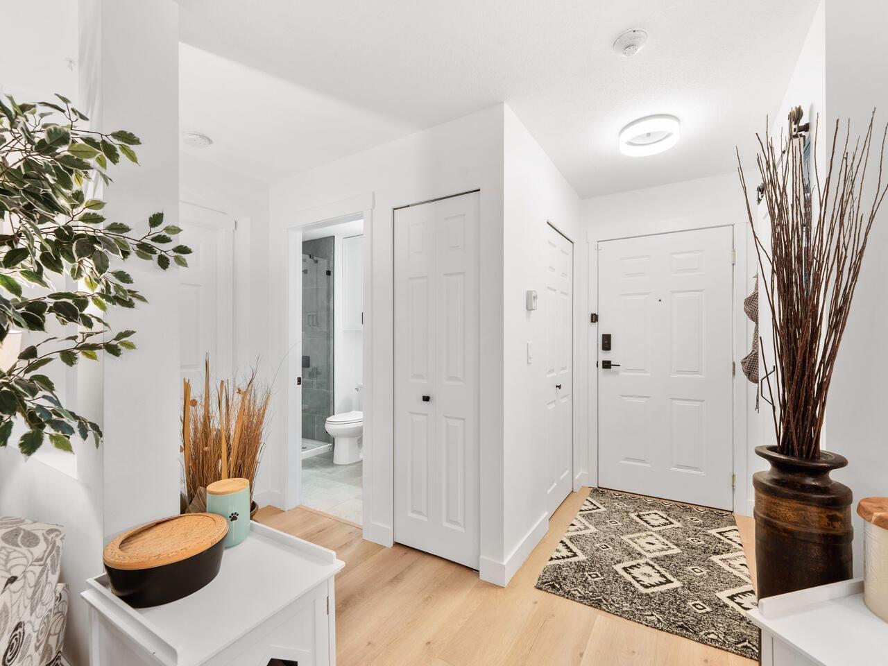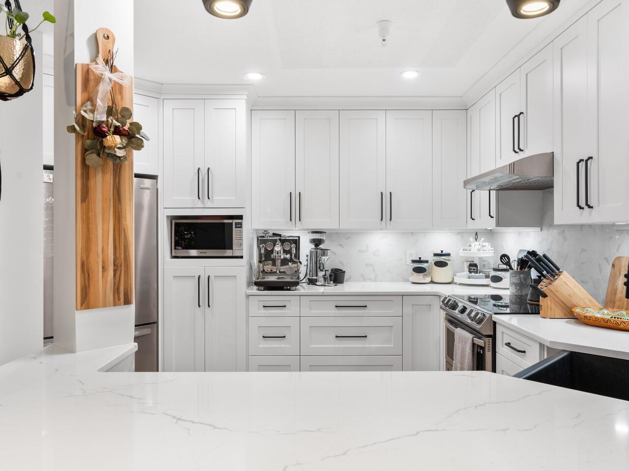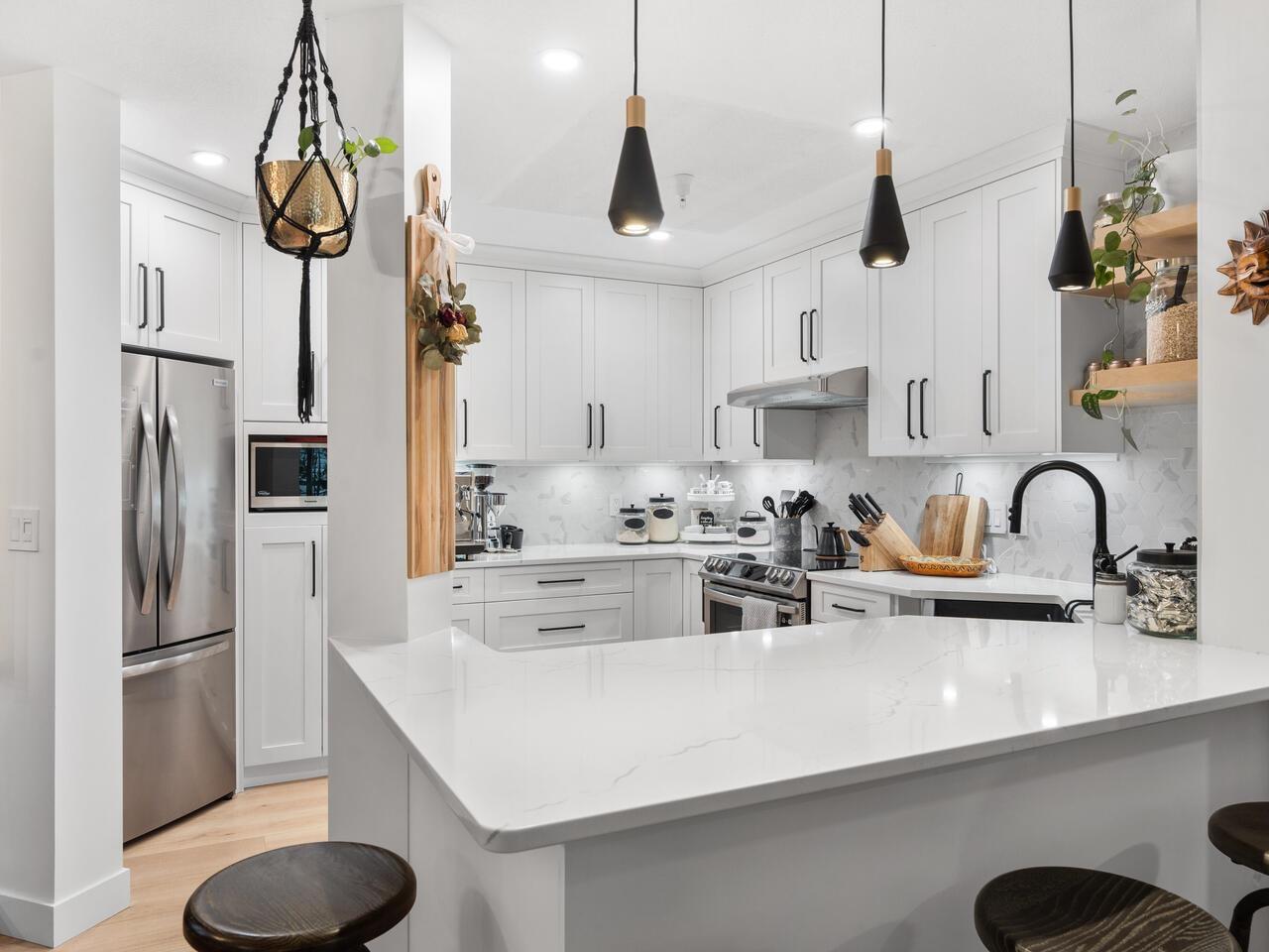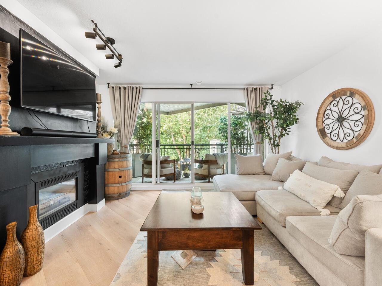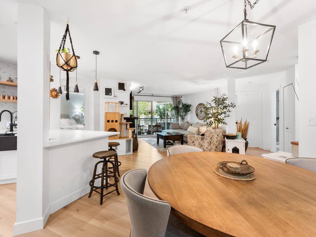 $534.20 MonthlyAbsolutely gorgeous 1,151 sf, 2 bdrm, 2 bath extensively updated condo with high end renovations including gorgeous wide plank floors, tasteful décor, updated light fixtures, entertainment sized living rm with gas fireplace & door to patio, spacious dining rm with attractive built-ins, gorgeous updated kitchen w/white shaker style cabinets, SS appliances and quartz counters w/breakfast bar, 2 spacious bdrms & 2 extensively updated baths including primary bdrm w/wi closet & spectacular 4 pce ensuite. Fantastic floor plan with the 2 bdrms separated from each other by the living area provides the utmost in privacy. 2 parking stalls and storage locker are added value. Very spacious absolutely gorgeous updated condo with fantastic layout in prime Murrayville location absolutely must be seen. (id:52823)