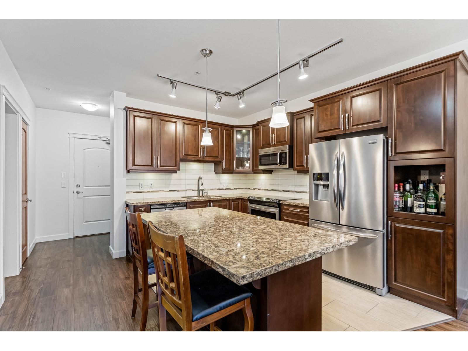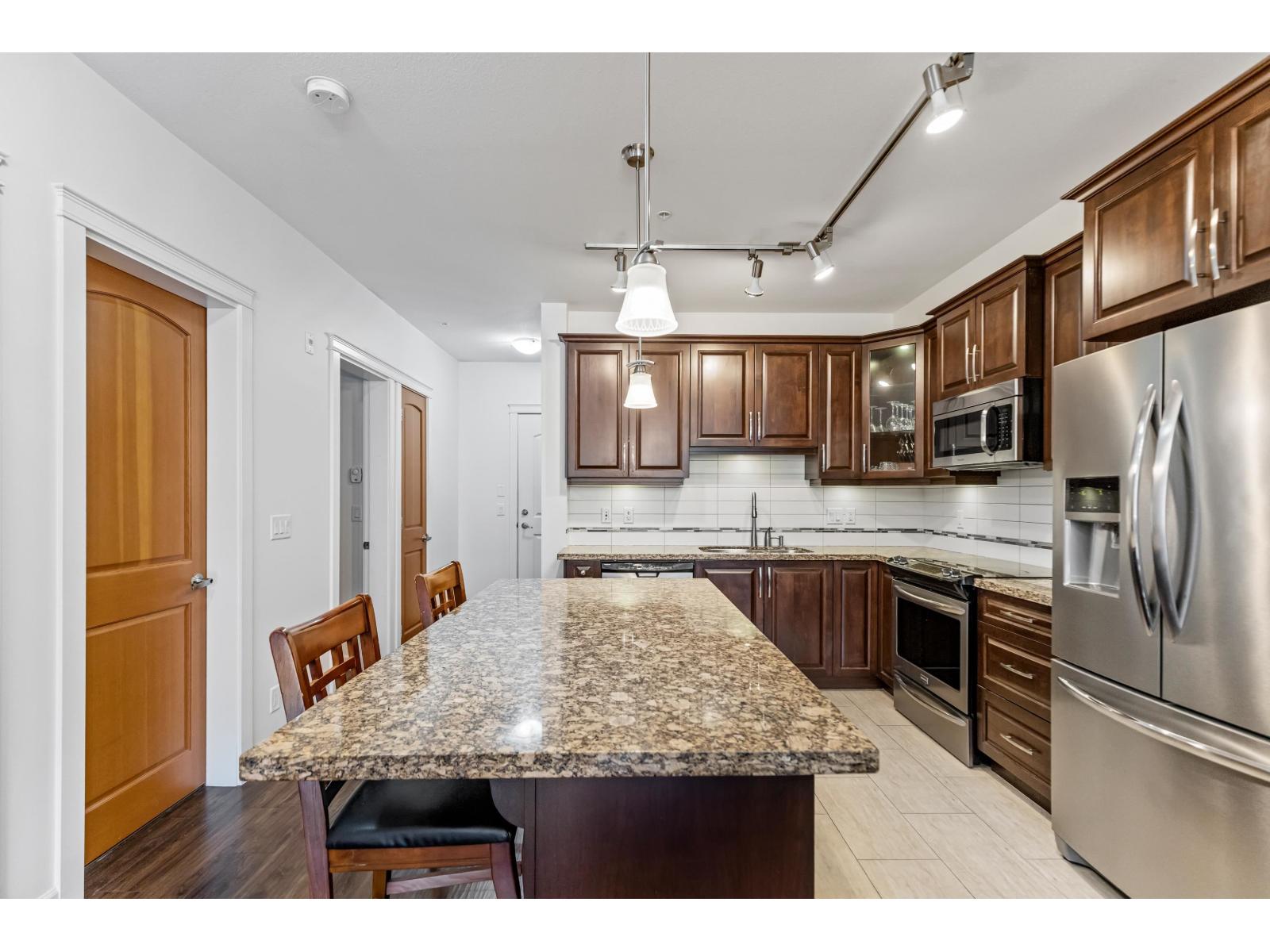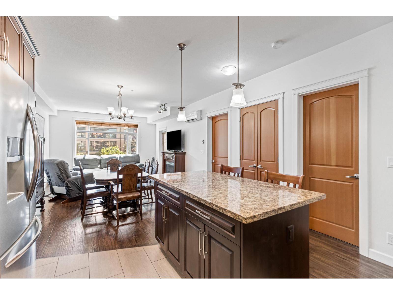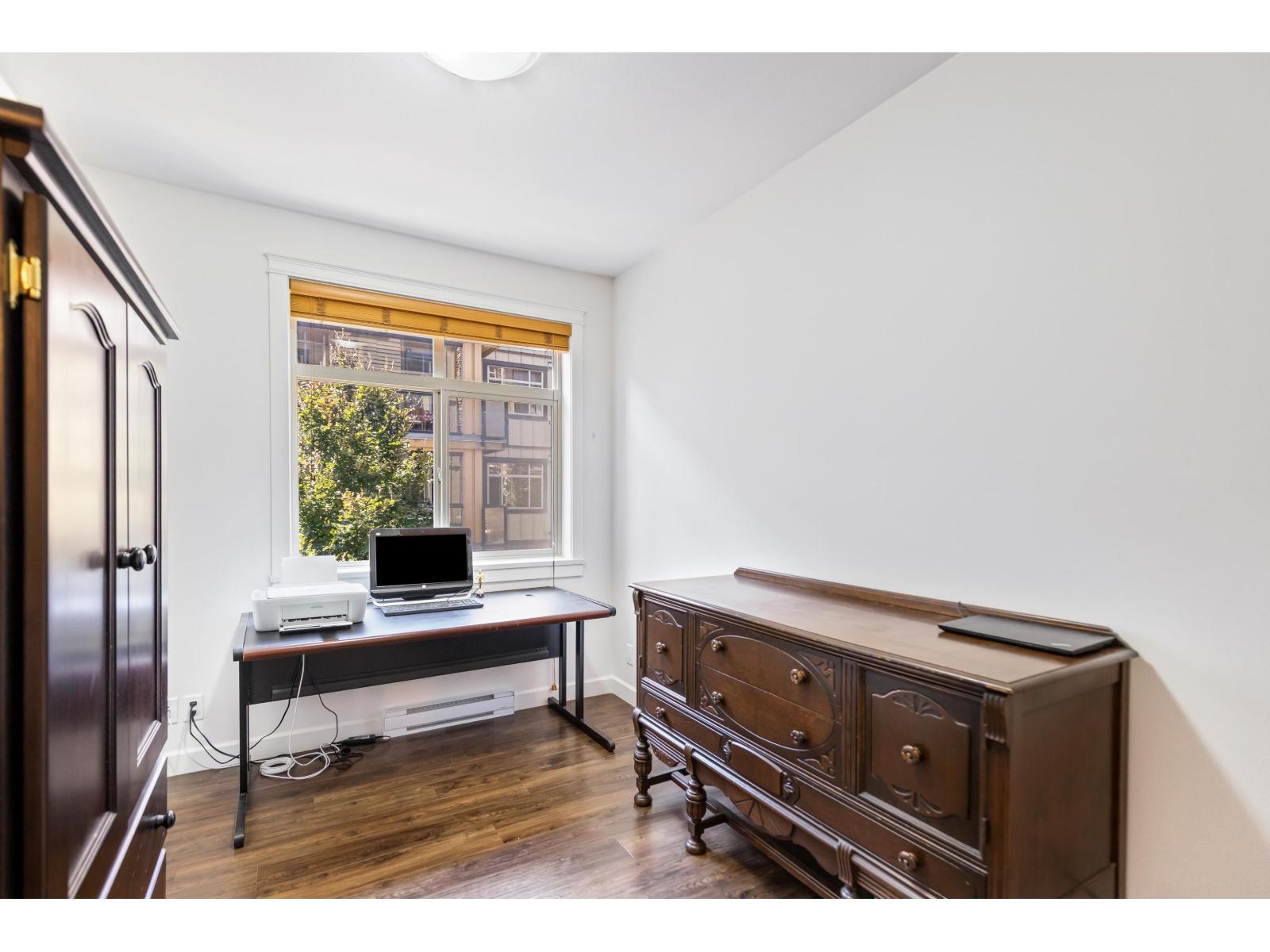 $368.06 MonthlyStunning 2 bed, 2 bath + den (or 3rd bed) corner unit in sought after Walnut Ridge at Yorkson by Quadra Homes. This 1,035FT home features a spacious open layout w/ bedrooms on opposite sides of living for added privacy. Enjoy year round use of the 224FT covered, south facing, wrap around balcony, w/retractable glass, overlooking peaceful courtyard. Chef's kitchen boasts s/s appliances, granite countertops, quality cabinetry & large island. Primary suite inc/walk-in closet & spa like ensuite with large shower. Freshly painted with luxury touches like A/C, heated bathroom floors & anti-fog mirrors. Includes 2 parking stalls & oversized storage w/ electrical outlet & roll-up door. In the heart of Willoughby Heights close to schools, parks, transit, restaurants, shopping & Hwy1 access. (id:52823)