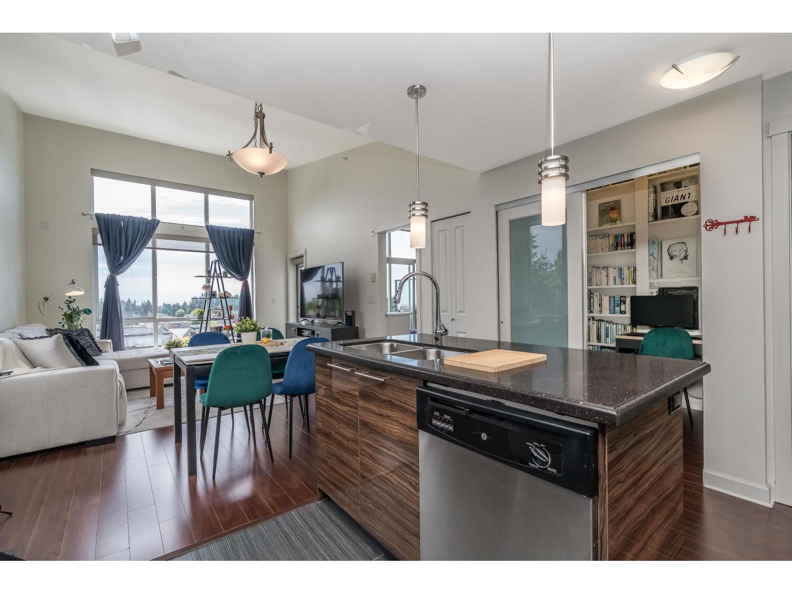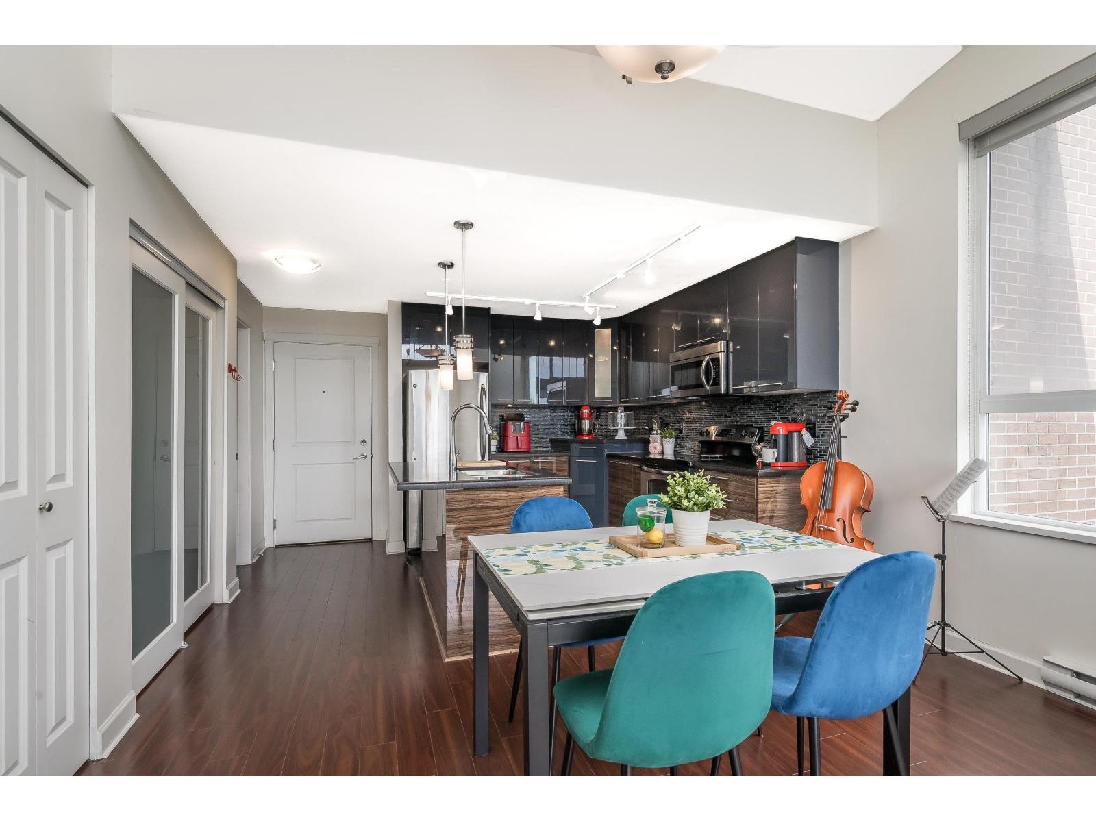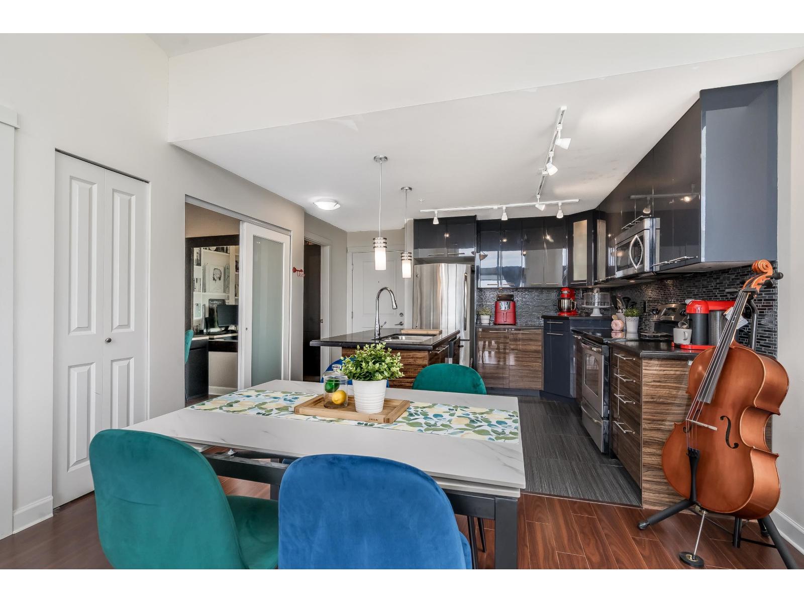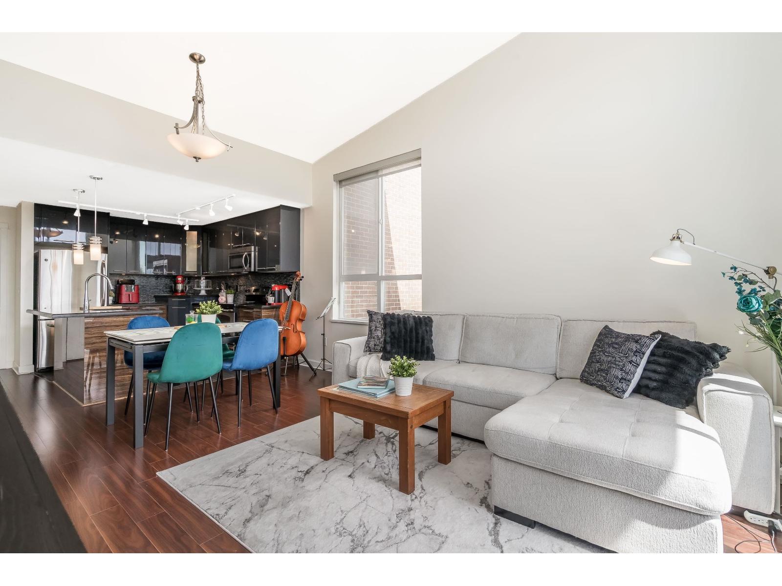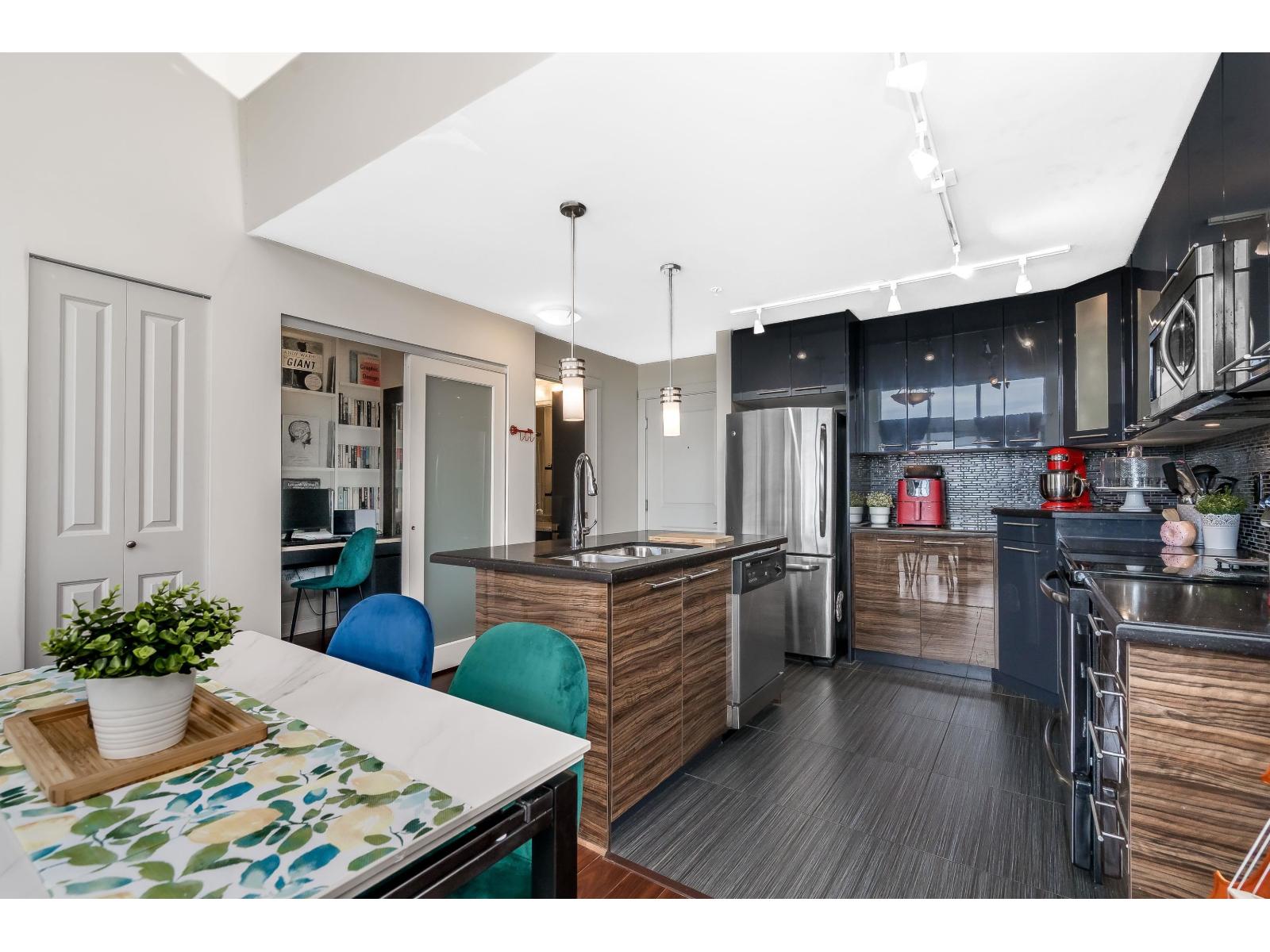 $318.75 MonthlyLuxor Presents: Top Floor Corner Unit 1 Bed PLUS Den! Kitchen features high gloss two tone cabinetry, stainless steel appliances, island with double sink, and quartz counters. Open floorplan with 11ft ceilings, eating area, living room with oversized windows, and den! Spacious primary bedroom with south facing patio and sweeping city views. Attached you will find a 4 pc ensuite and in suite laundry. Unit comes with 1 parking stall and 1 locker. Complex has guest suite, gym, and media room. Walking distance to all amenities: shopping, parks and transit. Quick access to Highway 99 and Alex Fraser Bridge. (id:52823)