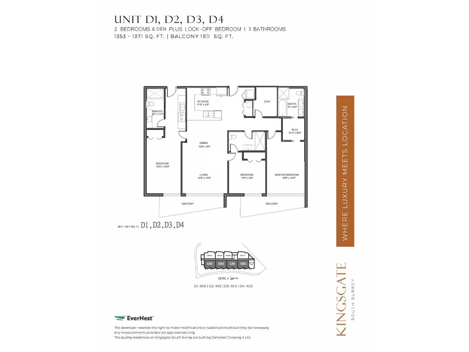 $534.69 MonthlyKingsgate-where architectural elegance meets everyday comfort. This unique corner 2 Bed + Den + Studio Lock Off offers over 1,370 SQFT-ideal for multi-generational families, rental flexibility, or live-work setups. Located in a central South Surrey location, close to everyday essentials. Features include premium laminate flooring, Fisher & Paykel appliances, and a spa-inspired bathroom with quartz finishes. Step out onto a 125 SQFT balcony with BBQ gas hookup and enjoy central heating & cooling year-round. Includes parking, storage, and access to elevated amenities: fitness centre, yoga studio, and outdoor firepit. Completing Spring 2026. (id:52823)