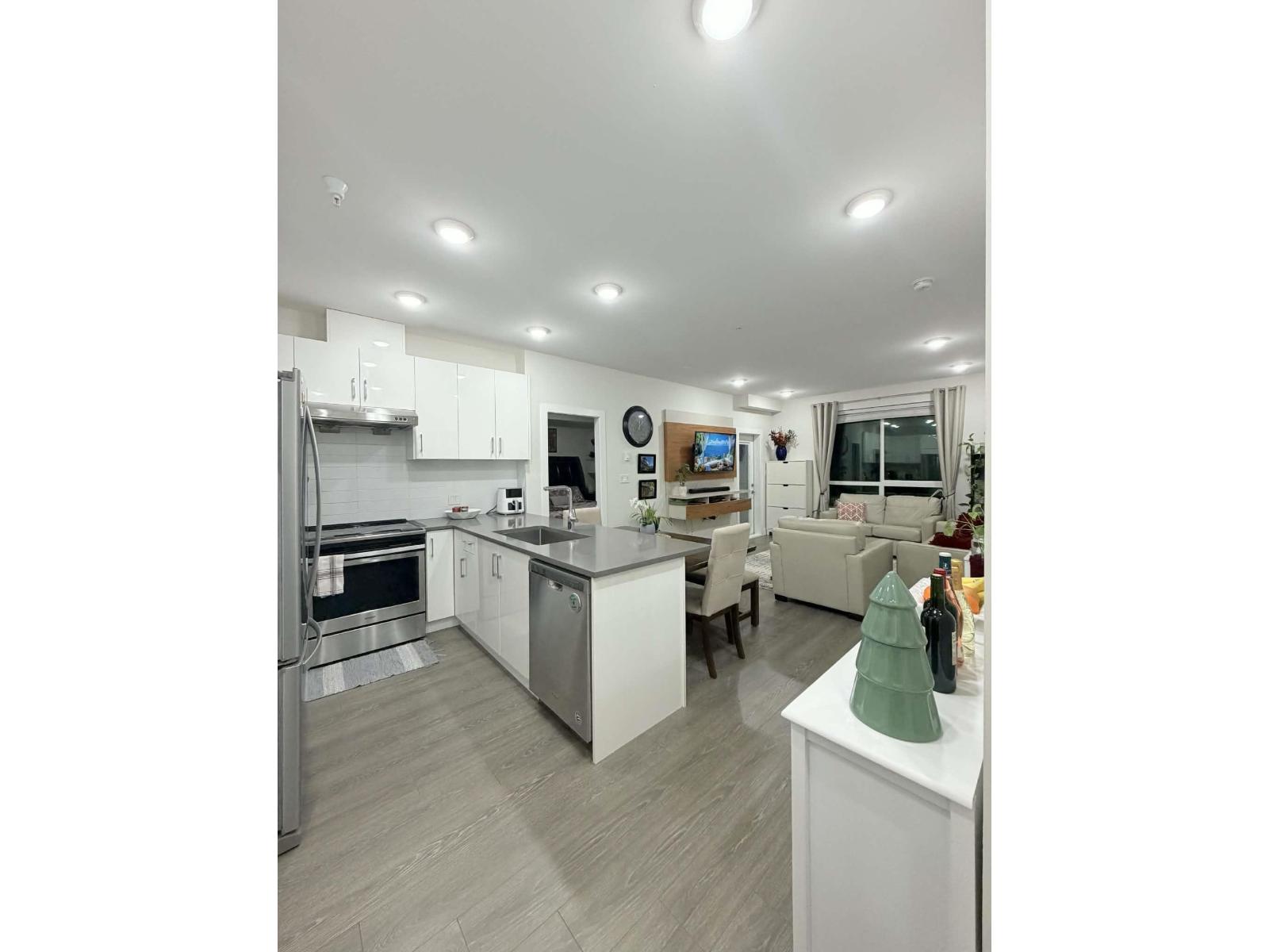 A quality-built, contemporary residence in the heart of highly sought-after Guildford. This impressive corner unit with 9-foot ceilings offers exceptional natural light and a spacious open-concept layout, all within walking distance to shopping, dining, transit, schools, and everyday amenities. This beautiful home features premium s/s appliances, a high-efficiency washer and dryer, and sleek high-gloss cabinetry with soft-close doors and drawers. Enjoy elegant quartz countertops with undermount square sinks in all bathrooms, oversized porcelain tile flooring and shower/tub surrounds, and a deep soaker tub with modern sliding glass shower doors. Fully rainscreened bldg. A perfect blend of style, quality, and convenience. Open House : Feb. 21 & 22 (Sat. & Sun.) from 2-4 pm (id:52823)