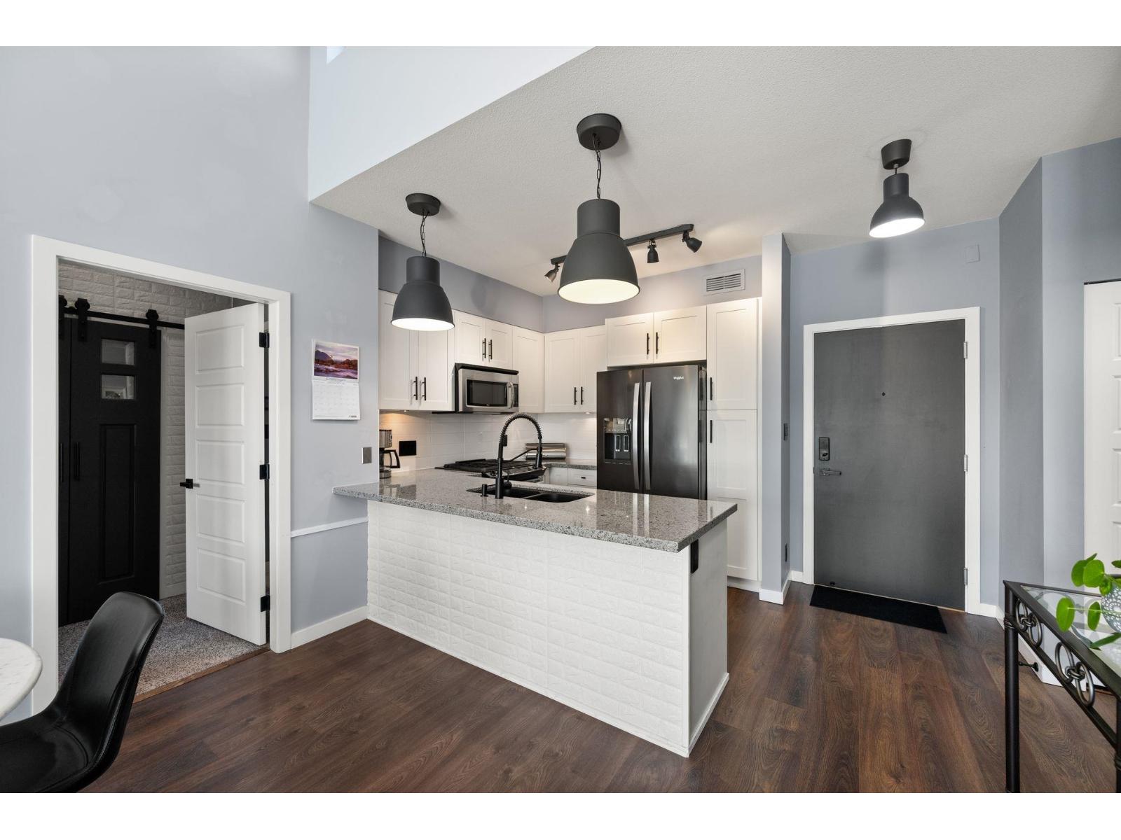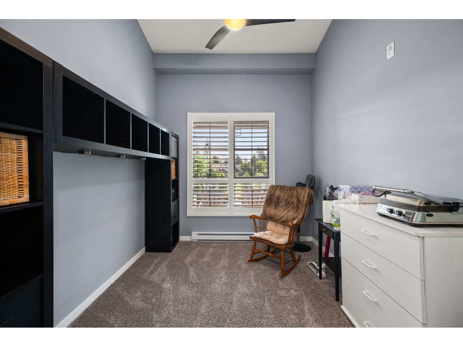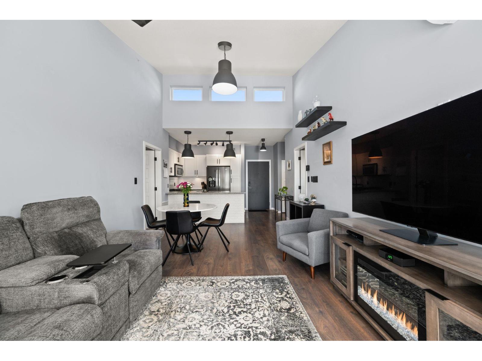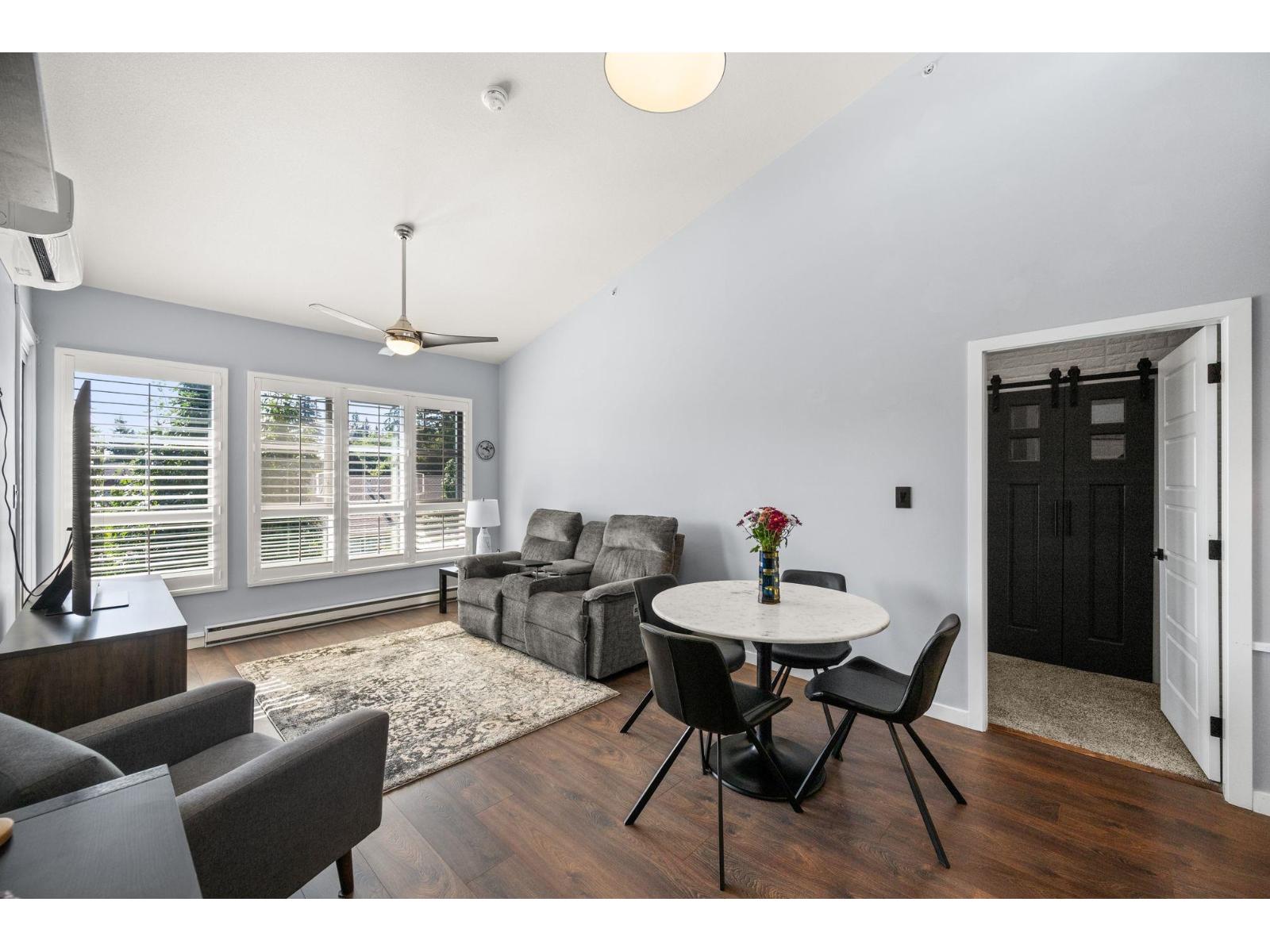 $411 MonthlyTOP FLOOR, VAULTED CEILINGS! Beautifully bright and sunny south exposure! Downsizer alert! This is the unit that you've been waiting for! Downsize in safety and comfort in this 2BDRM 2 BATH condo, with one occupant needing to be 55+ in age. Up to 13'ft vaulted ceilings! White kitchen cabinetry, S/S appliance package incl gas stove, granite counters. Heated ensuite tile floor in the master bath. 2nd Bdrm with cheater ensuite/main bath. Updated laminate floors and newer carpet in bdrm's. California shutters. Updated paint and lighting throughout. BONUS storage locker on the same floor and 2 side by side parking stalls. Secure bike storage, fitness room and clubhouse included!NEW Heatpump offering A/C! (id:52823)