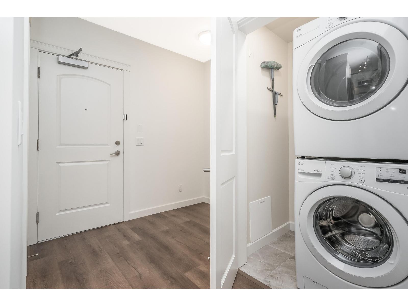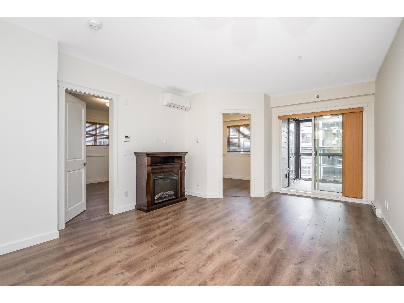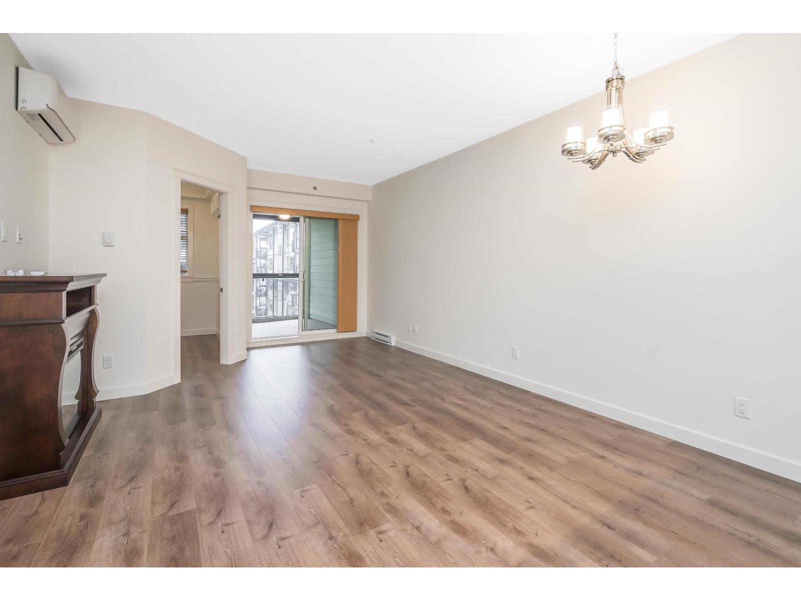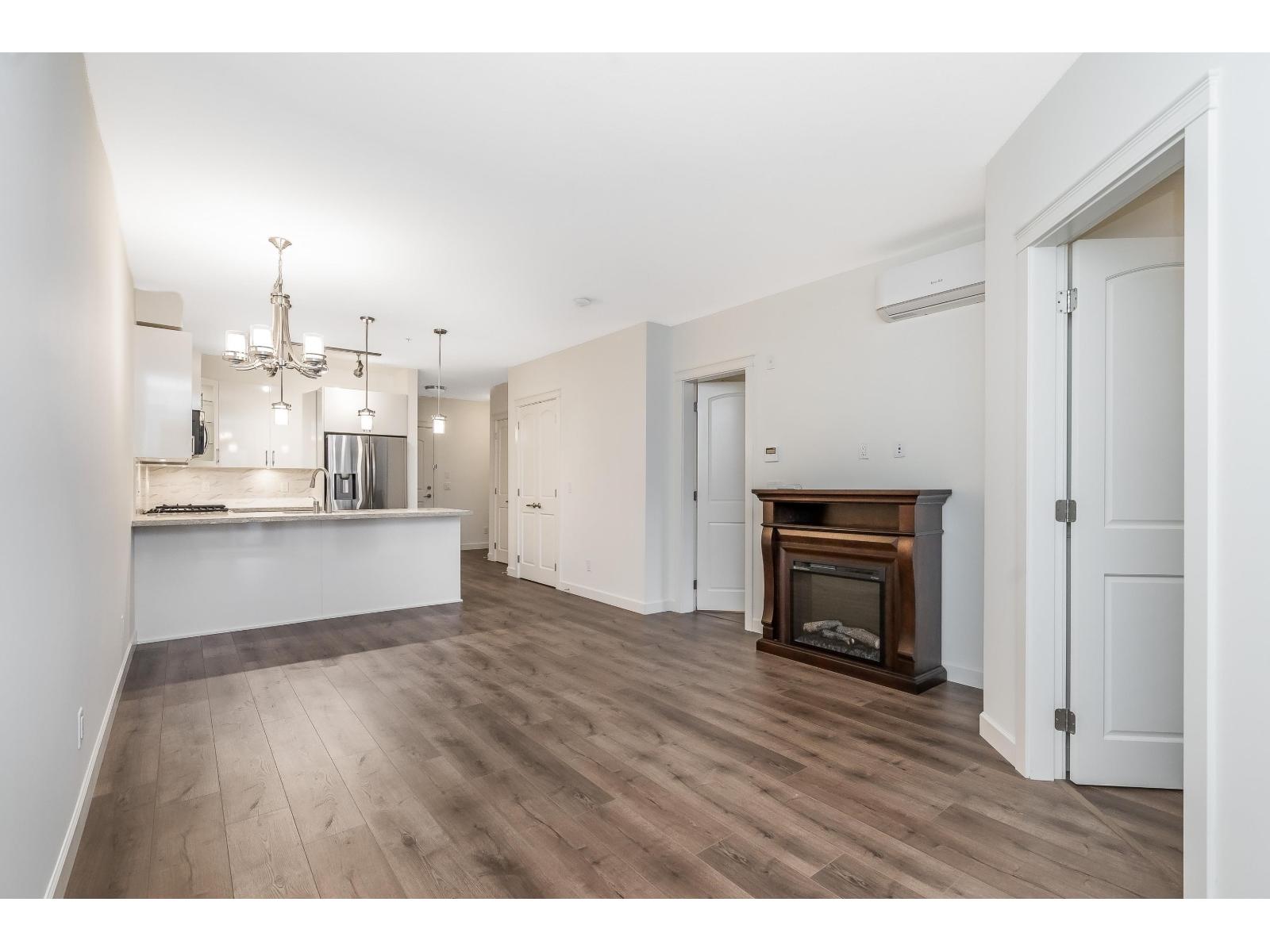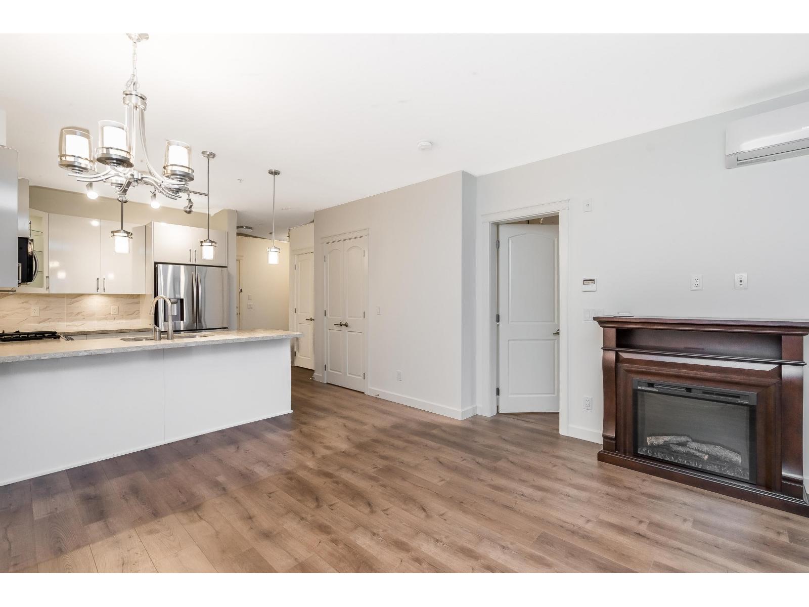 This bright 2-bedroom + den, 2-bathroom home offers over 1,000 sq. ft. of open-concept living with 9' ceilings, large windows, and engineered hardwood floors. The gourmet kitchen features granite counters, stainless steel appliances, and a central island. Enjoy a spacious living/dining area with fireplace and access to a covered balcony. The primary suite includes a walk-in closet and ensuite with heated floors, double sinks, glass shower, and soaker tub. A second bedroom, versatile den, full bathroom, air conditioning, and in-suite laundry add comfort. Rent includes 2 secure parking stalls and a large storage locker. Yorkson Creek provides a fitness centre, amenity room, and landscaped grounds. Steps to Willoughby Town Centre, schools, - Yorkson Creek Middle & R.E. Mountain Secondary! (id:52823)
