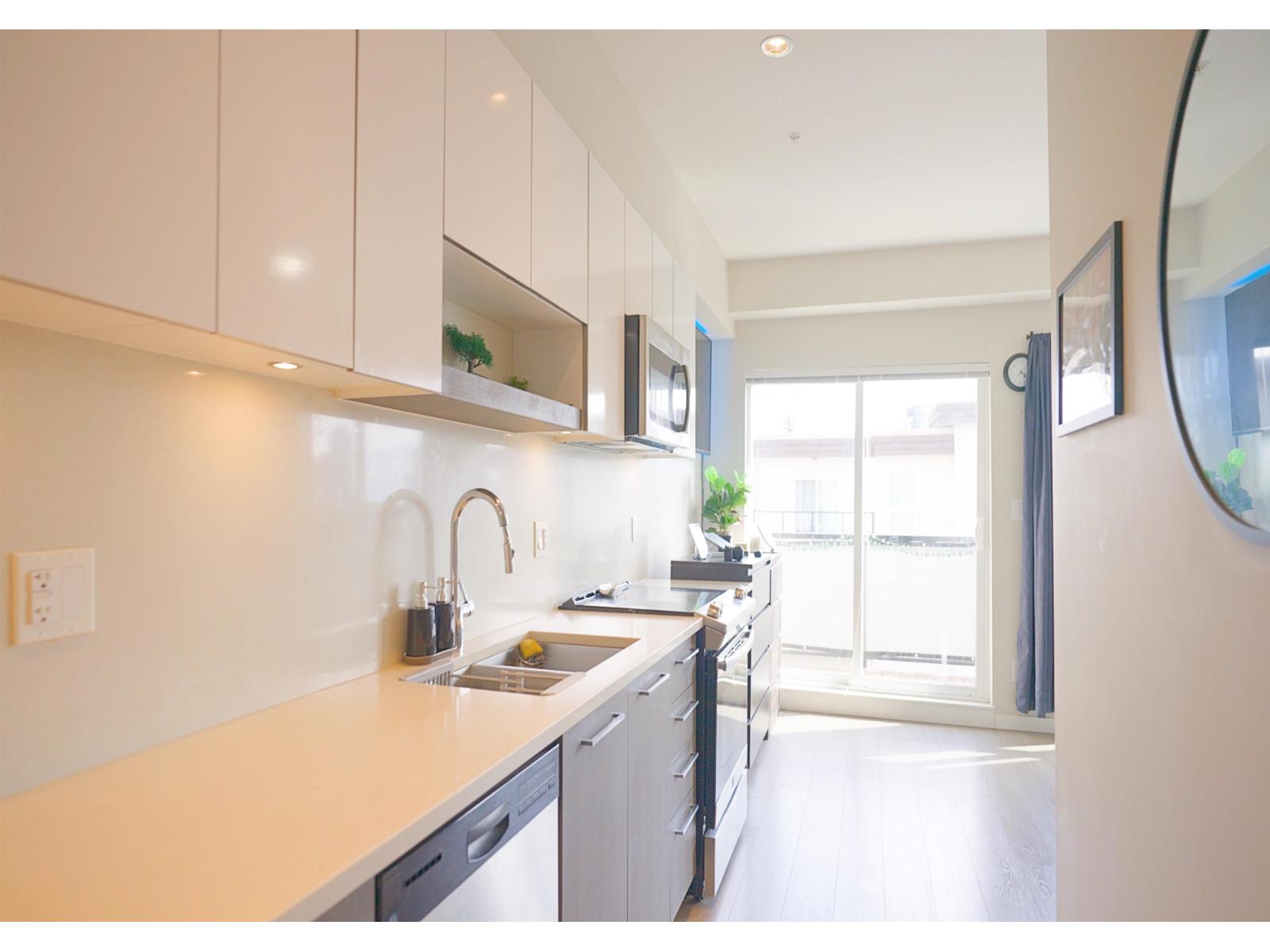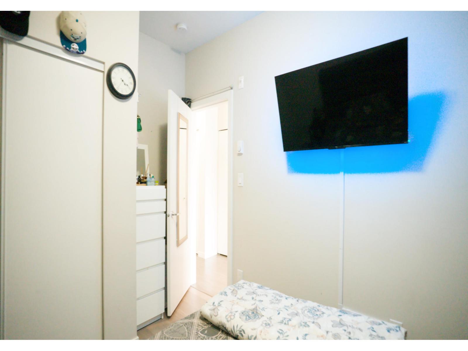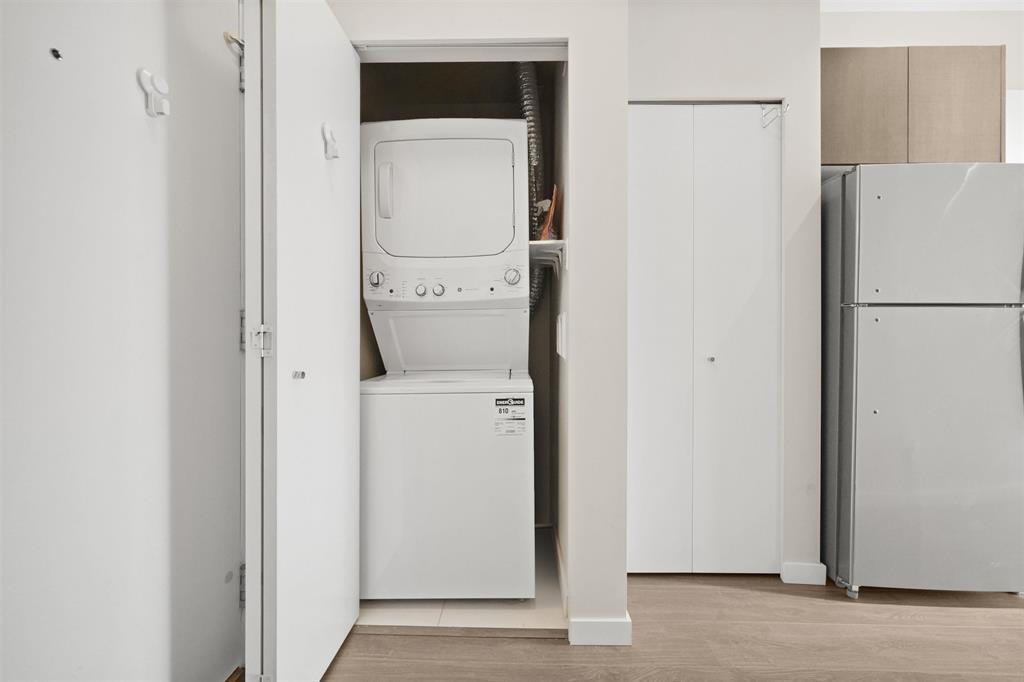 $292 MonthlyThis immaculate 1-bedroom, 1-bathroom, 1-parking, 1-locker penthouse corner unit features modern laminate flooring, 9-ft ceilings, quartz countertops, stainless steel appliances, and a full-sized washer/dryer. Enjoy a south-facing balcony with sunlight all day, conveniently positioned with the stairwell on one side of the unit and the electric room on the other-ideal for privacy and enjoying music without disturbing neighbors. The unit comes with a low $292 strata fee and access to top amenities including a gym (no extra fee required) and a rooftop patio located just in front of the unit with BBQs, a fire table, and stunning city views. All this is just minutes from SkyTrain and local shops, making it a perfectly located, move-in ready home. Locker #29 parking #28 (id:52823)