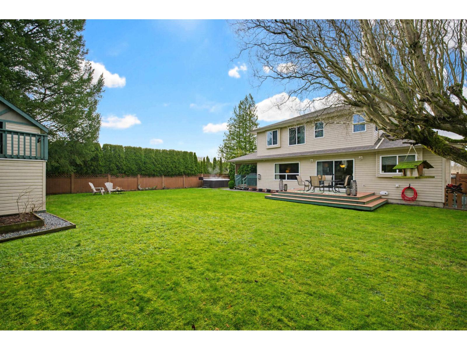 Beautiful 2-storey Murrayville home on a private ¼-acre lot w/ RV parking. Main floor features a welcoming living room w/ gas fireplace & french door access to a flex room w/ cheater door access to a full 3-pc bathroom; possible 6th bedroom set-up for extended family or guests! Bright kitchen w/ abundant maple cabinetry, generous counter space, pantry, & large eating area opening to a rear deck & huge fenced yard w/ mature trees. Spacious family room w/ gas fireplace, covered corner deck, & hot tub. Main floor bedroom/den. Upstairs offers a primary suite with 4-pc ensuite, large bedroom/games room, & 2 additional bedrooms. Newer roof & furnace! Crawlspace storage, 2-level shed, & easy access for a future shop. Great family neighbourhood close to schools, parks, shopping, & recreation. (id:52823)