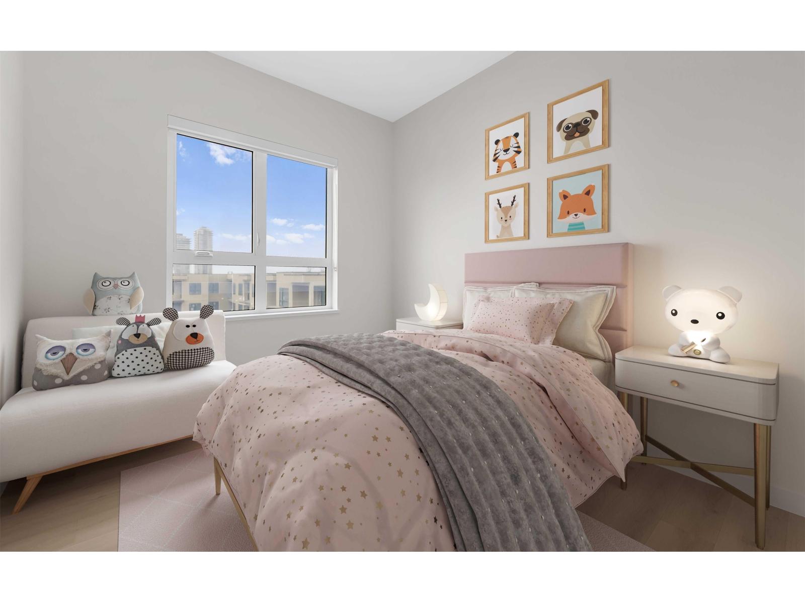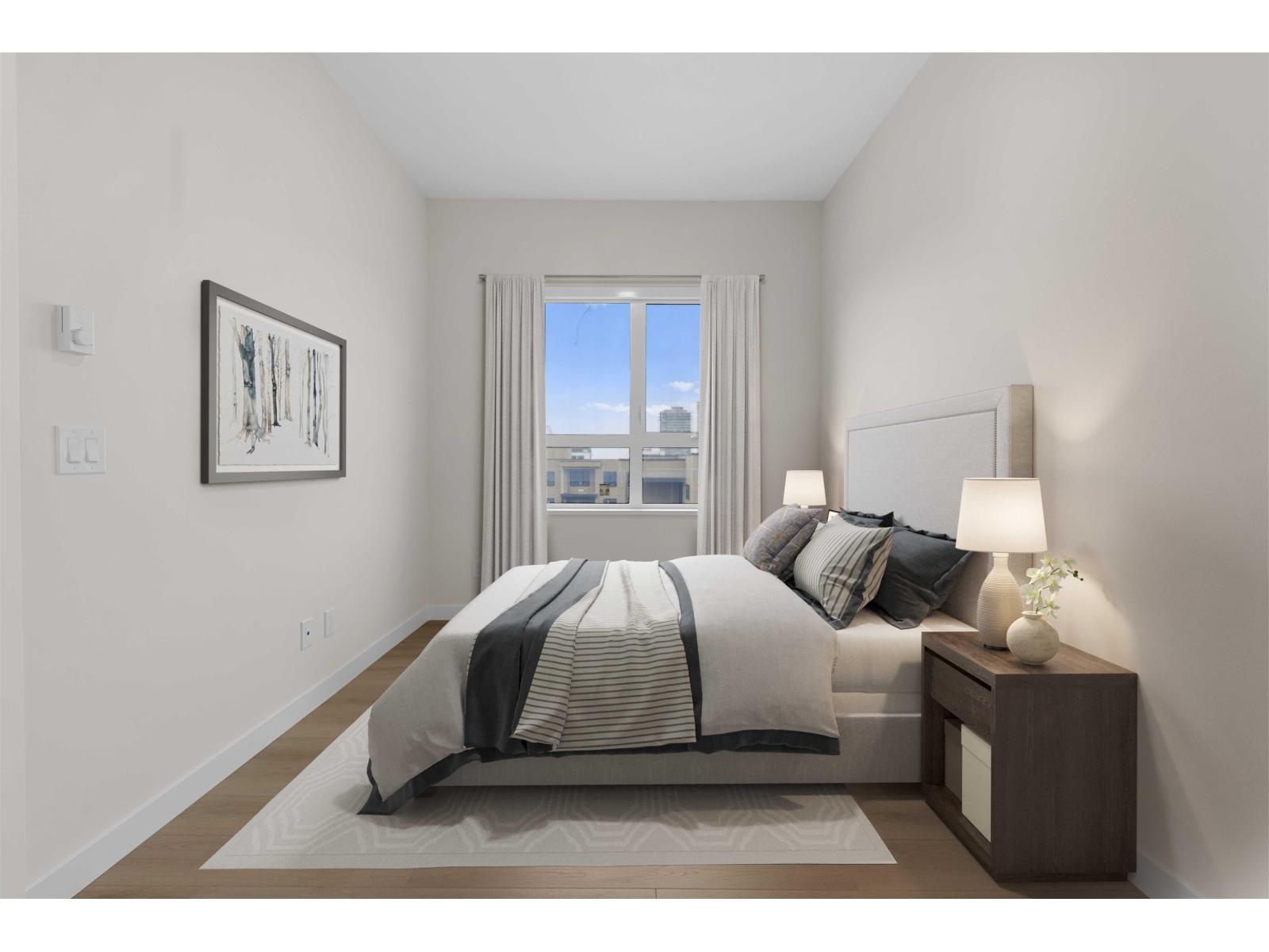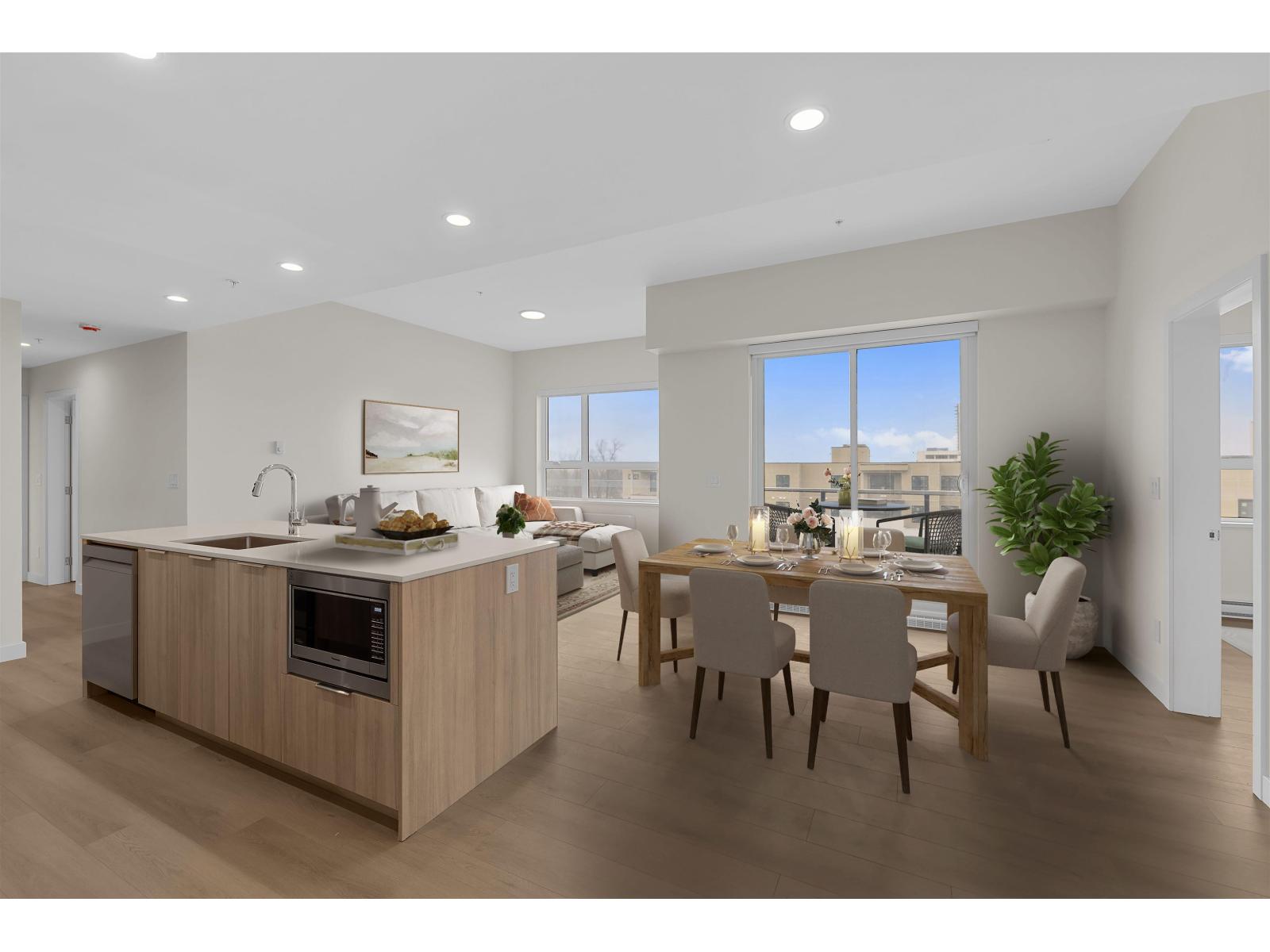 Welcome to VESTA BUILT South Village Condos at Latimer Heights! This stylish & functional floorplan boasts 9"ceilings, a SPACIOUS living & dining room with expansive windows for loads of natural light. Entertain in your modern kitchen with ++ storage, generous sized island, soft-close cabinetry, under-cabinet lighting, stainless steel appliances inc. 5-burner gas cooktop, sleek quartz counters & modern backsplash. Primary bedroom has a walk-in closet & a 2-sink vanity ensuite. Enjoy your CORNER, Northeast facing balcony where you will see mountain peaks over morning coffee. Contemporary 'sand' color scheme, AC, EV capable parking & pet friendly! Located close to NEW Josette Dundurand Elementary, Langley Events Centre, Carvolth Bus Exchange, 200 Street transit & easy access to Hwy 1. (id:52823)
