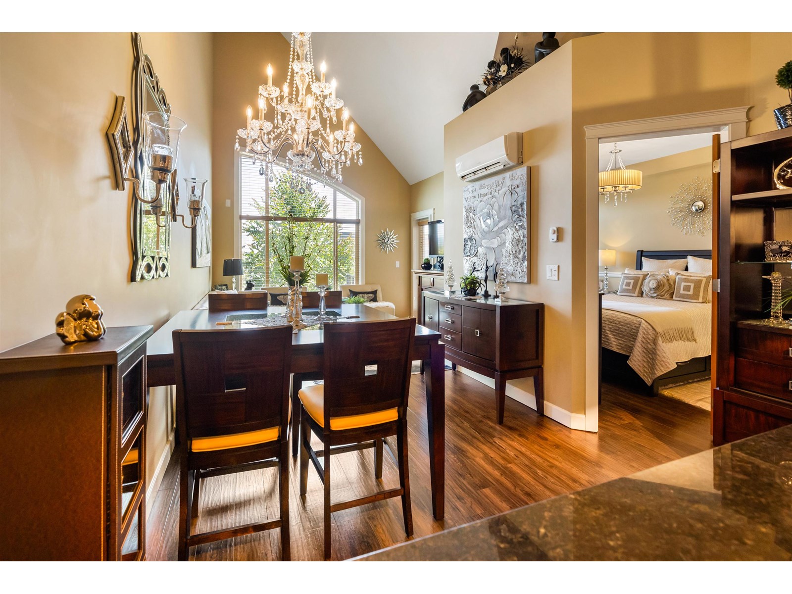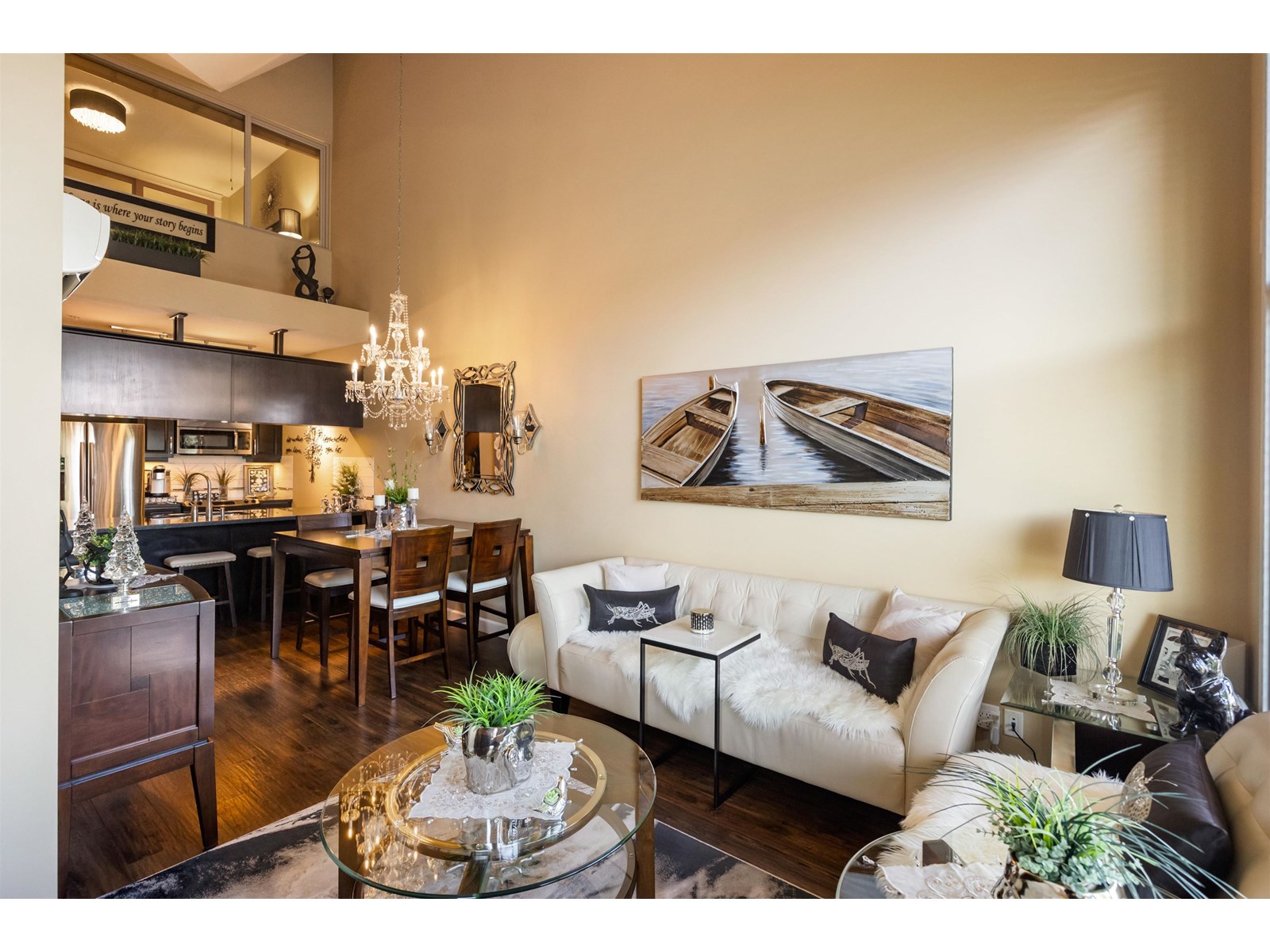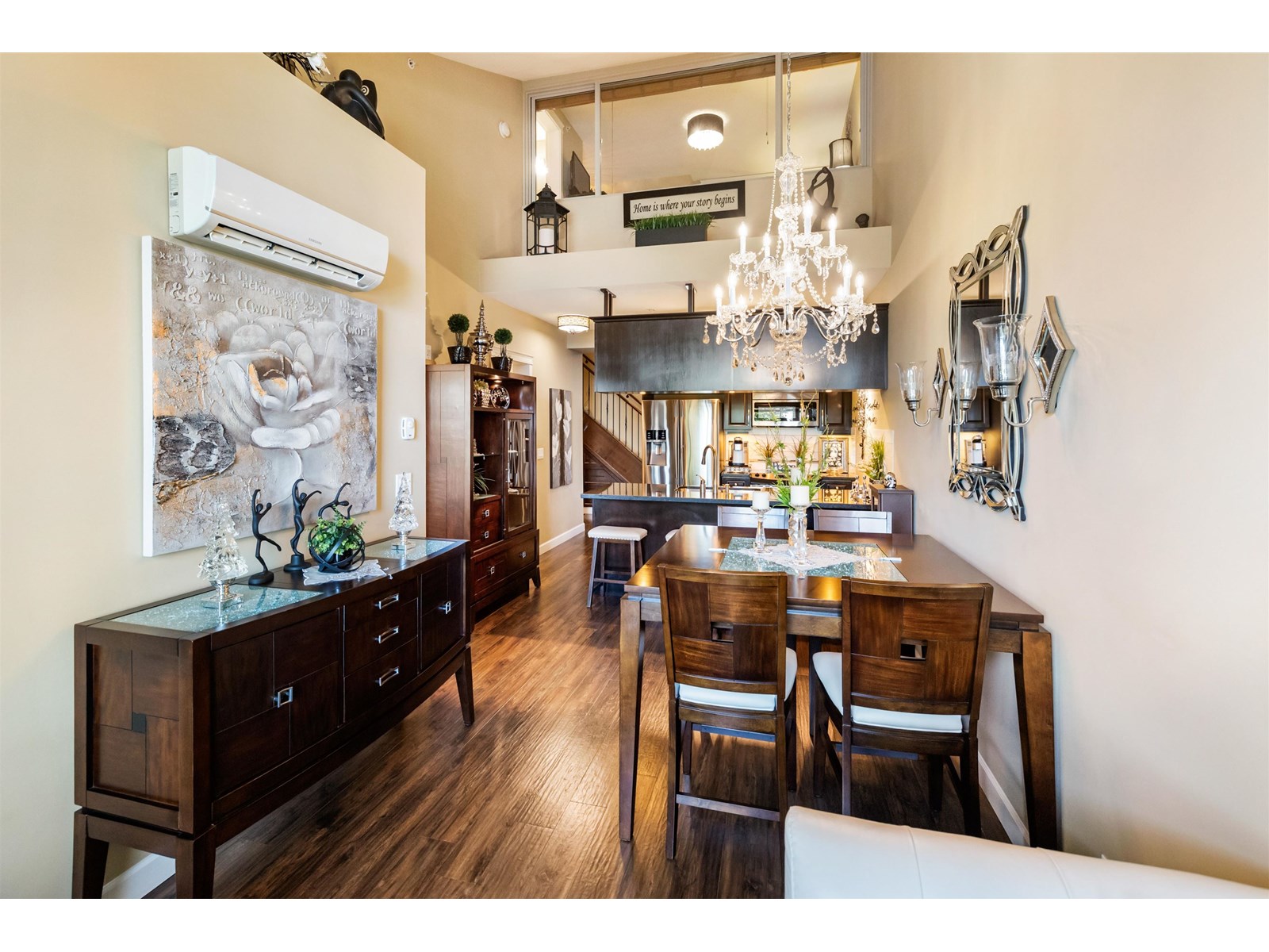 $458.55 MonthlyWALNUT RIDGE AT YORKSON CREEK - RARE PENTHOUSE LOFT UNIT WITH VAULTED CEILINGS AND TWO PRIMARY BEDROOMS. This immaculate unit stands out with Quadra quality interiors, featuring acoustic wood-grained plank laminate, electric fireplace, solid-core fir doors & closets with built-in shelves. Kitchen w/ ample cupboard space, granite tops, under-mount sink and S/S appliances. Heated tile bathroom floors, granite vanity tops and fog-free mirrors. Enjoy your east facing balcony and A/C is included. 2 primary suites to chose from, one on the main floor or one upstairs for privacy. Separate den plus laundry with room, lots of storage! No neighbours above you with this top floor unit. Amazing location - walk to schools, parks & shopping. 2 parking stalls right next to each other. Don't miss it! (id:52823)