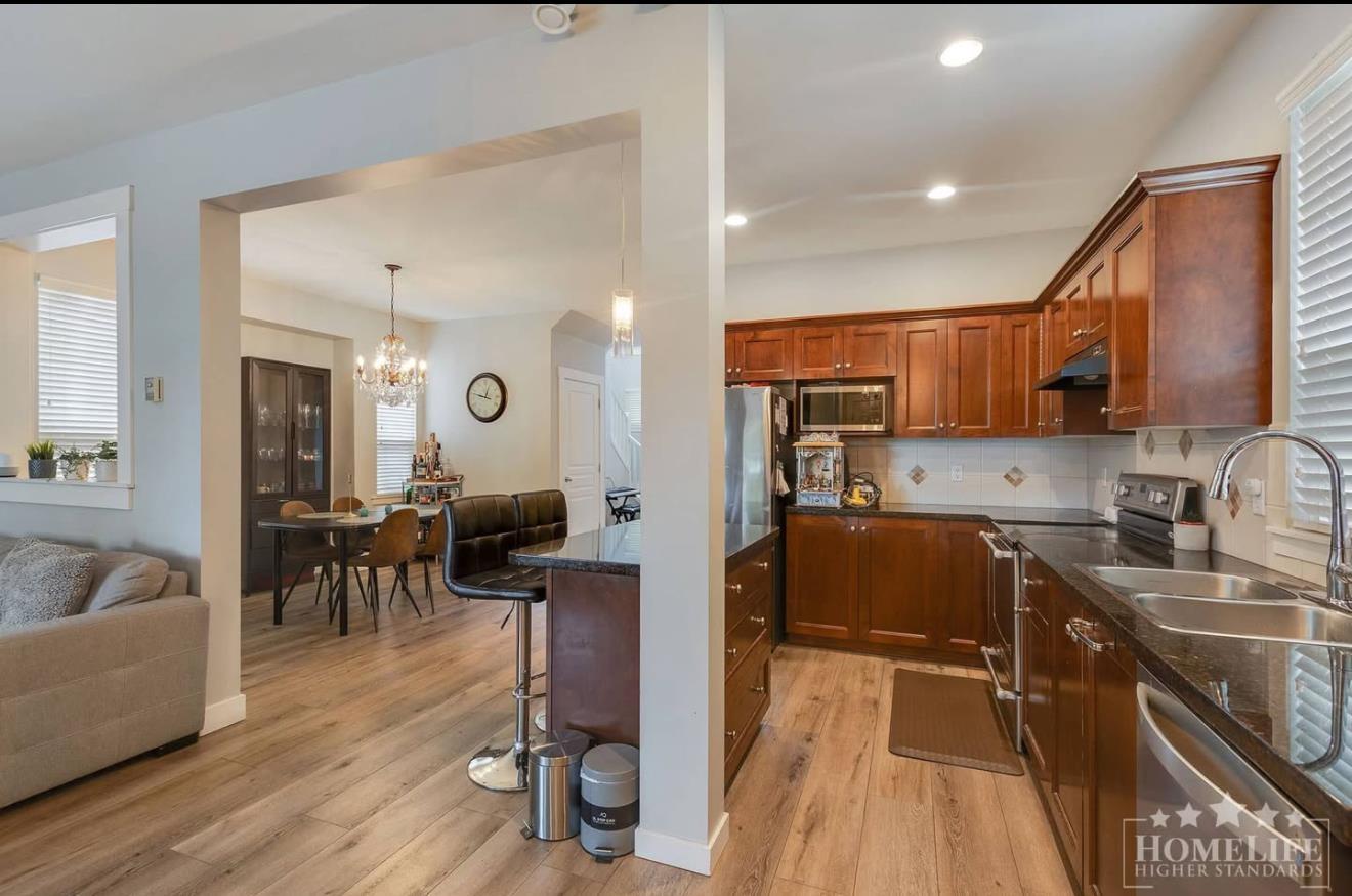 Amazing location! Just two blocks from the new SkyTrain station and walking distance to shops, restaurants, banks, and groceries. This bright, centrally air-conditioned home features an open kitchen with centre island, cozy fireplace, and easy access to the backyard and garage. Upstairs offers 3 spacious bedrooms with a large walk-in closet and laundry is presently rented for $3100. The 2-bedroom basement suite with separate entry is a great mortgage helper presently rented for $1500. Close to top schools and parks-ideal for families or investors. OPEN HOUSE: NOV 29 & 30: 2-4PM (id:52823)
