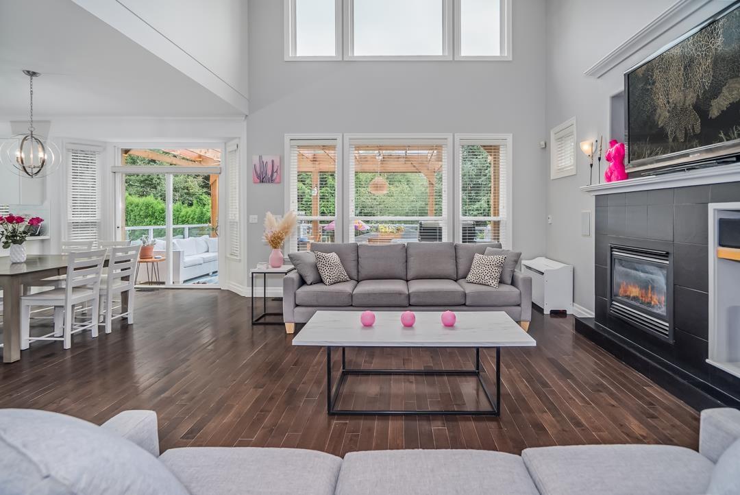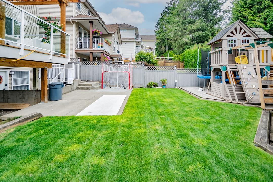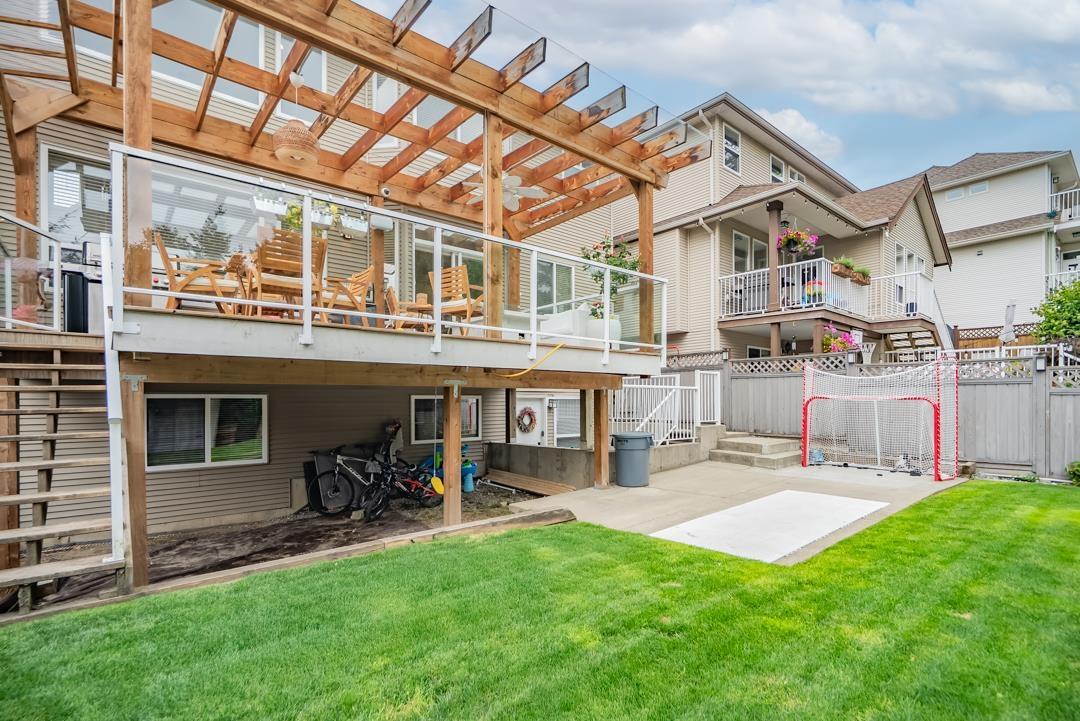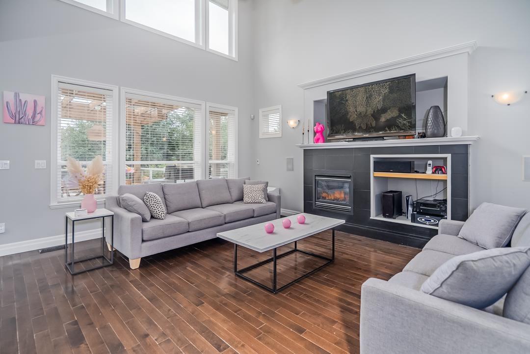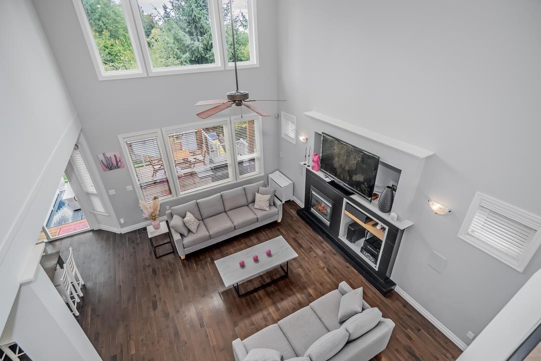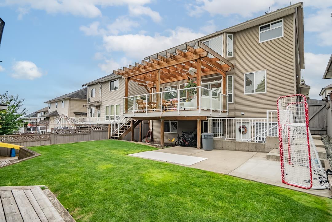 Welcome to Routley Wynd & this beautiful 2 storey w/basement home. Offering over 3200 s/f of living space the main floor Great room boasts soaring 18' ceilings with loads of windows to allow maximum natural light. Grand kitchen features timeless white cabinetry, Quartz counters & S/S appliances. Walk out to your covered Balcony & sit by the gas powered fireplace while taking in the Valley views! Fully fenced backyard offers irrigation ,a fair sized storage shed & backs onto a GREENBELT for the ultimate privacy! Upstairs offer 3 generously sized rooms including a Large Primary that has stunning views of the Valley & Mount Baker. 5 piece ensuite bathroom. Downstairs offers a 1 or 2 bedroom mortgage helper. Bonus A/C & 200 amp service. Near to shopping, restaurants, parks, schools & transit. (id:52823)