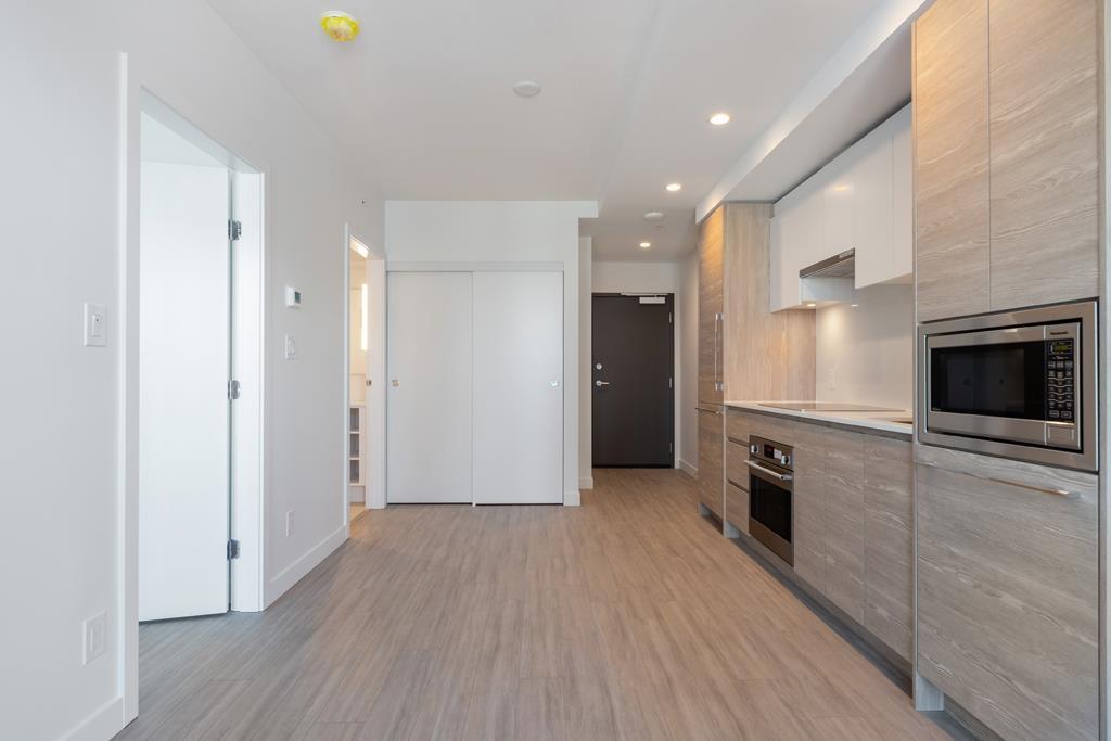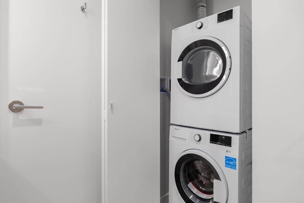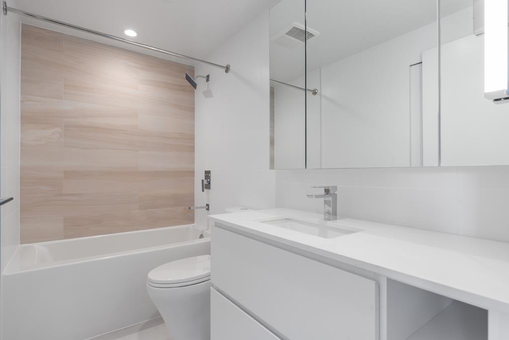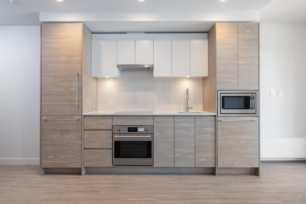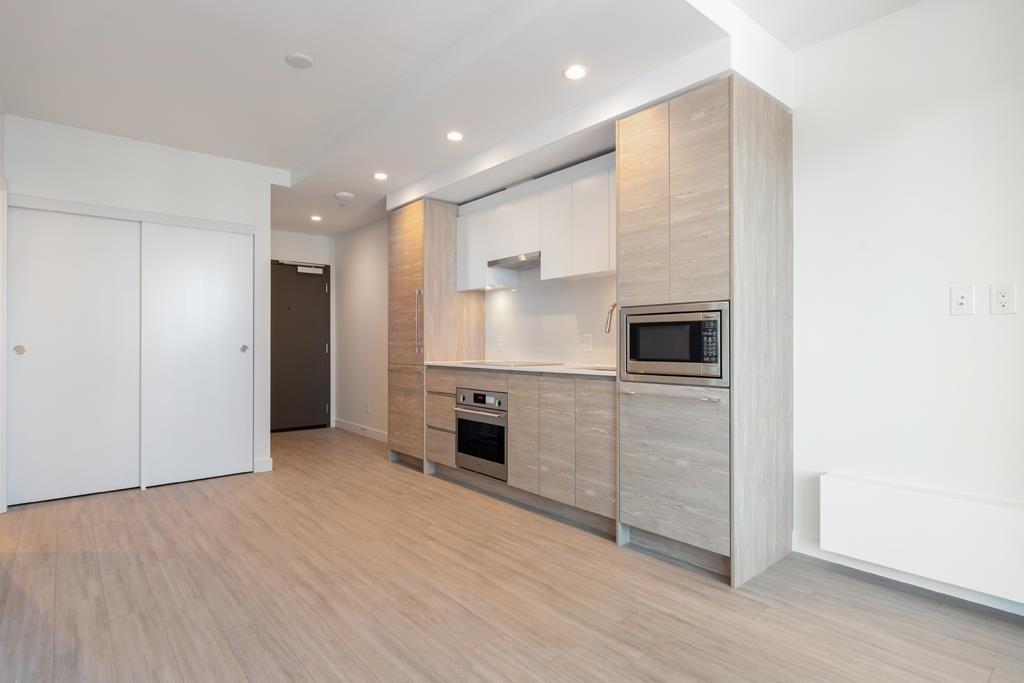 This HUB Two 443sf 1 bedroom condo has a huge 85sf balcony spanning two-thirds the width of the condo, which can be accessed from both the living room and the bedroom. Through the foyer, you enter directly into the open living-dining room with laminate floors, a coat closet, and sleek gallery kitchen. The kitchen features quartz countertops, porcelain backsplash, Bosch integrated fridge, Blomberg integrated dishwasher, Fulgor oven and Bosch induction cooktop. The 4 pcs bathroom comes with large format porcelain floor tiles, quartz countertop, soaker tub w/ large-format porcelain apron, frameless glass shower enclosure, and dual-flush toilet. Rent includes 1 parking stall. (id:52823)