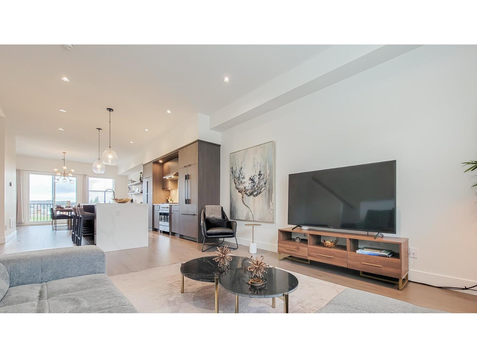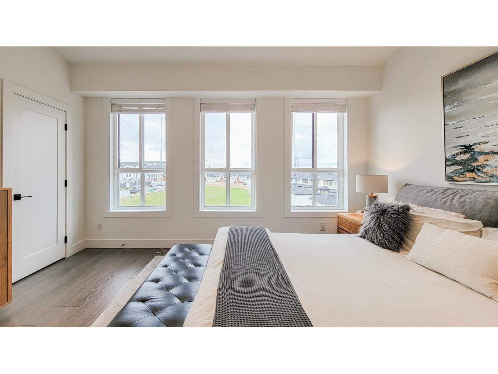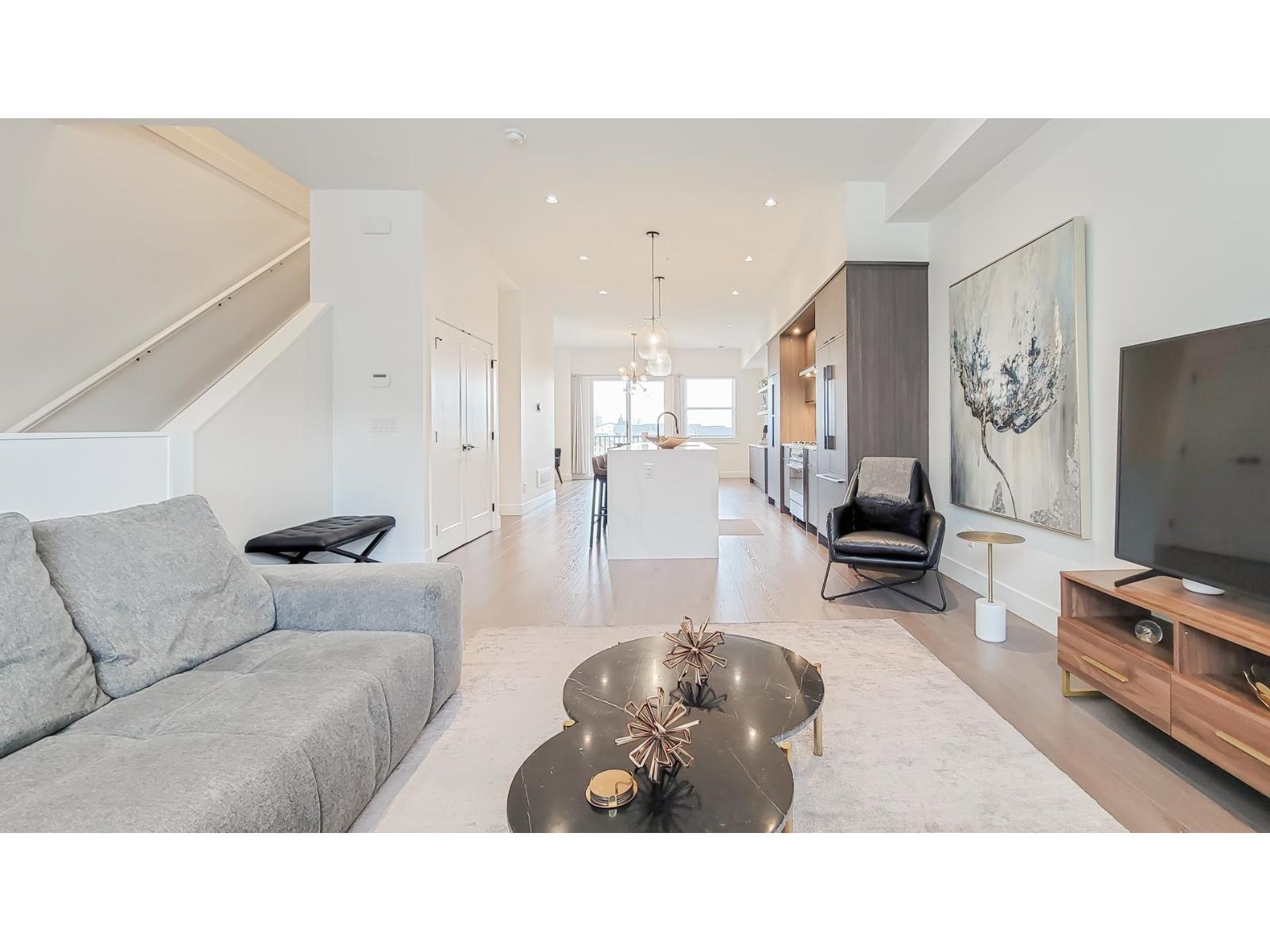 Welcome to this stunning open concept Rowhome with 10ft ceiling on main. This Luxury 2,560 sq.ft. is a former show home designed by Sarah Gallop Design. Offering 4-5 bedroom with premium upgrades, designer furniture, and accessories which the owner is including in the purchase, Gourmet kitchen featuring integrated Fisher & Paykel appliances, a gas range, dual wine coolers, built-in buffet, and a custom credenza. Spacious deck with undisturbed views & BBQ hookup, perfect for entertaining. The Master bedroom with 5-piece spa-inspired ensuite, chandelier, walk-in closets. Lower Level: Ideal for guests or extended family, featuring a bedroom, full bath, wet bar, fridge, and wine rack. Double side by side garage with epoxy finishes, Security & Vac Sys, close to shopping, schools and Hwy 1. (id:52823)