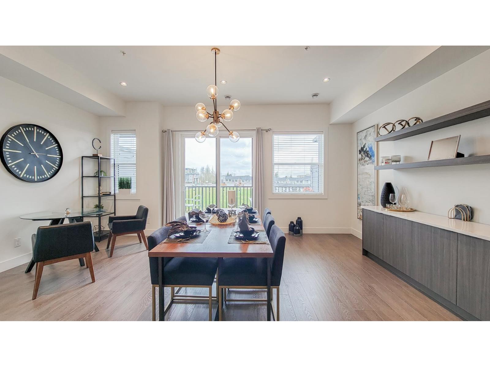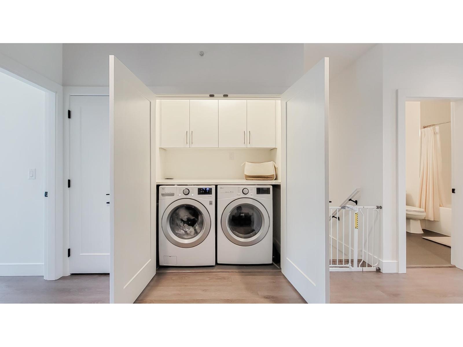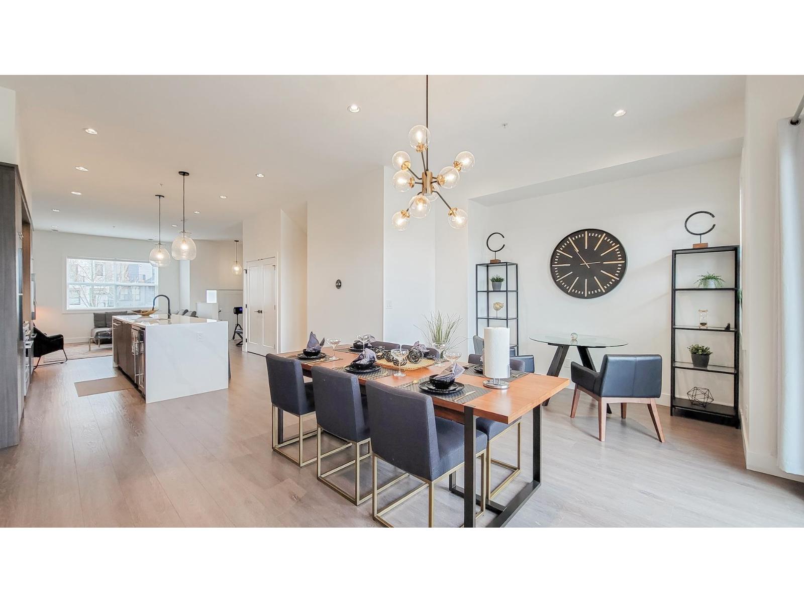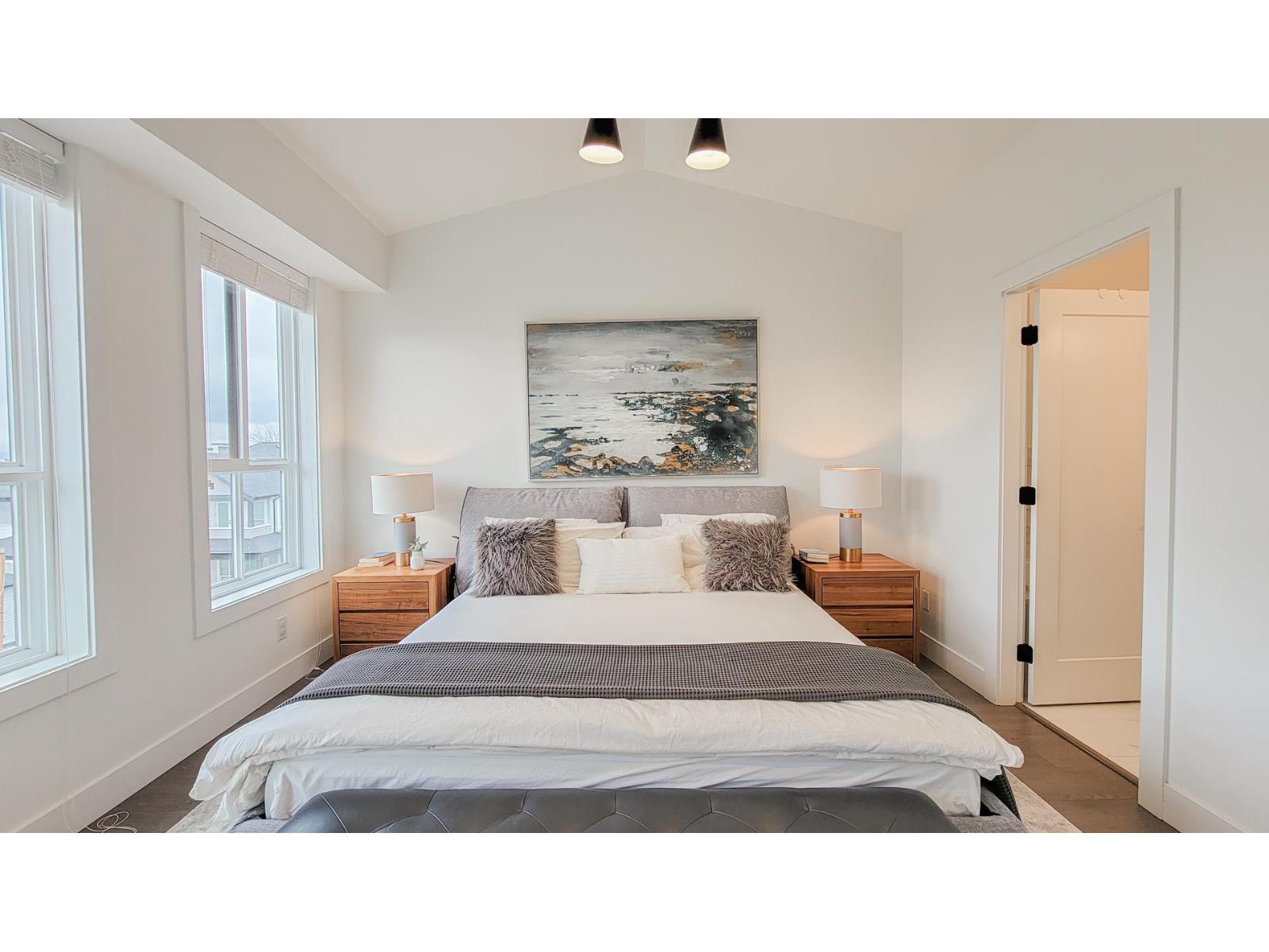 Welcome to this stunning open concept Rowhome with 10ft ceiling on main. This Luxury 2,560 sq.ft. is a former show home designed by Sarah Gallop Design. Offering 4-5 bedroom with premium upgrades, designer furniture, and accessories which the owner is including in the purchase, Gourmet kitchen featuring integrated Fisher & Paykel appliances, a gas range, dual wine coolers, built-in buffet, and a custom credenza. Spacious deck with undisturbed views & BBQ hookup, perfect for entertaining. The Master bedroom with 5-piece spa-inspired ensuite, chandelier, walk-in closets. Lower Level: Ideal for guests or extended family, featuring a bedroom, full bath, wet bar, fridge, and wine rack. Double side by side garage with epoxy finishes, Security & Vac Sys, close to shopping, schools and Hwy 1. (id:52823)