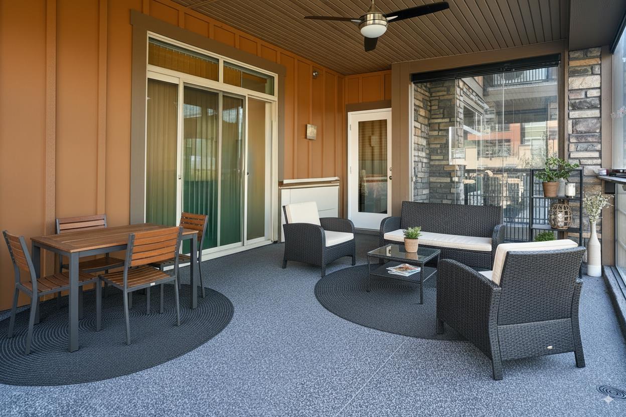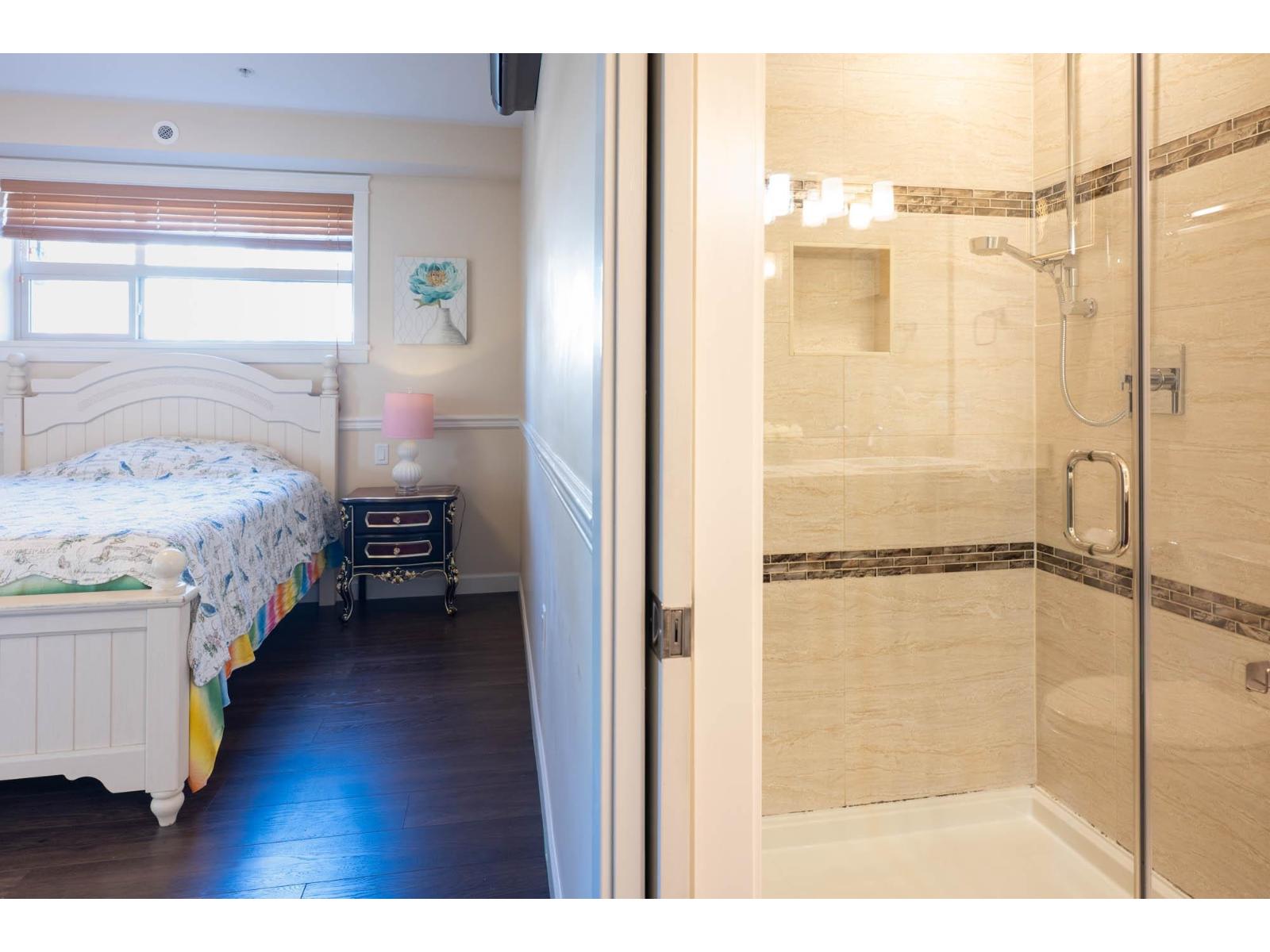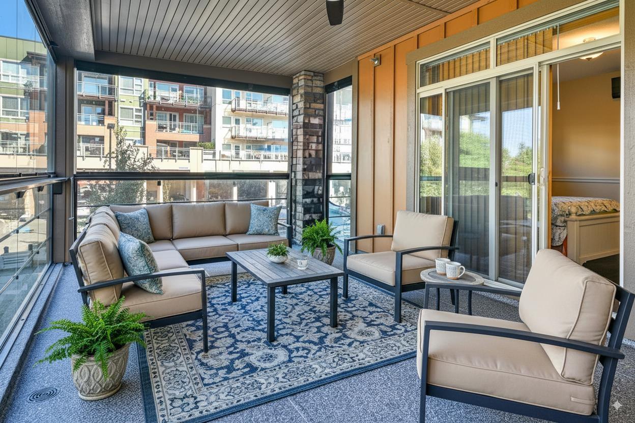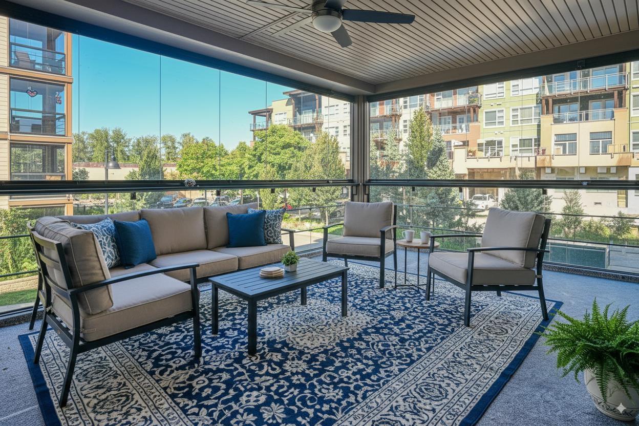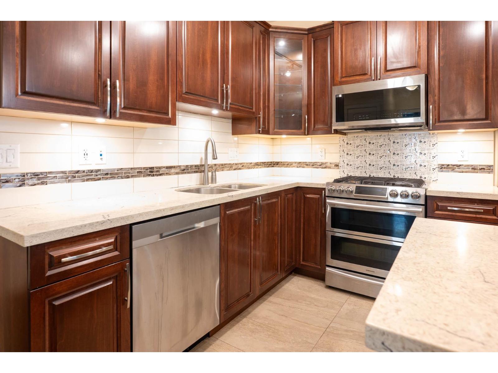 $520 MonthlyDon't miss out on this rare, luxurious 3-bedroom Corner UNIT with 1120 sq ft of living space + solarium at 242 sq ft, This suite has it all, a retractable glass solarium w/gas connection for BBQ & year round entertaining and laminate throughout the unit NO CARPET! Gourmet appliances including gas 5 burner cooktop, double oven, quartz countertops, heated bathroom tile. TWO oversized PARKING spots + concrete-walled storage offer ample space. Natural gas is included in the low monthly strata fees, making this home efficient + affordable. Stay comfortable year-round with A/C throughout and a high-efficiency heat pump system. Conveniently located within walking distance to shopping, bank, pharmacy, restaurants, transit, schools + the skytrain station. (id:52823)